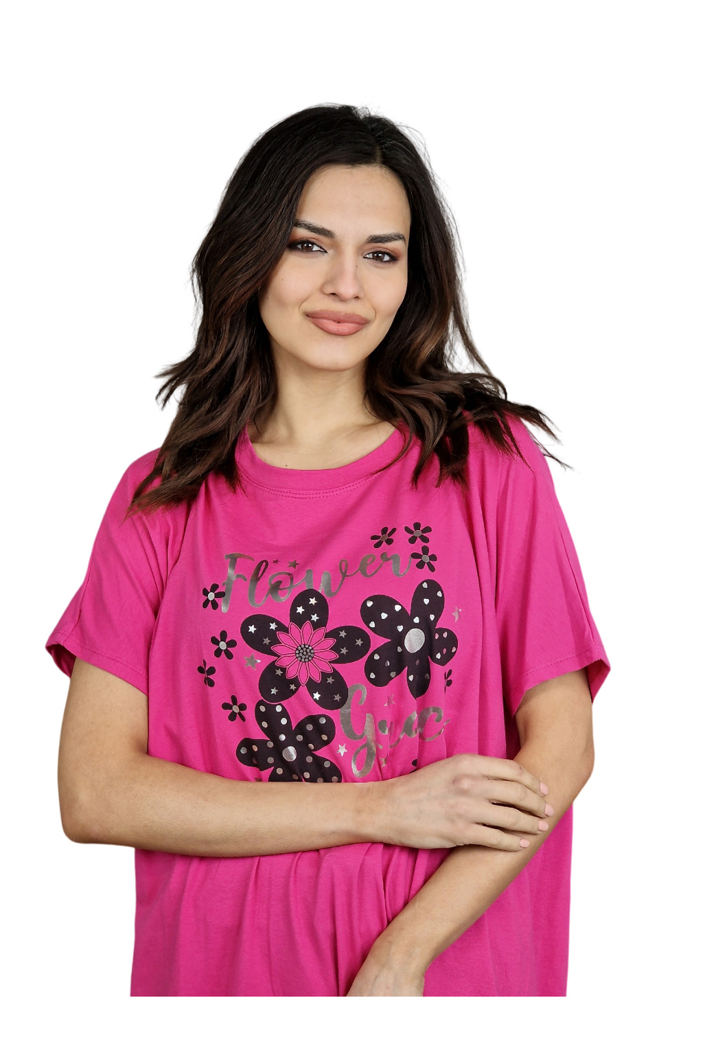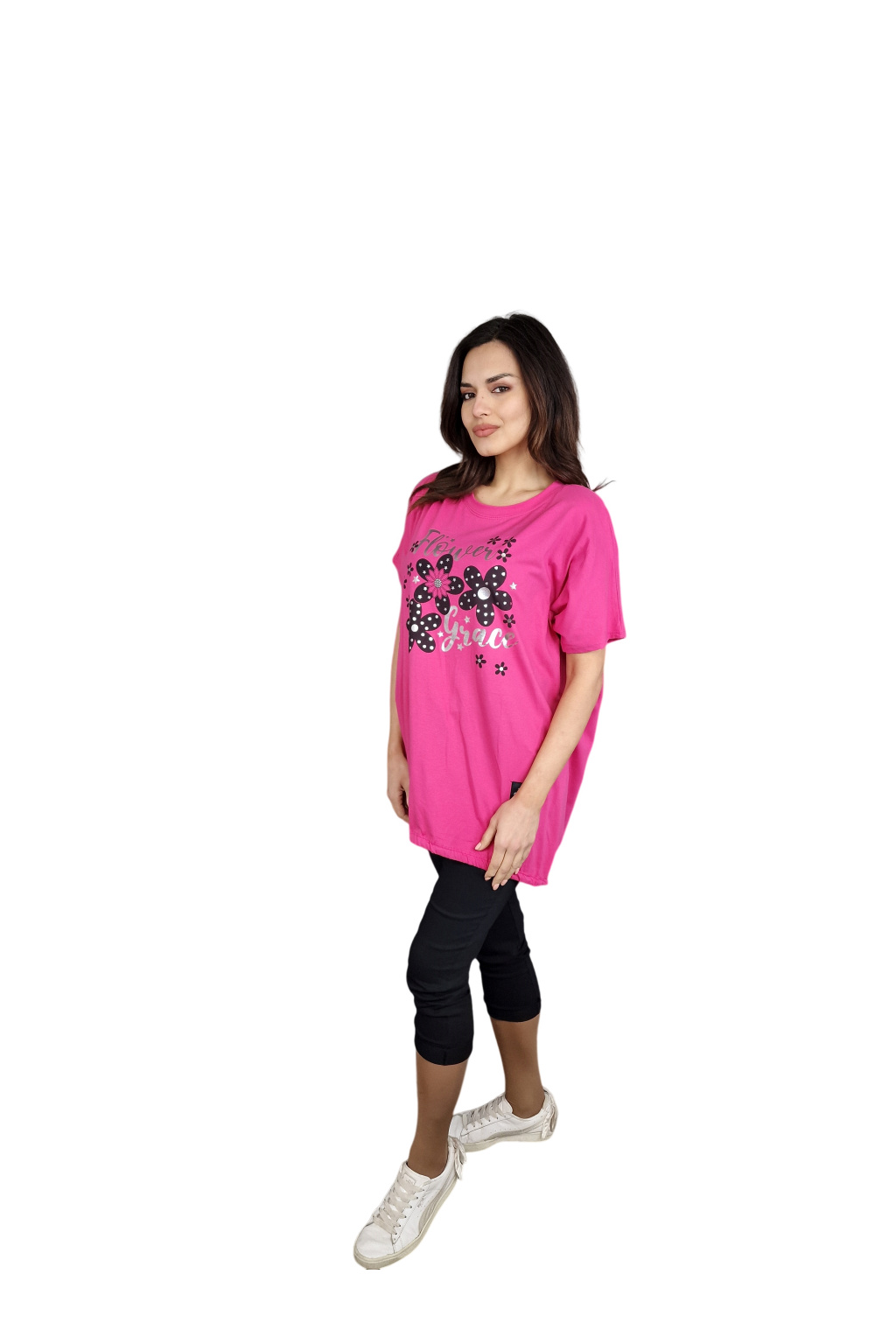 Dámské oversize tričko v mírně střední délce s květinovým potiskem a krátkým rukávem. Vyrobeno z velmi příjemného materiálu, který zaručuje maximální komfort při nošení. Toto tričko je ideální volbou pro každodenní outfit, který chcete ozvláštnit svěžím a hravým květinovým vzorem.