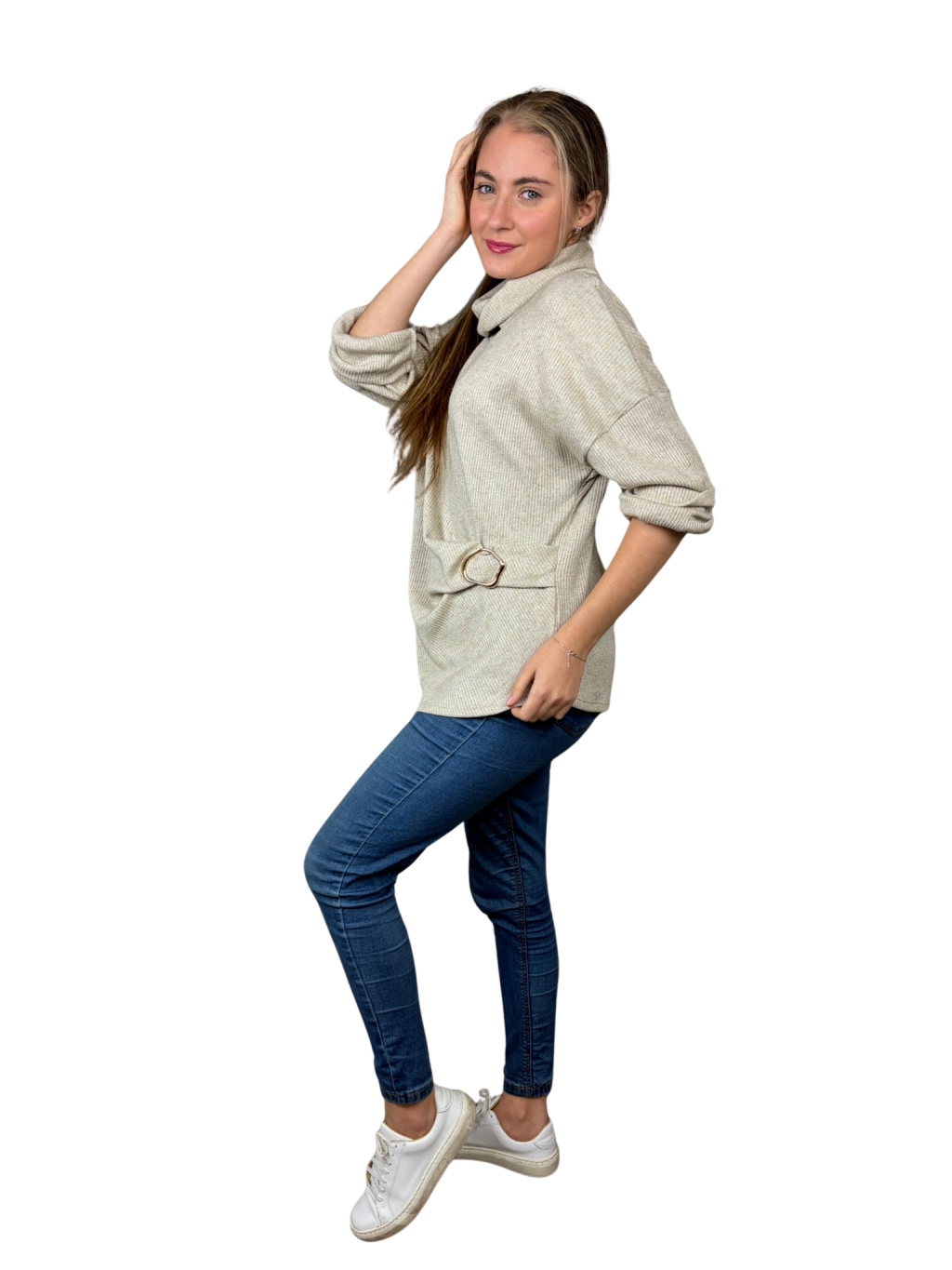 Kovová spona v pase dodává topu originální prvek a jemný nádech elegance.