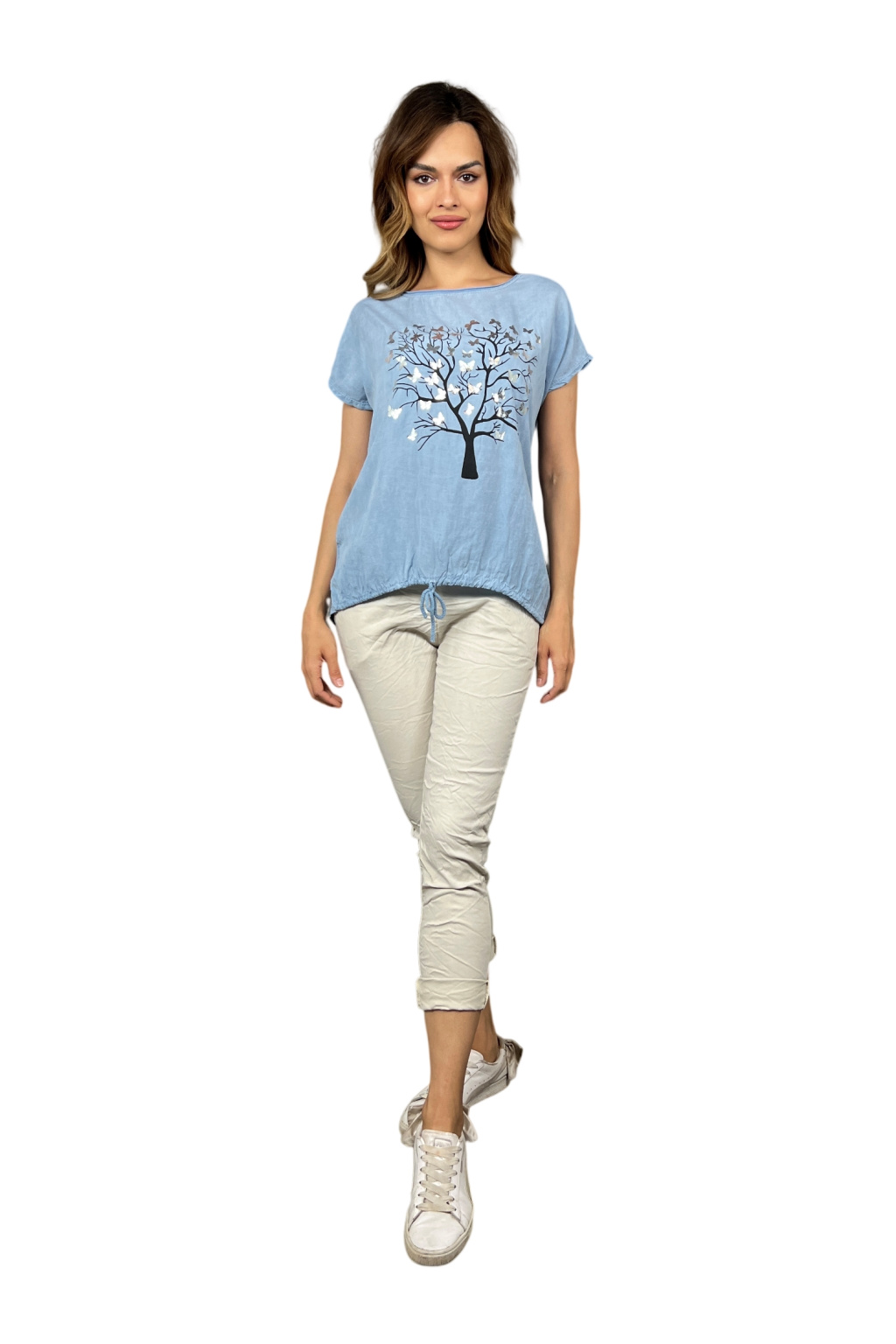 Připravte se na letní atmosféru s naším Top Arletem! Toto tričko s krátkým rukávem je navrženo tak, aby vás udrželo v pohodě a stylové po celou sezónu. Díky živému potisku stromů dodá vašemu šatníku nádech kouzla inspirovaného přírodou. Kulatý výstřih a uvolněný střih zajišťují maximální pohodlí, zatímco přiložená šňůrka vám umožní přizpůsobit si střih podle svých představ. Ať už míříte na pláž, nebo si užíváte piknik v parku, náš top Arlet je dokonalým společníkem pro vaše slunečná dobrodružství.