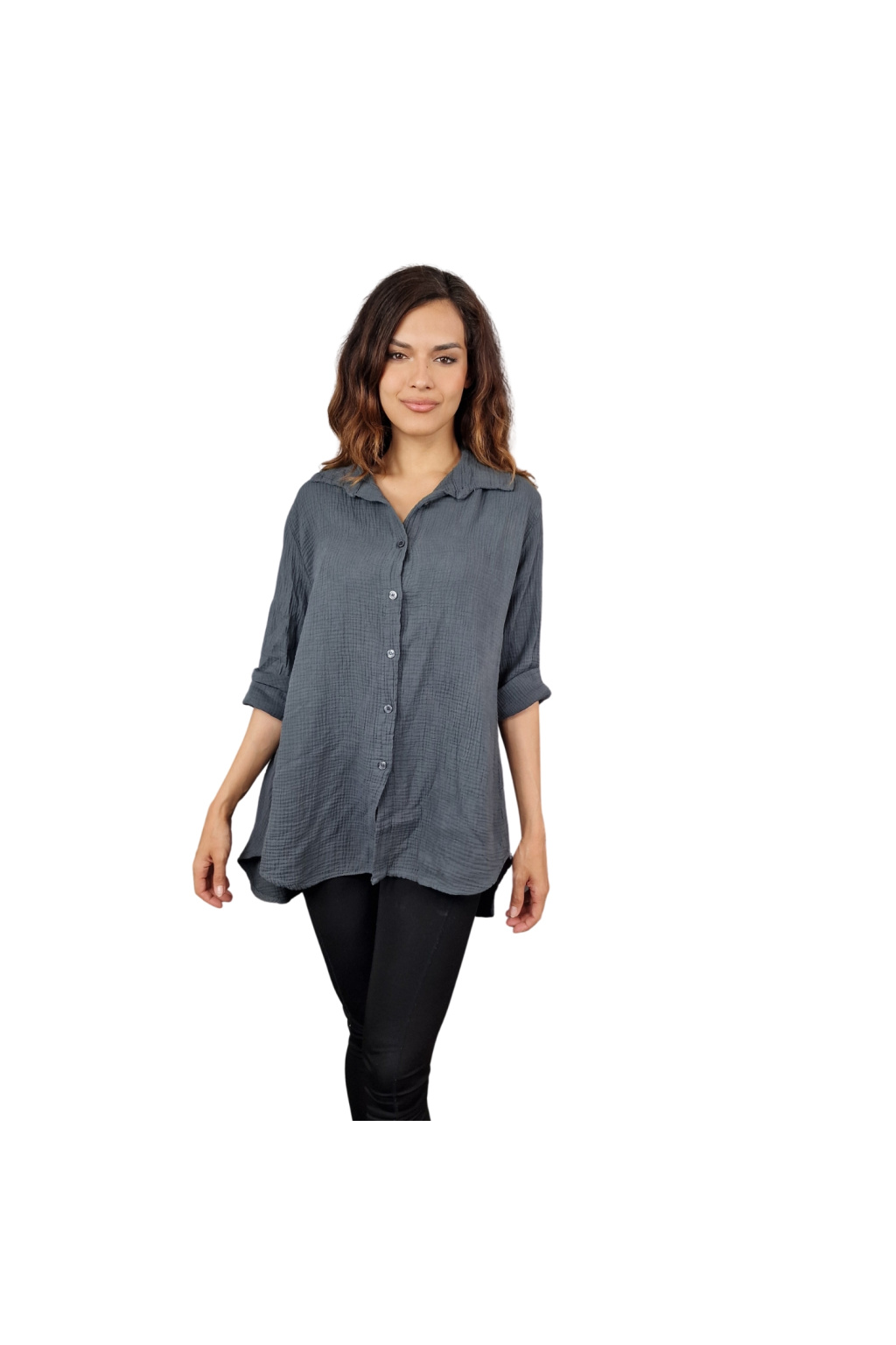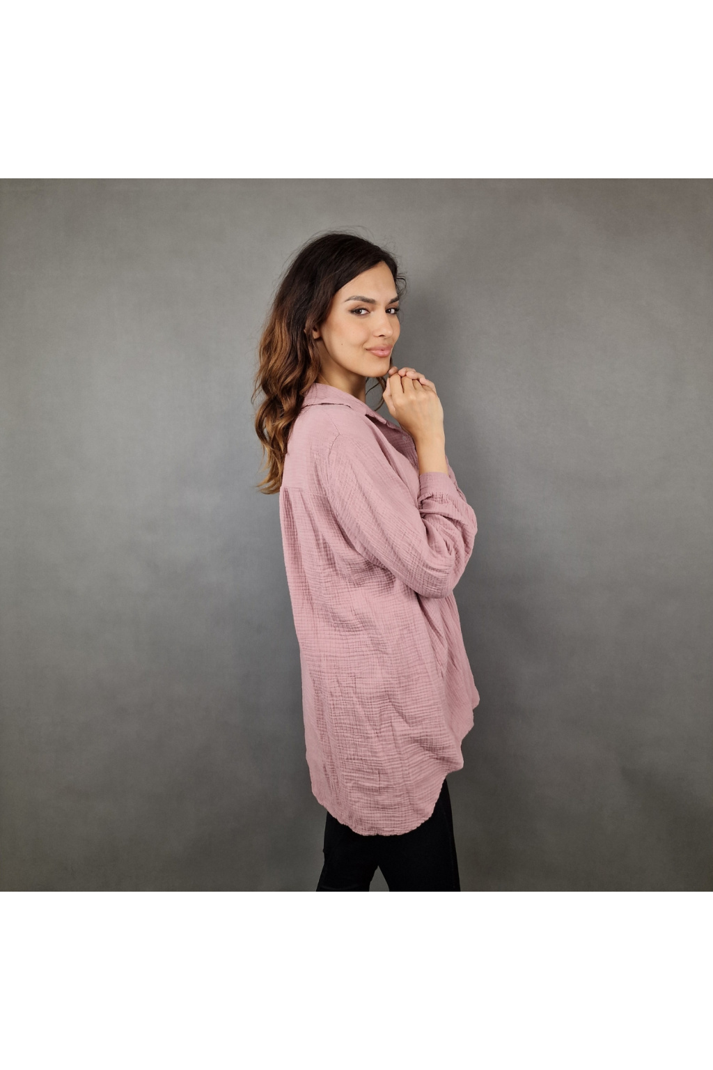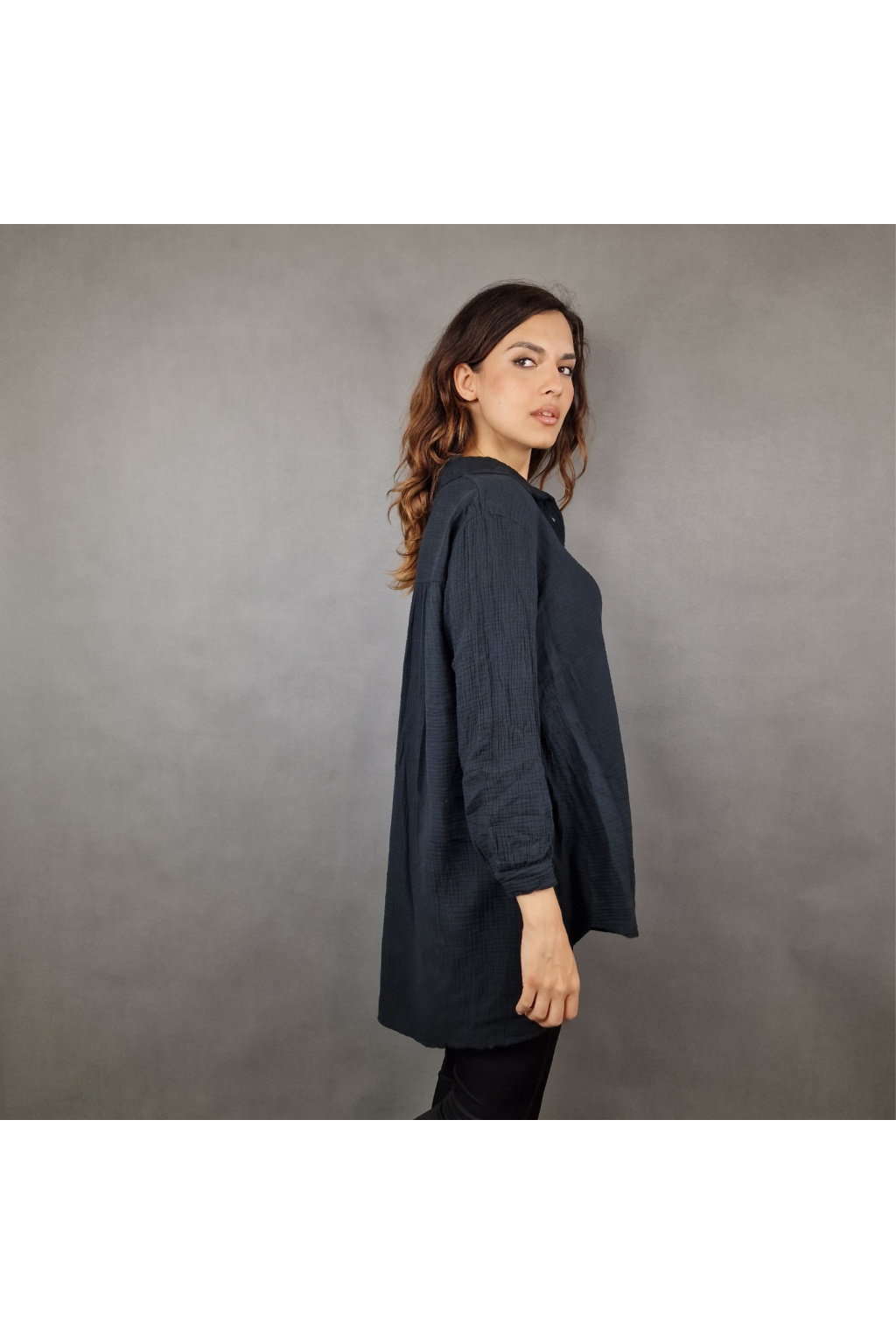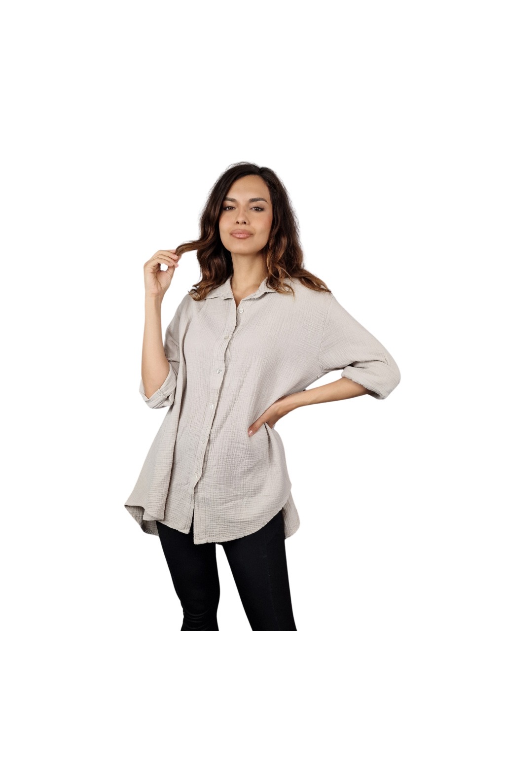 Díky volnému střihu je košile Adalyn univerzálním kouskem vhodným pro různé typy postav. Tento model nabízí klasický límeček a knoflíkový zapínací systém, který dodává košili sofistikovaný vzhled. Delší zadní část vytváří moderní asymetrii, která působí zajímavě a originálně.