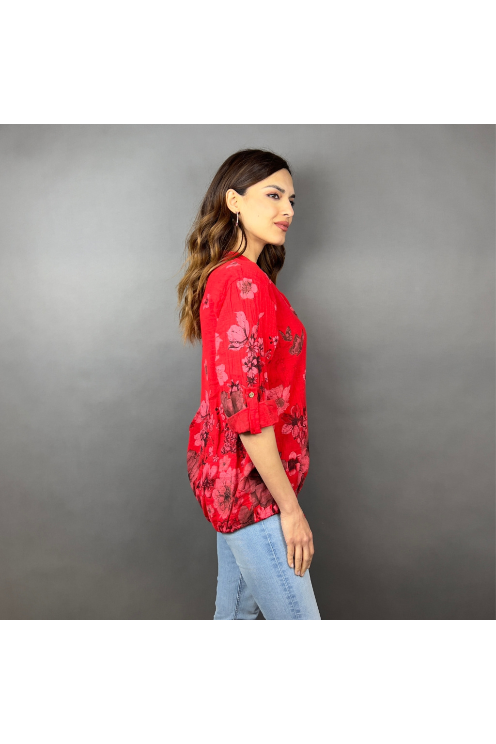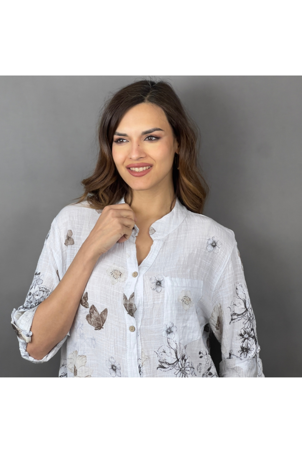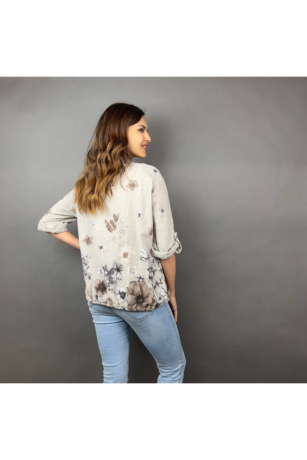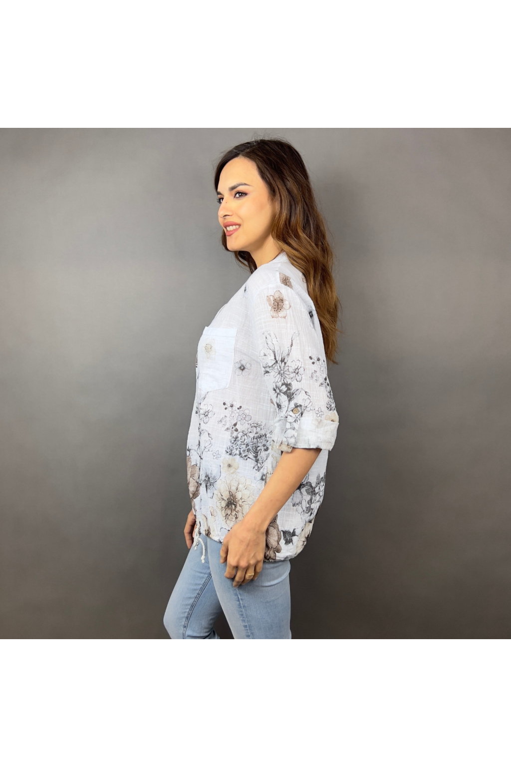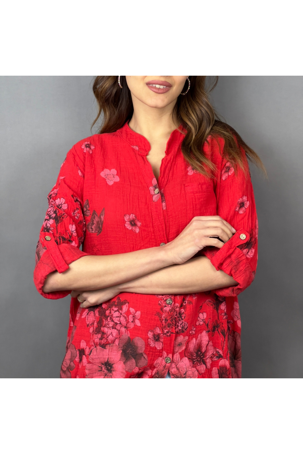Košile má zapínání na knoflíčky a jemně zaoblený dolní lem, který lichotí každé postavě. Rukávy lze nosit volně nebo prakticky ohrnout a zajistit knoflíkem. Výrazné květinové motivy přecházejí do různých barev pozadí, takže si každá žena vybere svůj oblíbený odstín – od jemné béžové až po výraznou červenou.