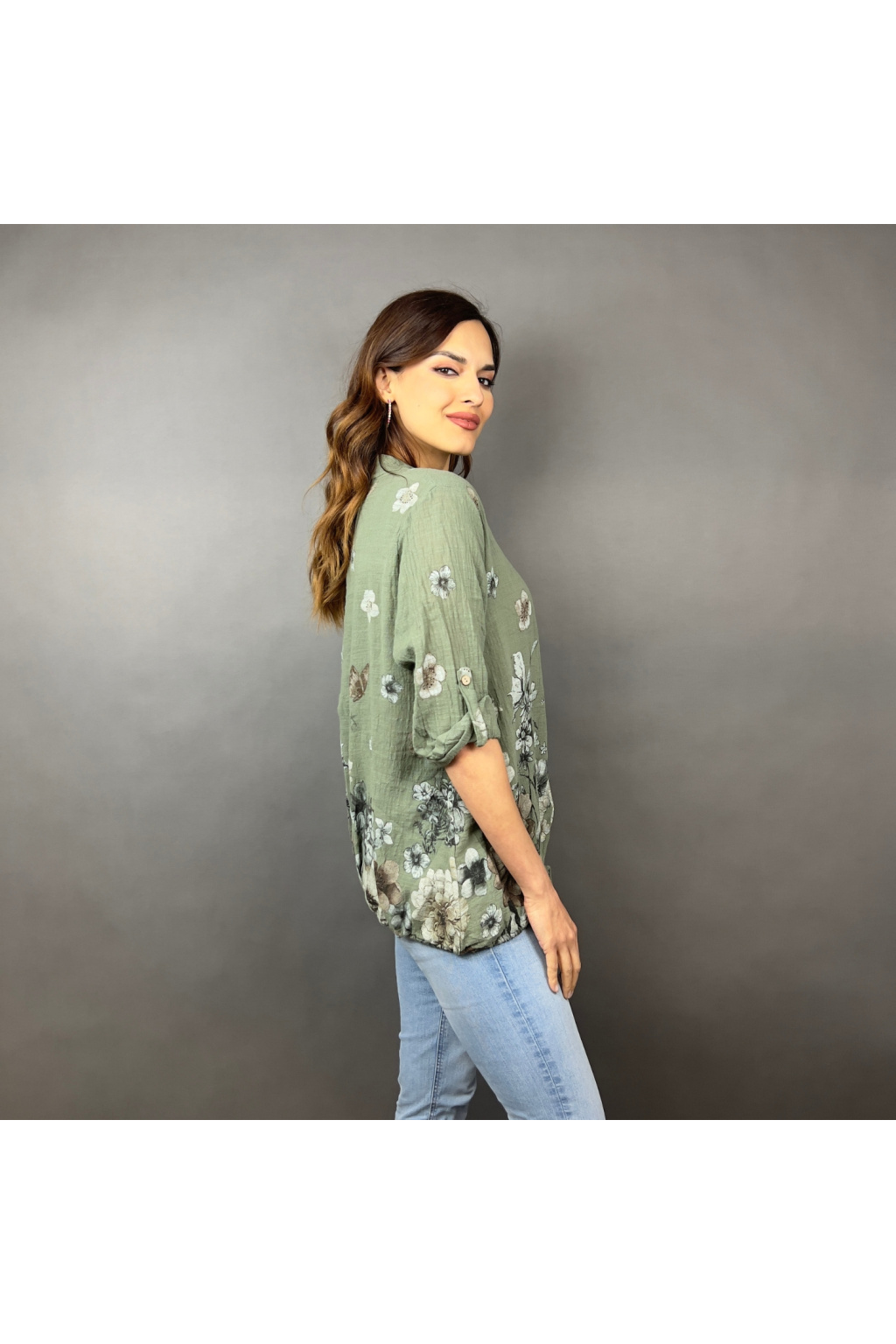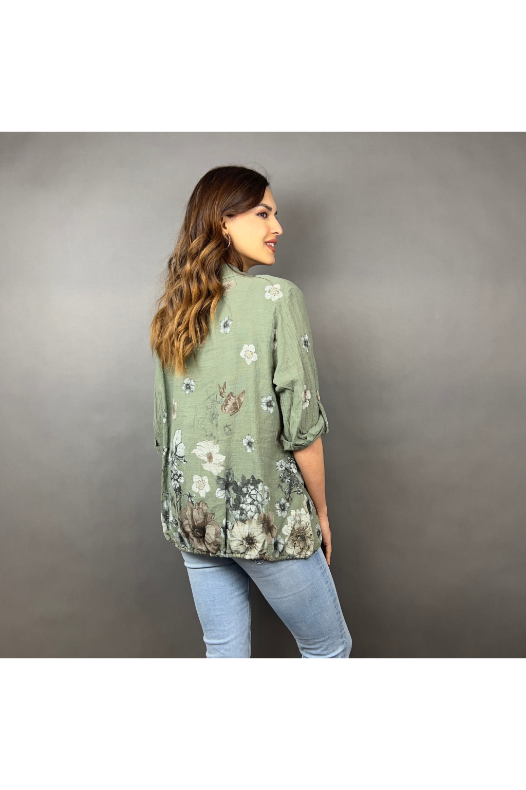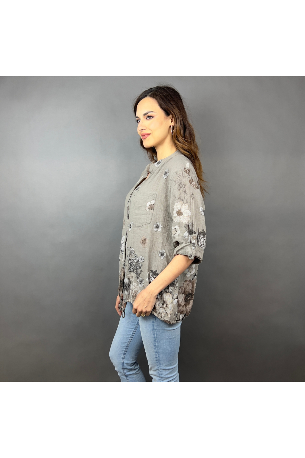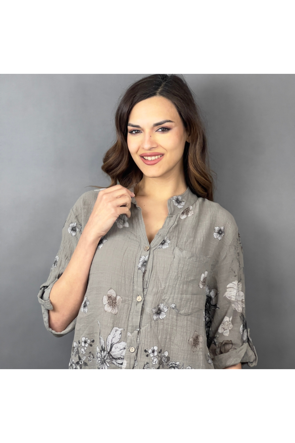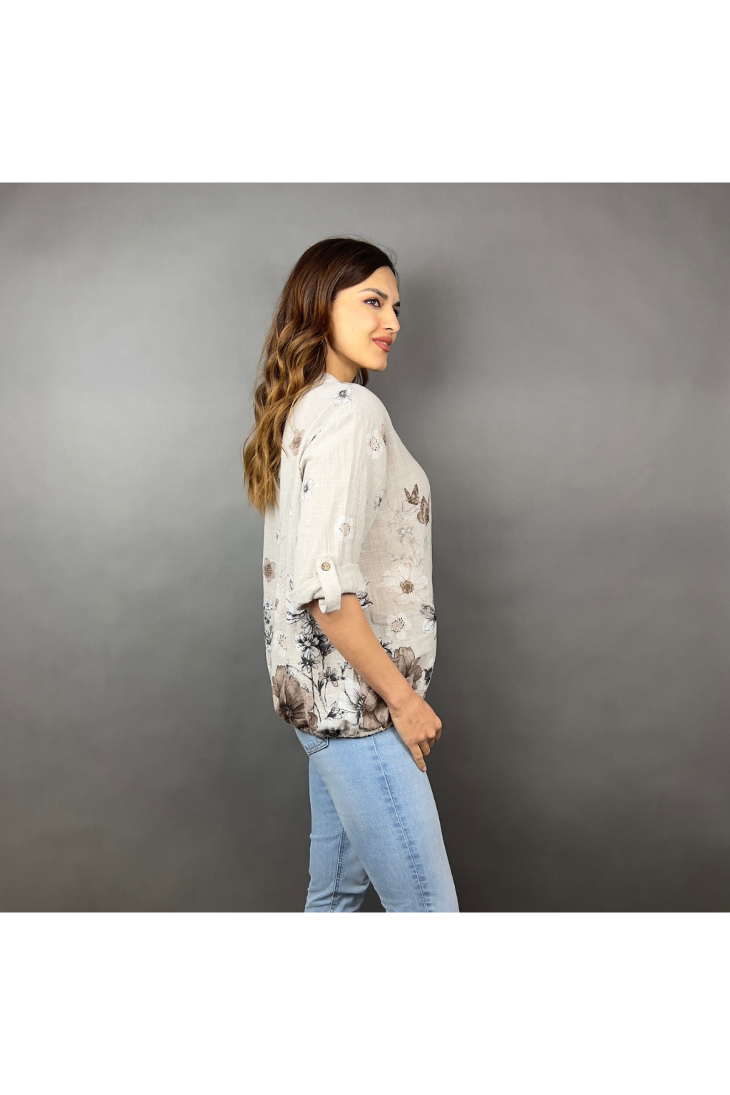 Košile má zapínání na knoflíčky a jemně zaoblený dolní lem, který lichotí každé postavě. Rukávy lze nosit volně nebo prakticky ohrnout a zajistit knoflíkem. Výrazné květinové motivy přecházejí do různých barev pozadí, takže si každá žena vybere svůj oblíbený odstín – od jemné béžové až po výraznou červenou.
