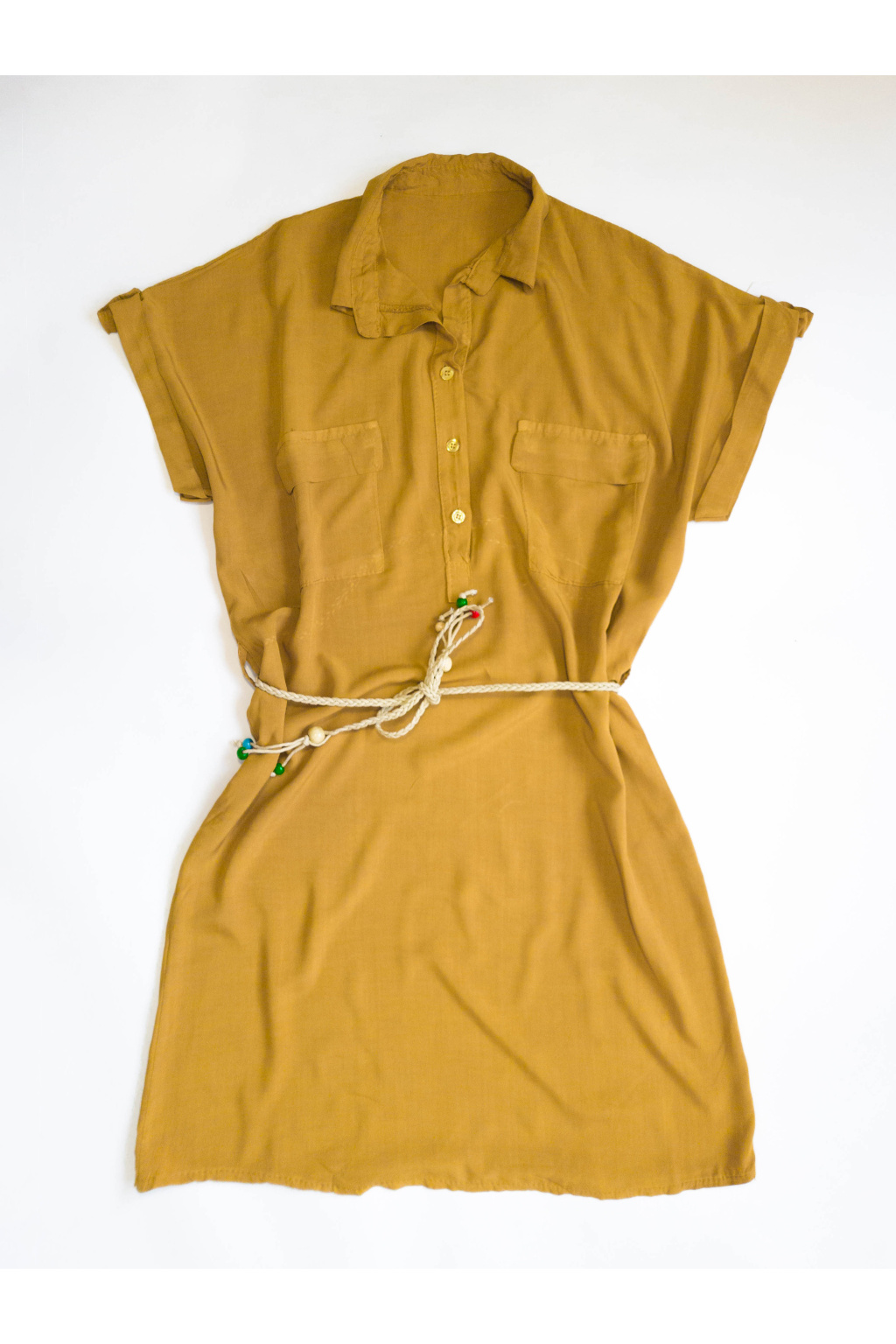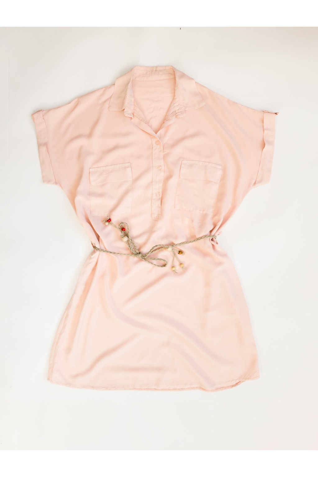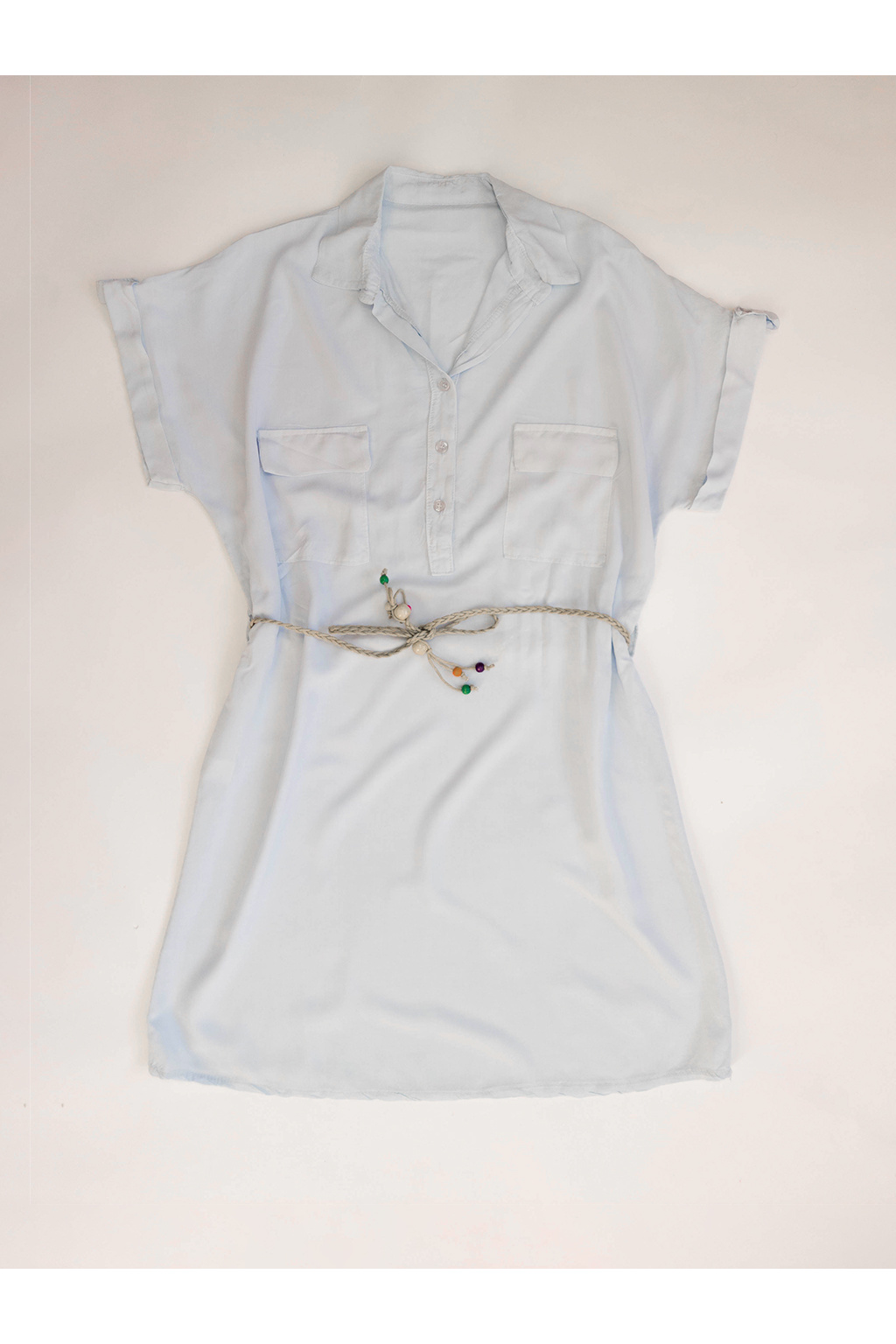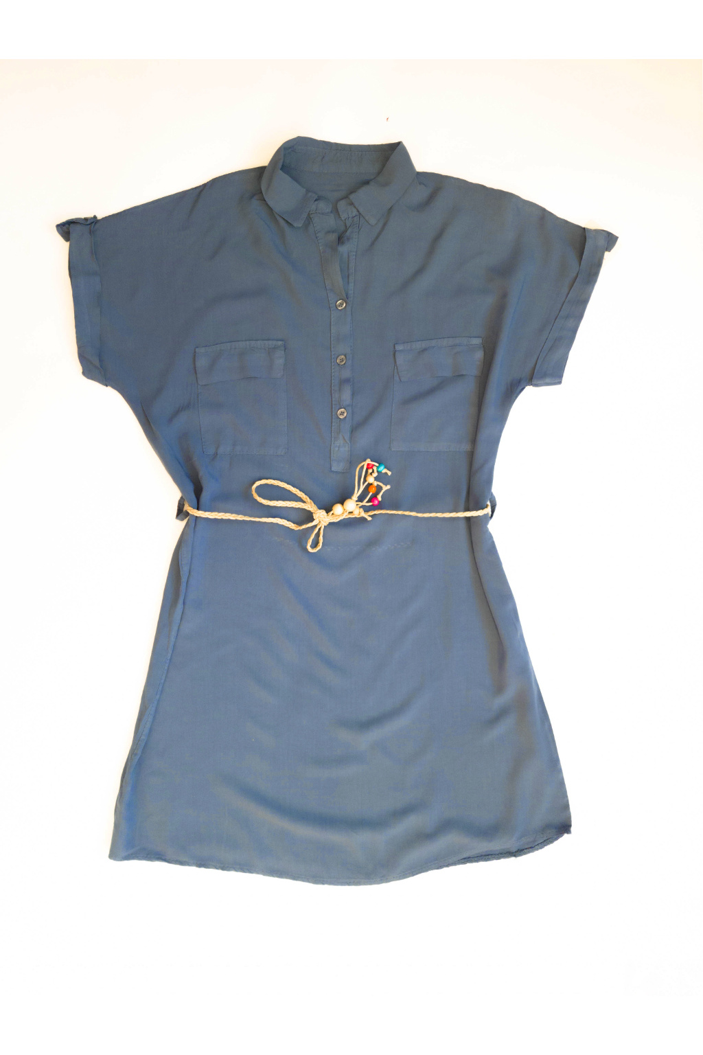 Dámské jednobarevné košilové šaty. S krátkým rukávem, na přední straně se dva kapsami. Zapínání na knoflíky