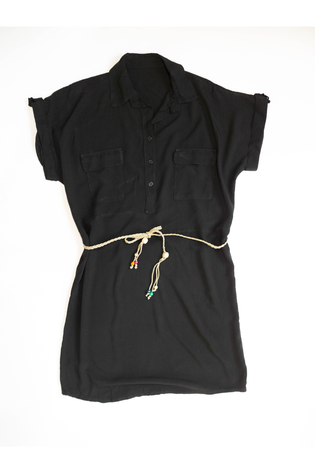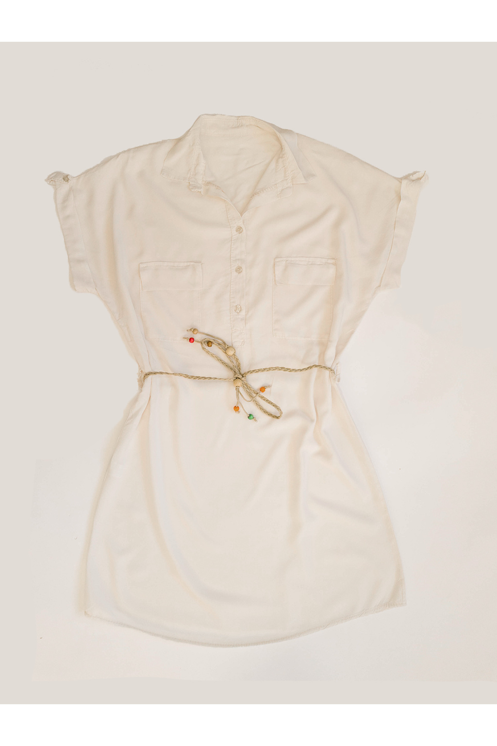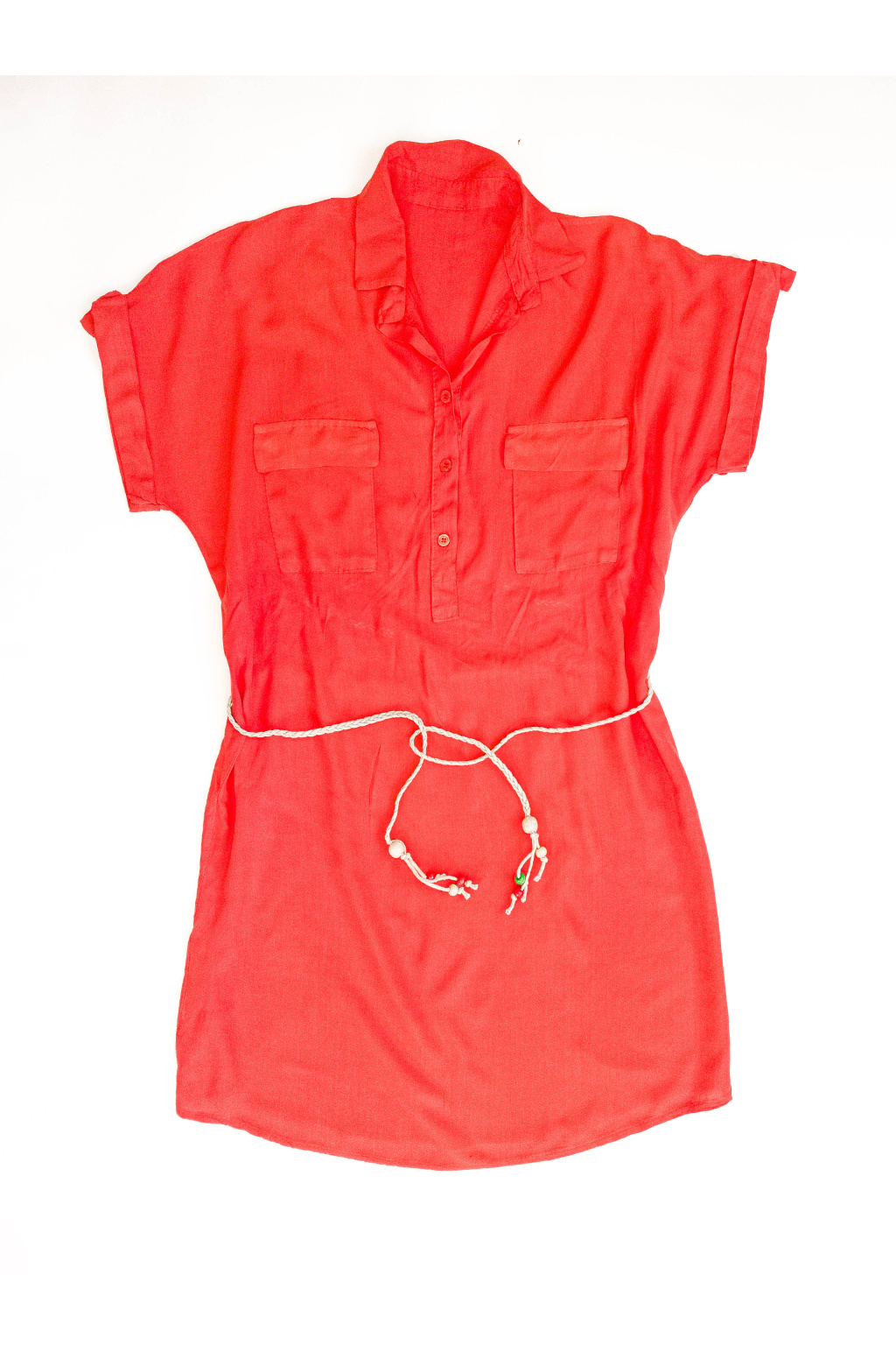 Dámské jednobarevné košilové šaty. S krátkým rukávem, na přední straně se dva kapsami. Zapínání na knoflíky