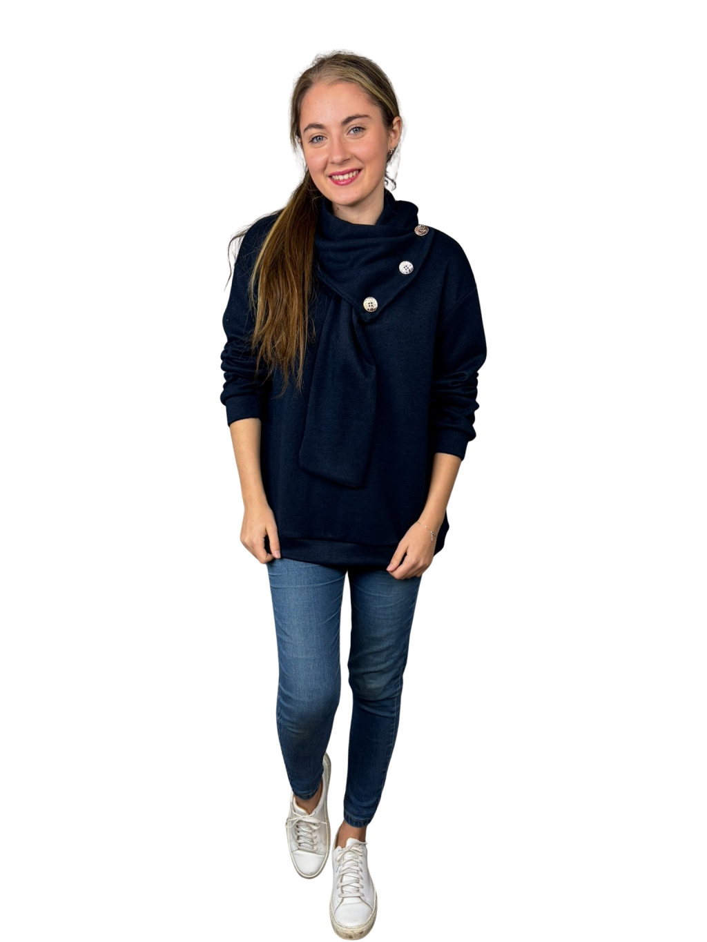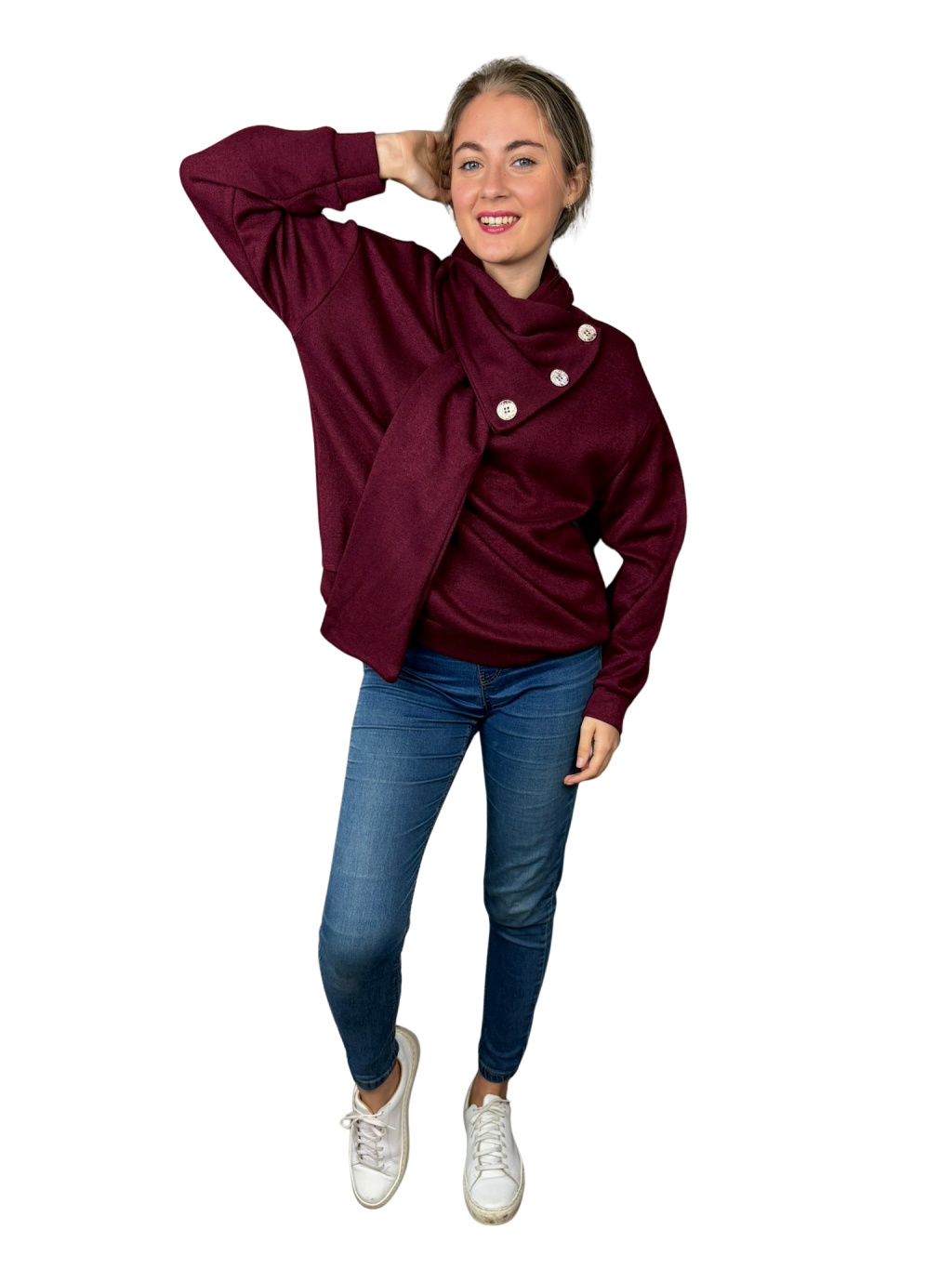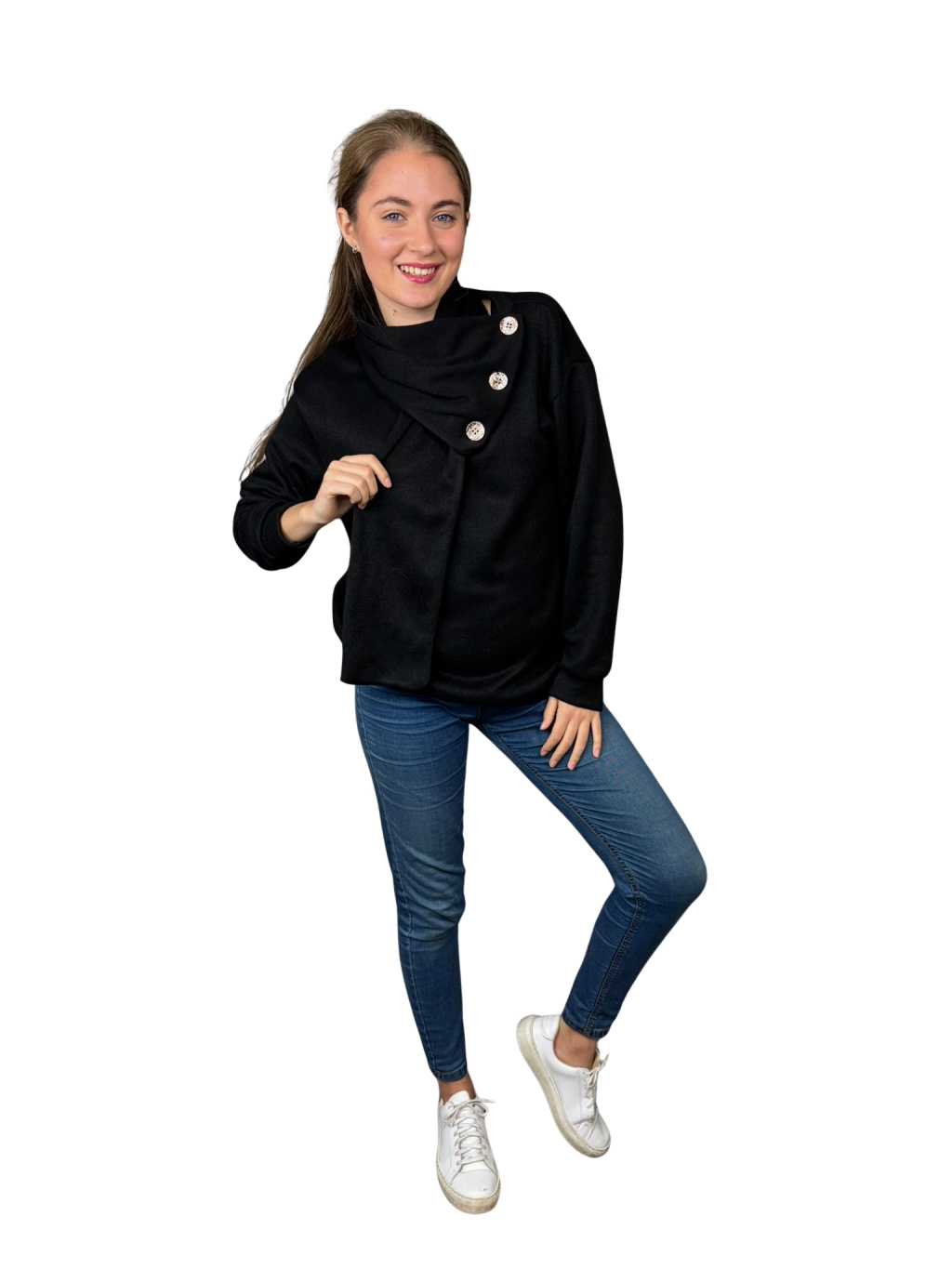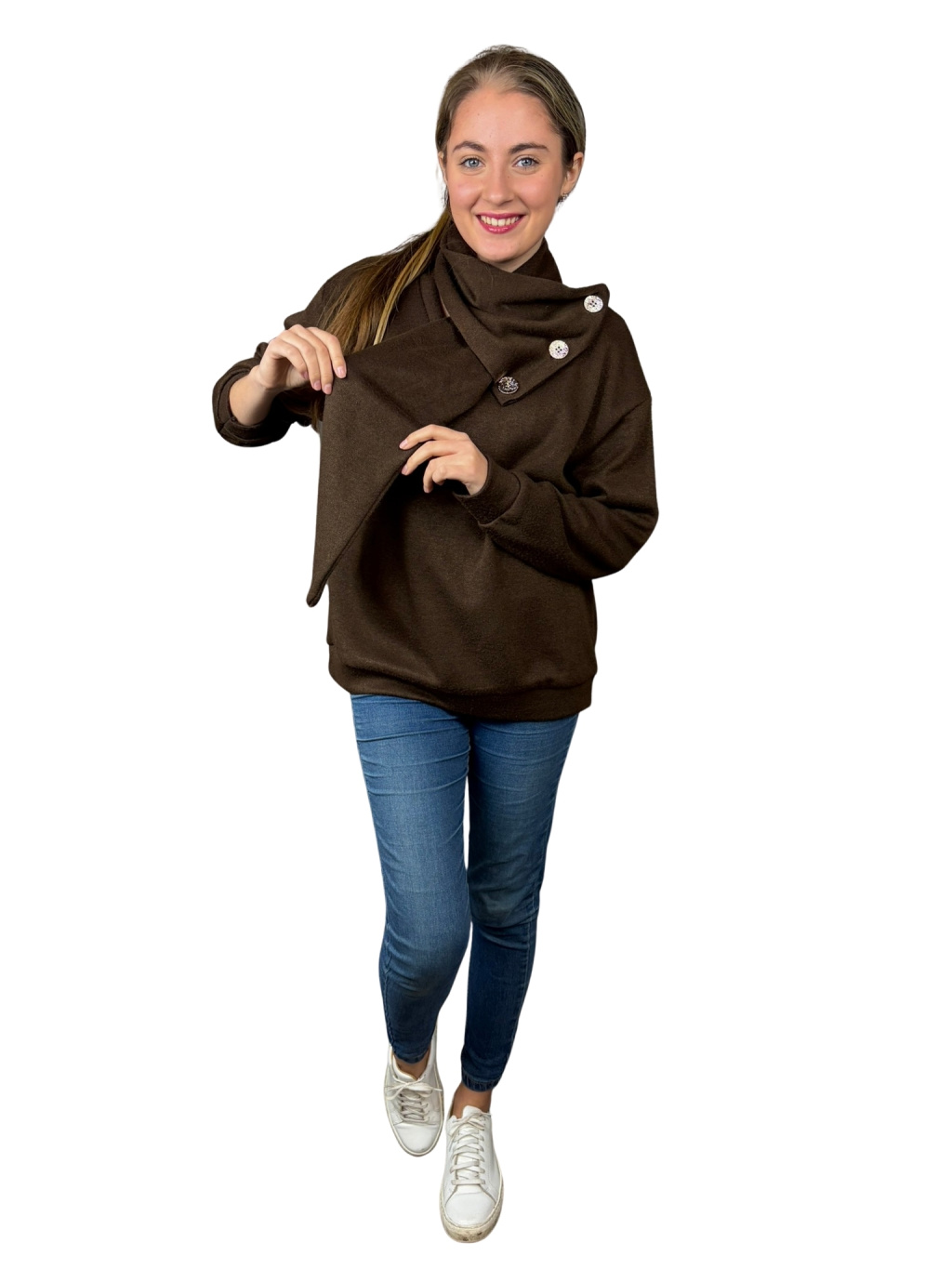 Dominantou mikiny Kora je asymetrický límec s dekorativními knoflíky, který vytváří elegantní a originální vzhled. Mikina působí upraveně i bez doplňků — stačí ji obléct a outfit je hotový.