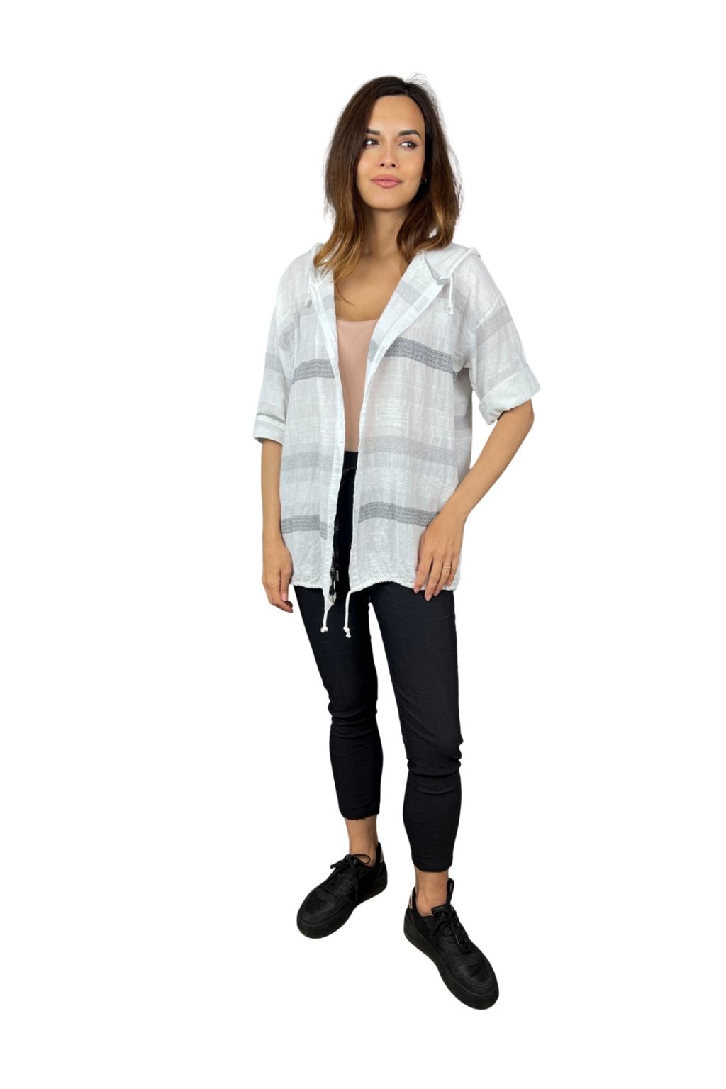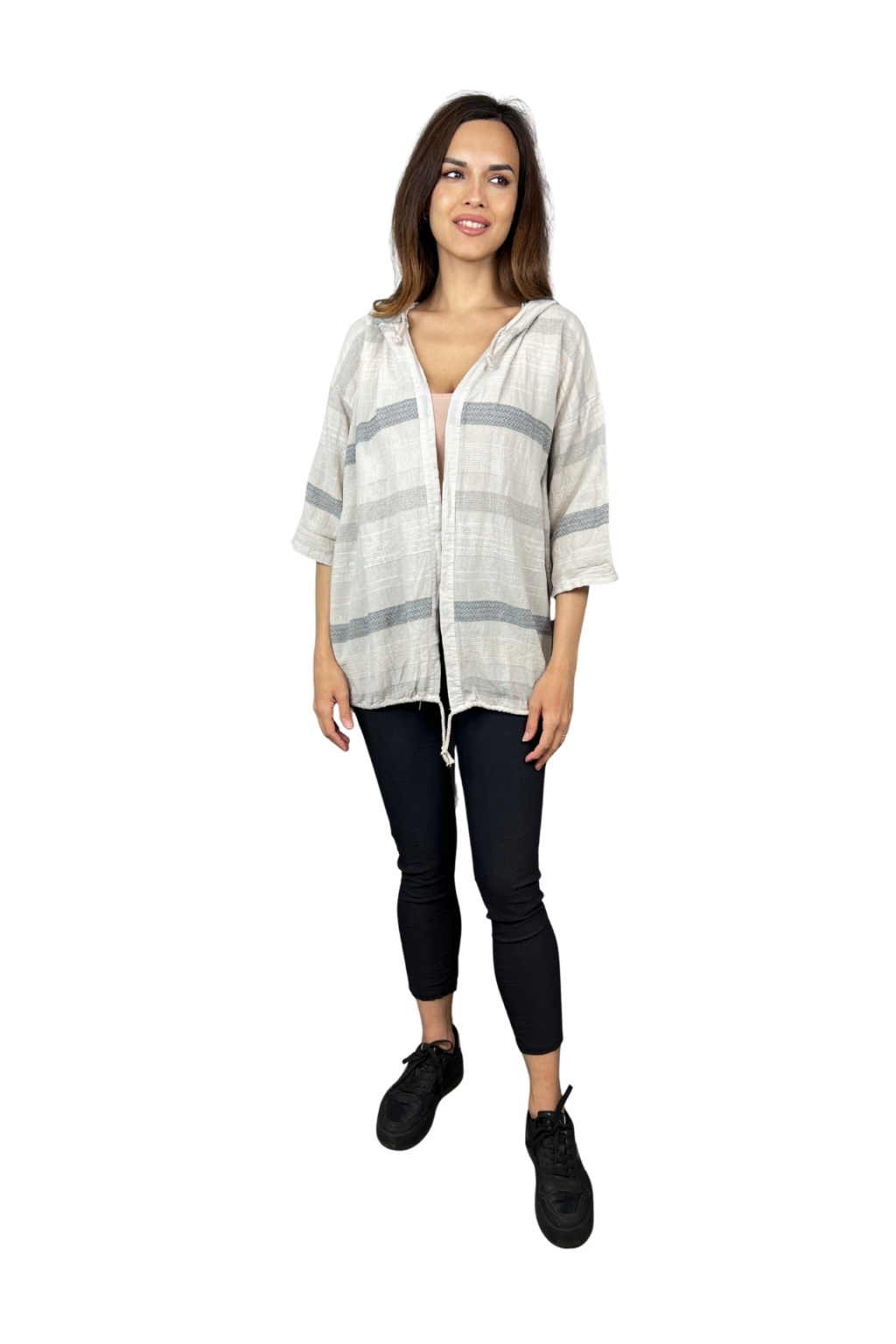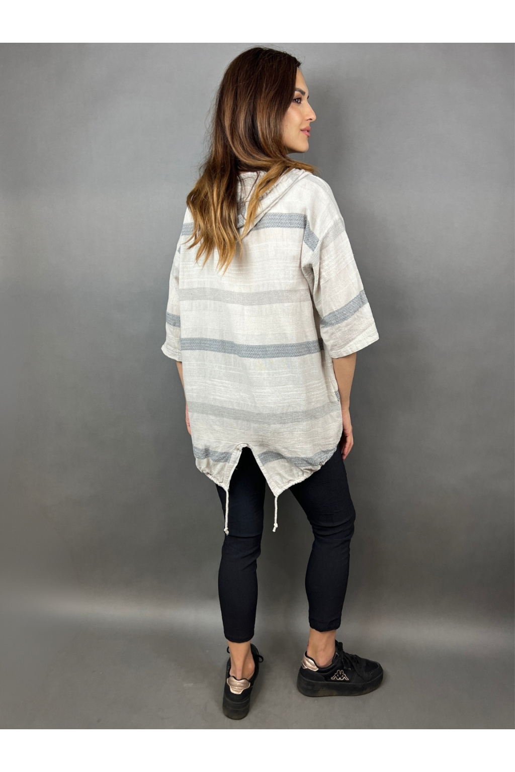 Kapuce a 3/4 rukávy z něj dělají univerzální kousek vhodný do města, na dovolenou nebo k vodě. Zadní část je prodloužená a zakončená stahováním, které umožňuje doladit siluetu podle potřeby.