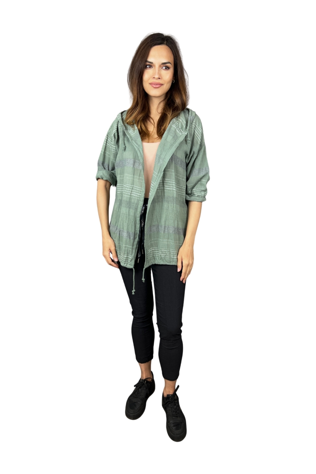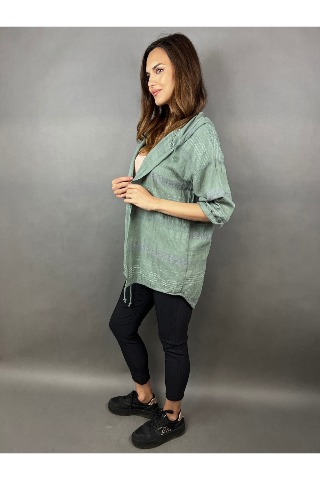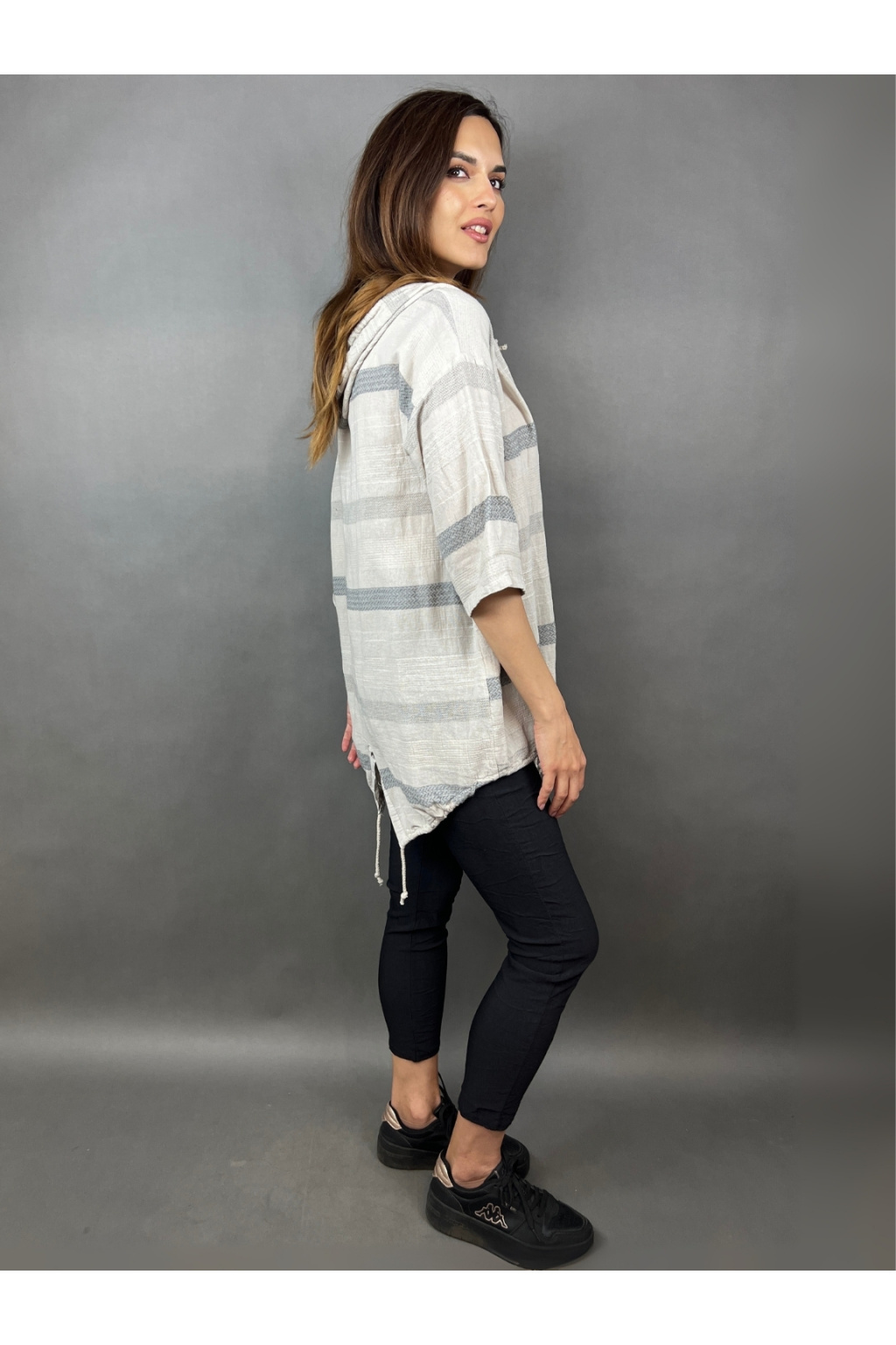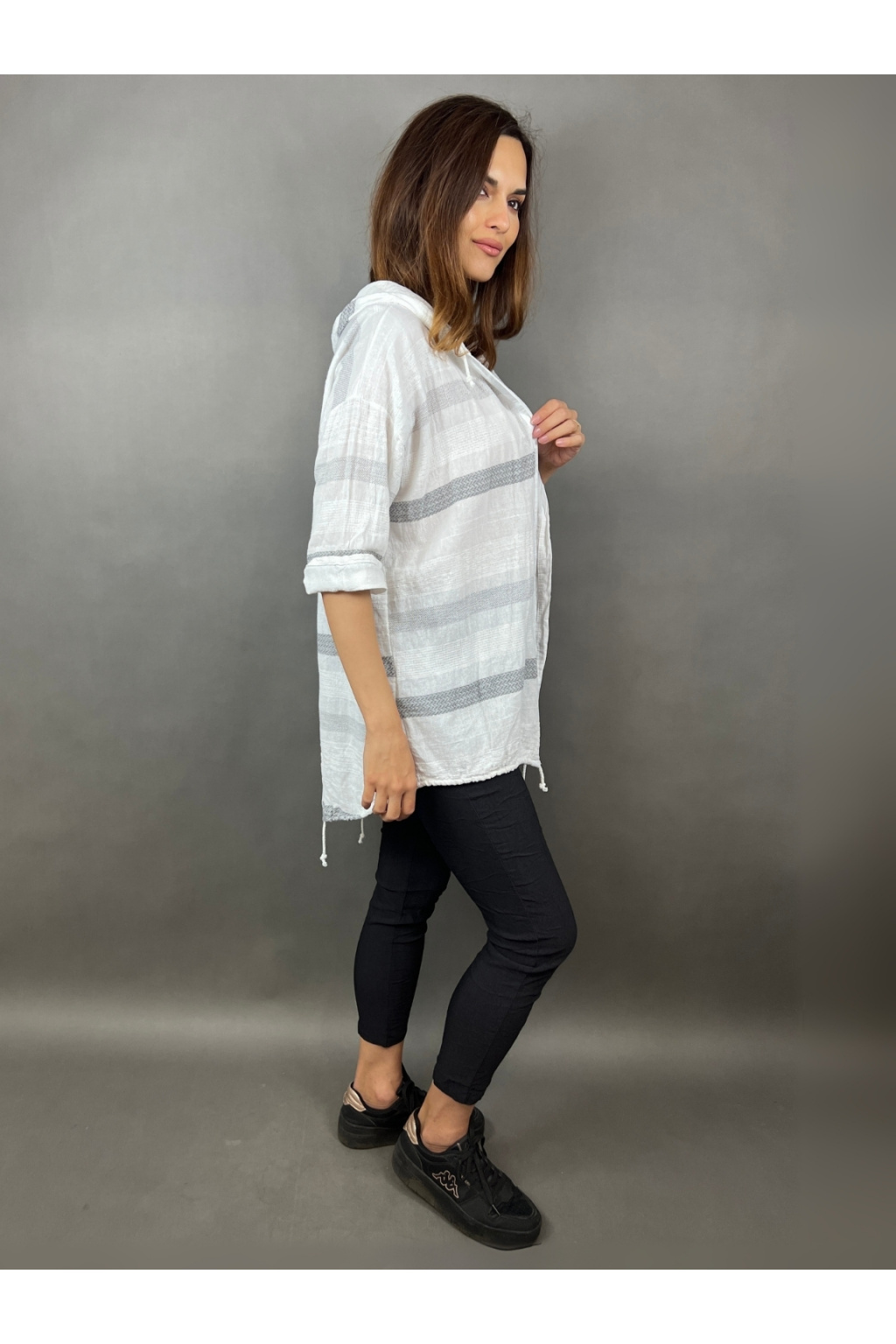 Kapuce a 3/4 rukávy z něj dělají univerzální kousek vhodný do města, na dovolenou nebo k vodě. Zadní část je prodloužená a zakončená stahováním, které umožňuje doladit siluetu podle potřeby.