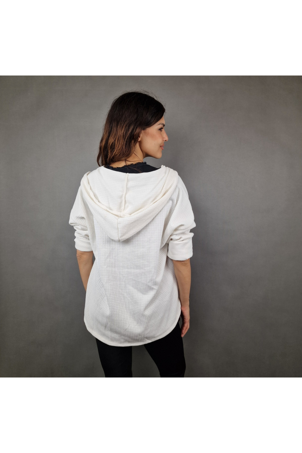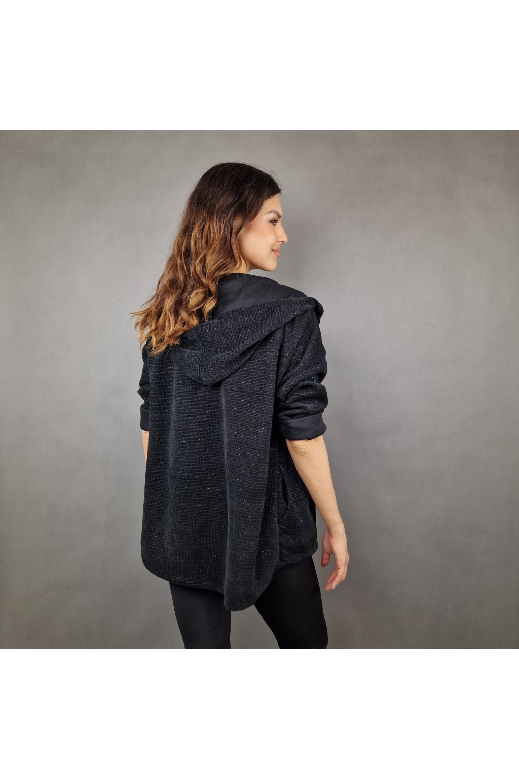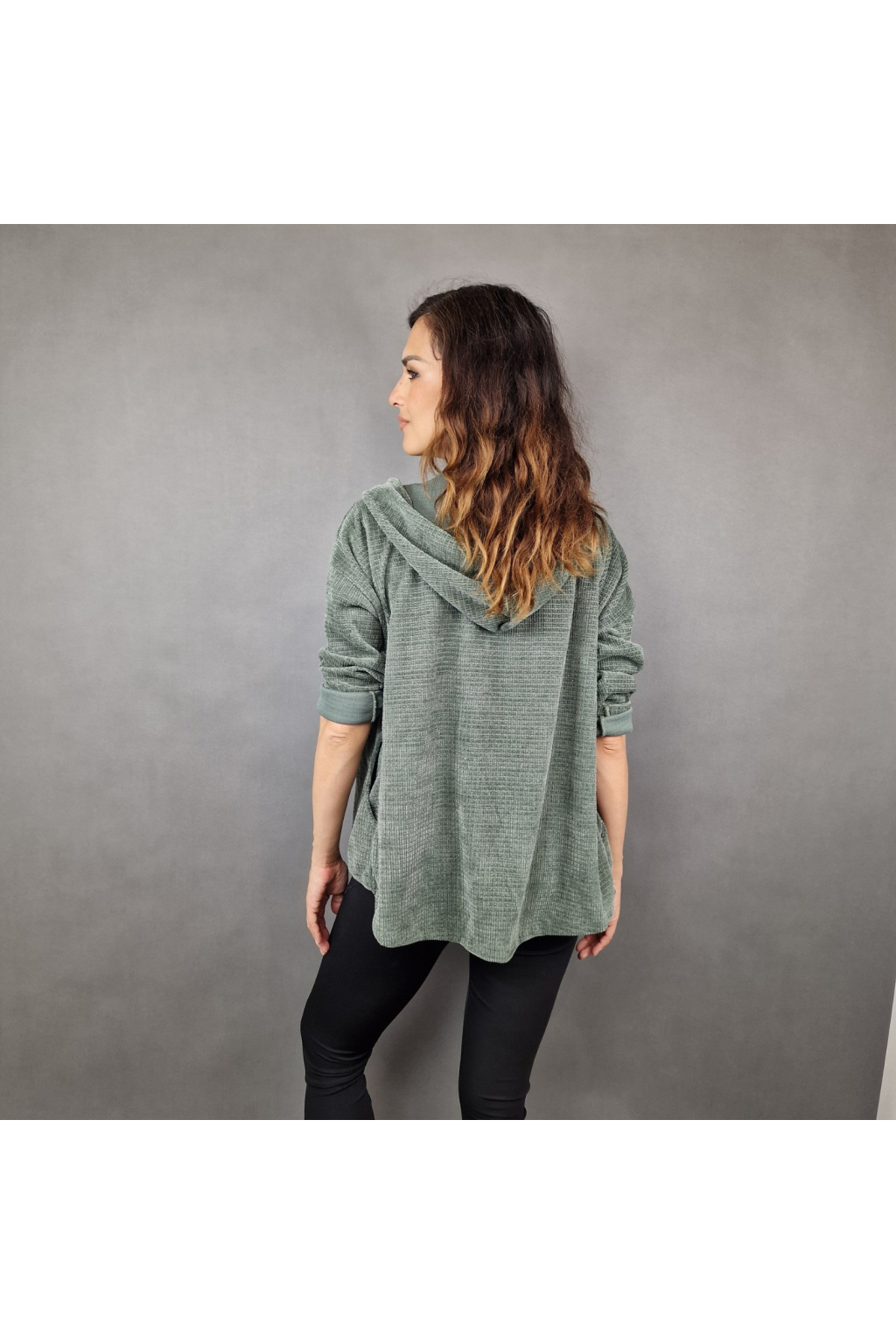Mikina je vybavena kapucí, která poskytuje dodatečnou ochranu před chladem a větrem, což ji činí ideální pro různé počasí. Rukávy jsou dlouhé a volně ohrnuté, což dodává mikině ležérní a nenucený styl. Mikina má také texturovaný vzhled, který jí dodává zajímavý vizuální efekt a odlišuje ji od klasických hladkých modelů.
