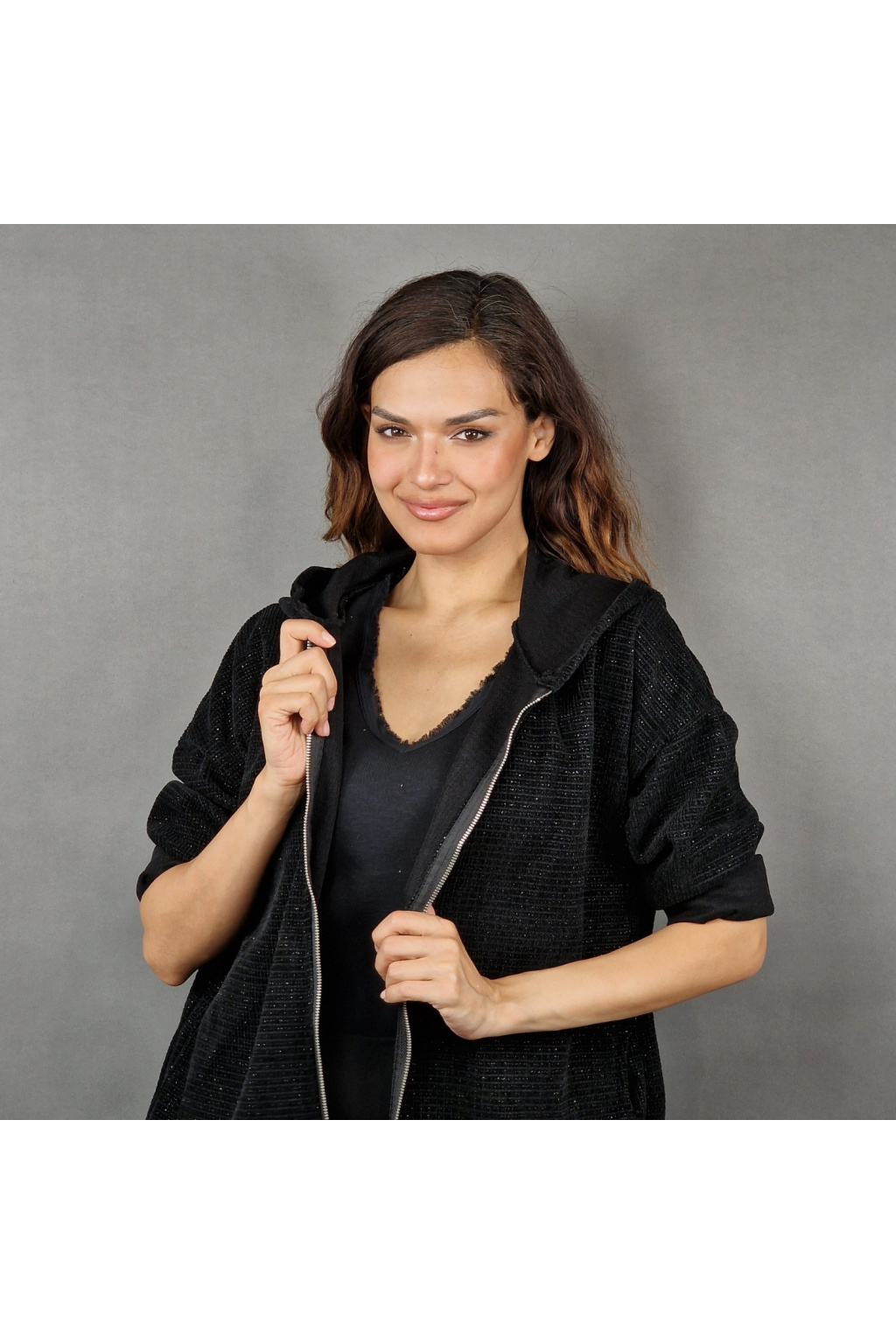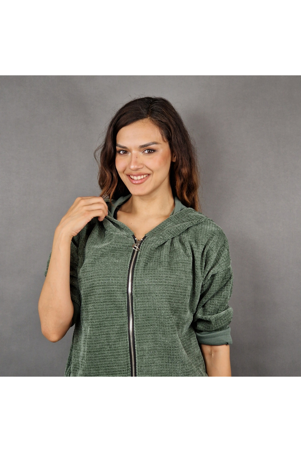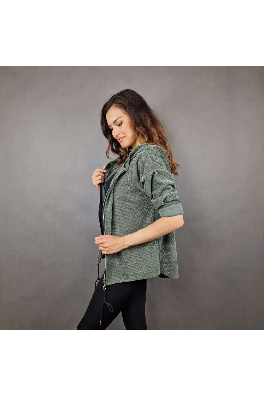 Mikina je vybavena kapucí, která poskytuje dodatečnou ochranu před chladem a větrem, což ji činí ideální pro různé počasí. Rukávy jsou dlouhé a volně ohrnuté, což dodává mikině ležérní a nenucený styl. Mikina má také texturovaný vzhled, který jí dodává zajímavý vizuální efekt a odlišuje ji od klasických hladkých modelů.