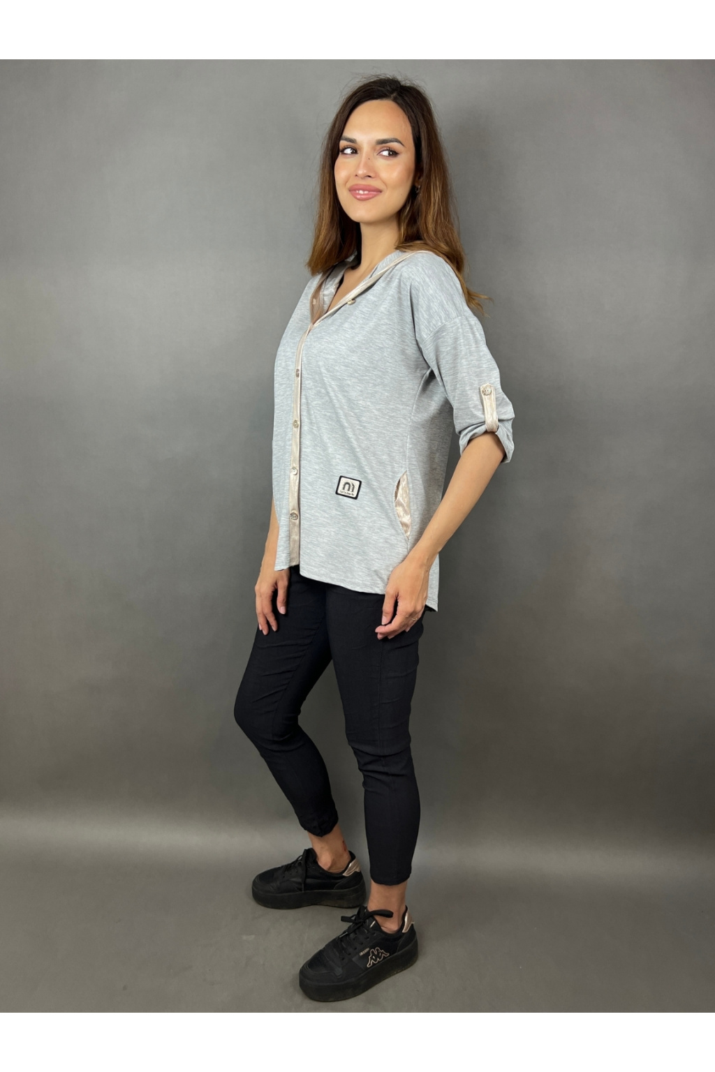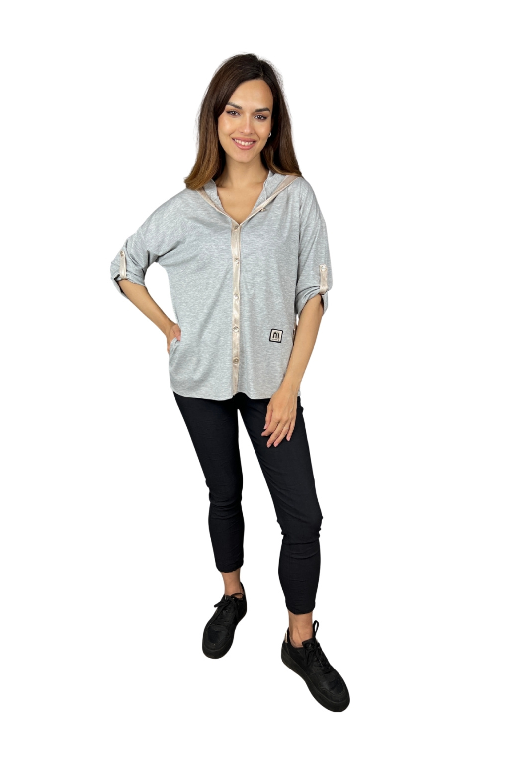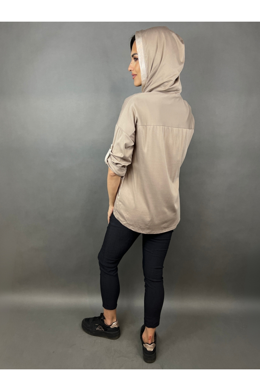 Dominantním prvkem je kapuce lemovaná jemně třpytivým páskem, který se opakuje i na zapínání a manžetách. Mikina má ohrnovací rukávy s ozdobnými pásky na knoflík, a díky decentnímu logu vpředu působí moderně a svěže.