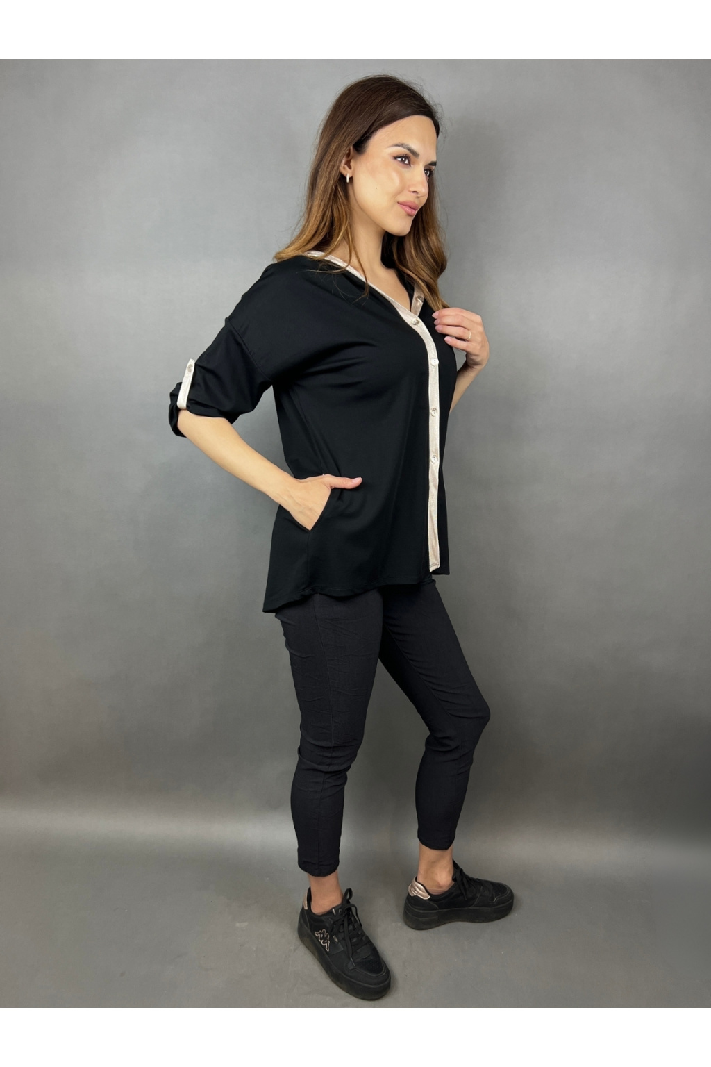 Viskóza v kombinaci s polyesterem a elastanem zaručuje pohodlí, splývavost a lehkou pružnost. Model je skvělý k džínám, legínám i ležérním kalhotám – na víkend, pochůzky i cestování.