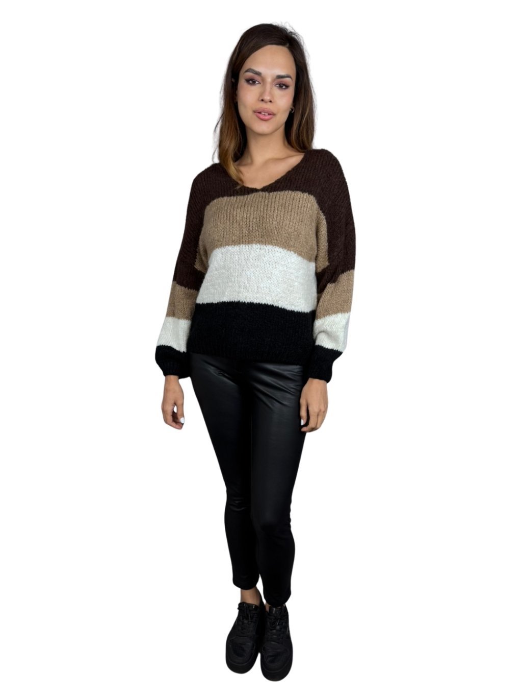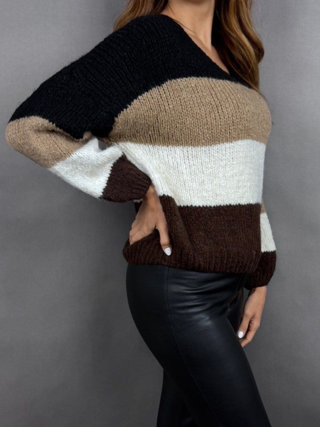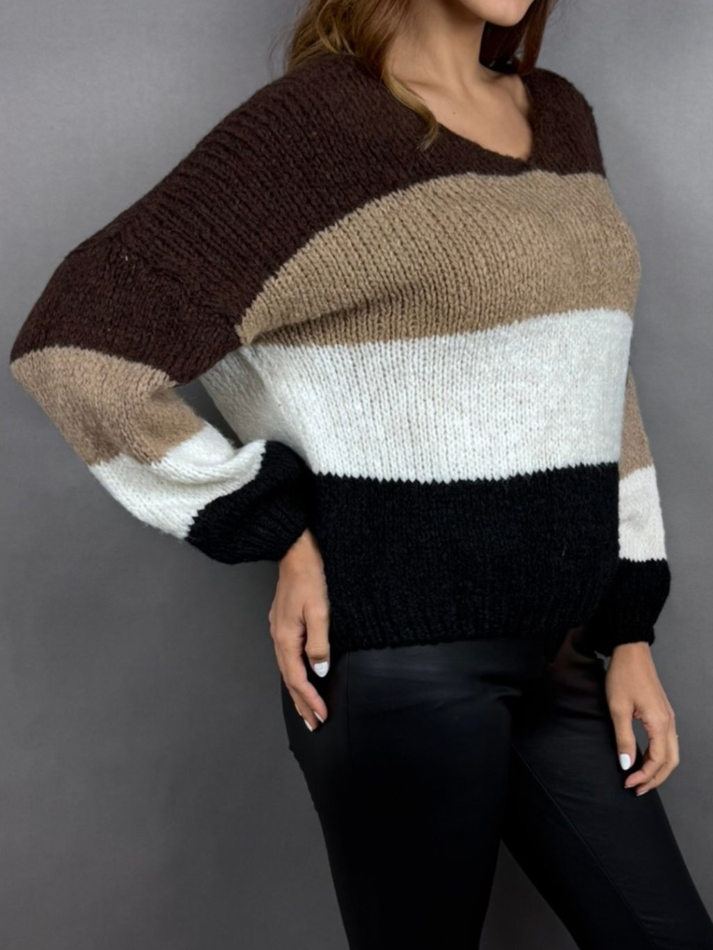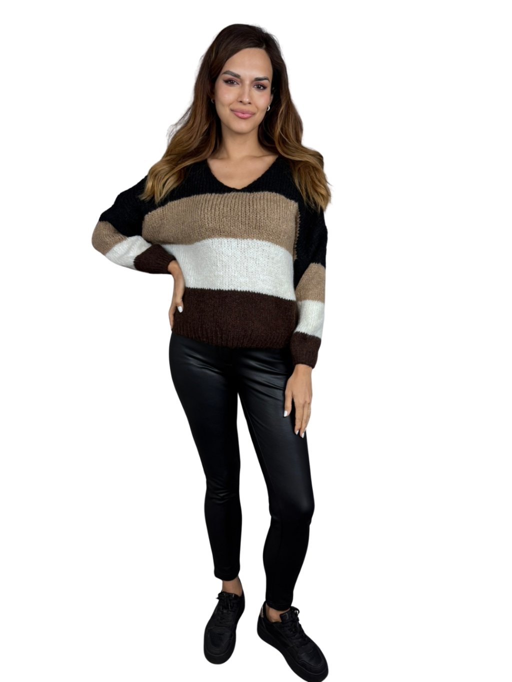 Dámský svetr Verona s barevnými pruhy a výstřihem do V. Pohodlný volný střih pro moderní a ležérní outfit.