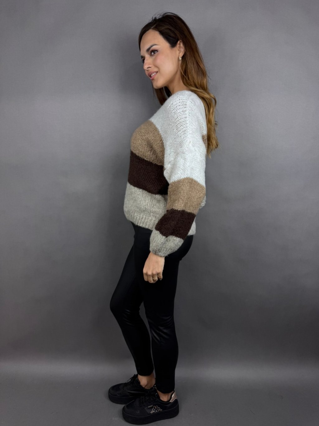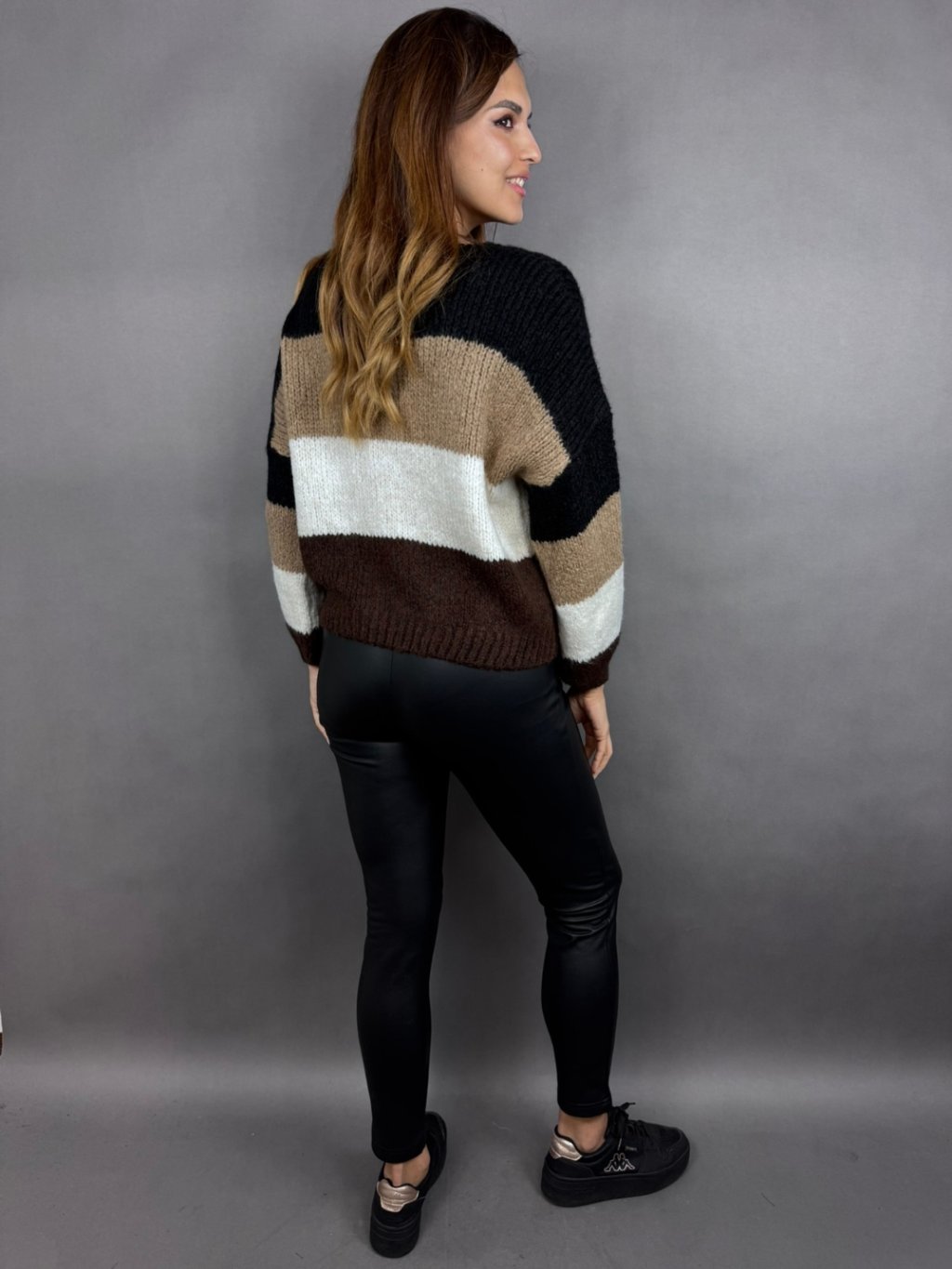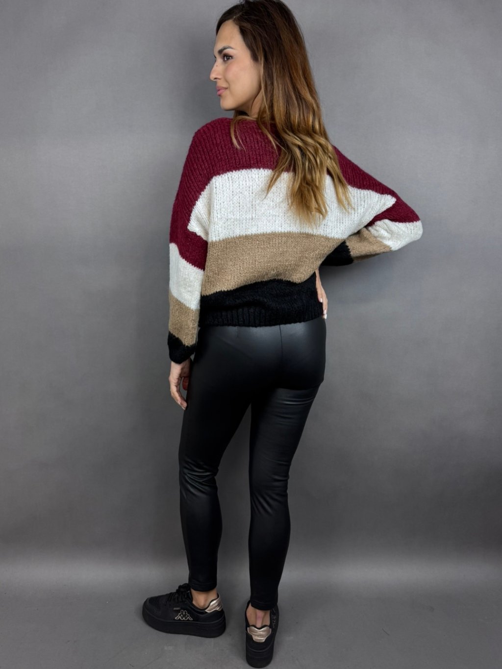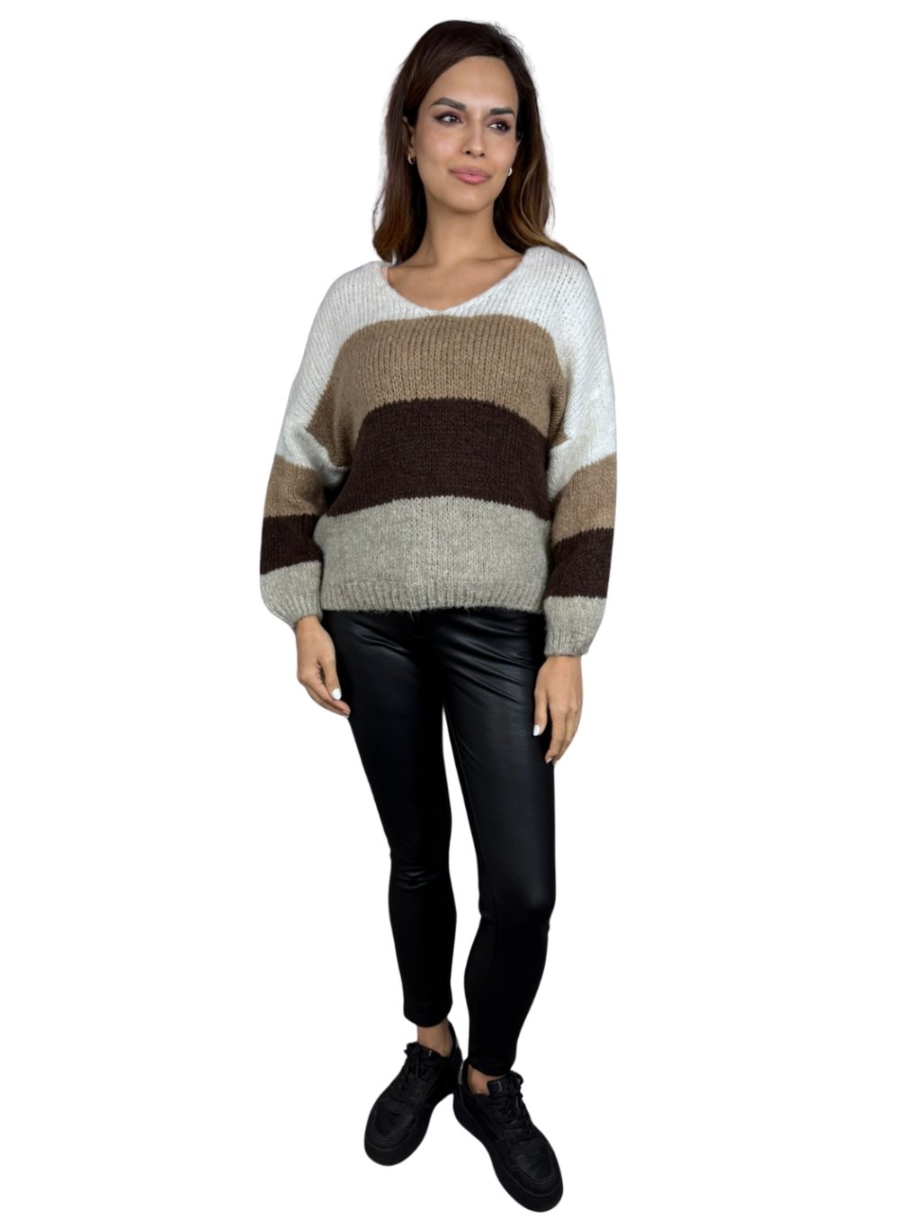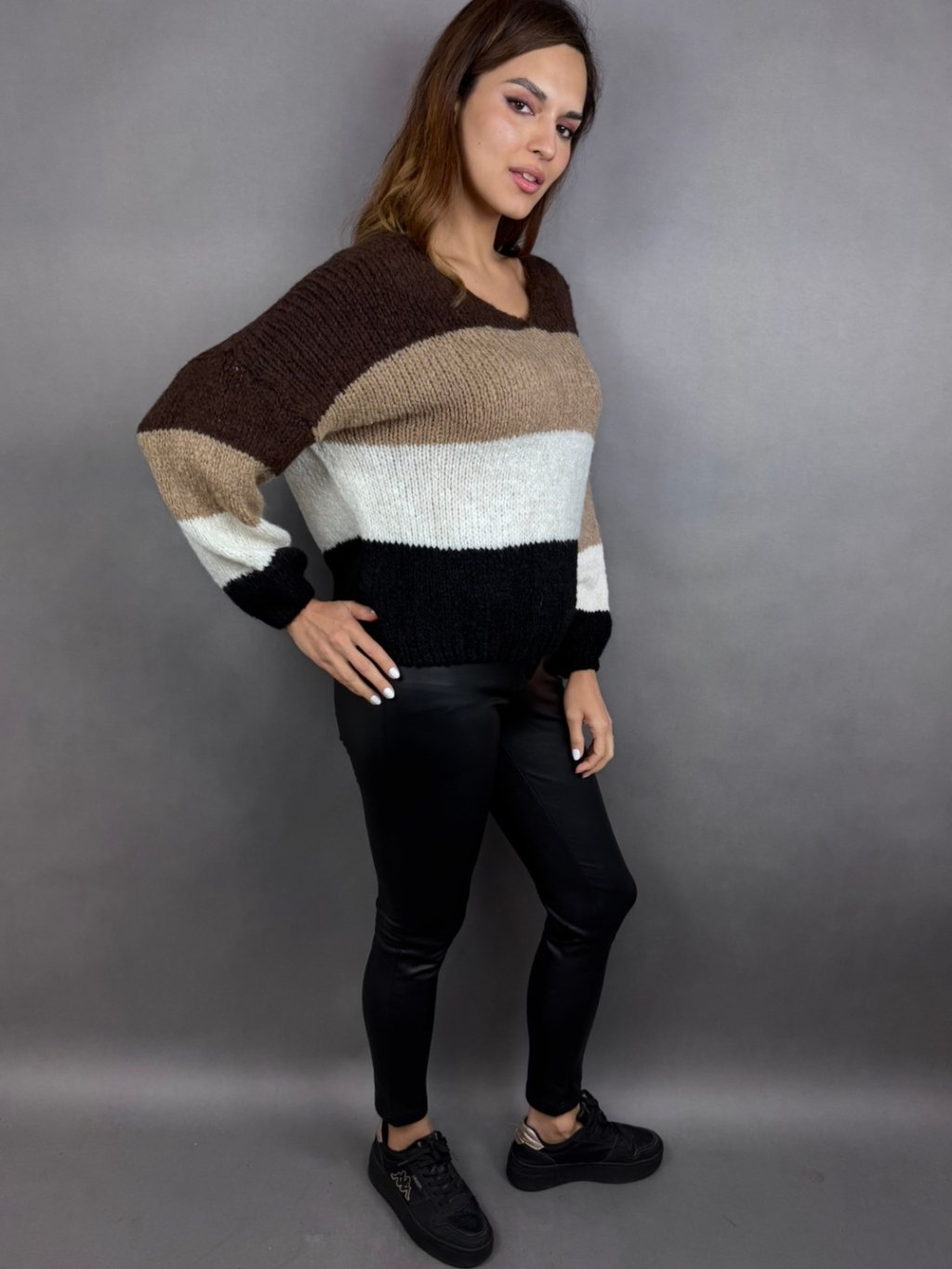 Dámský svetr Verona s barevnými pruhy a výstřihem do V. Pohodlný volný střih pro moderní a ležérní outfit.