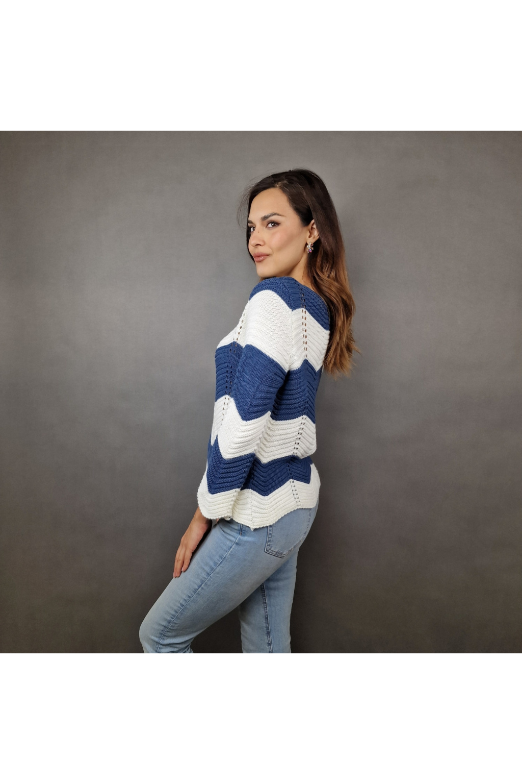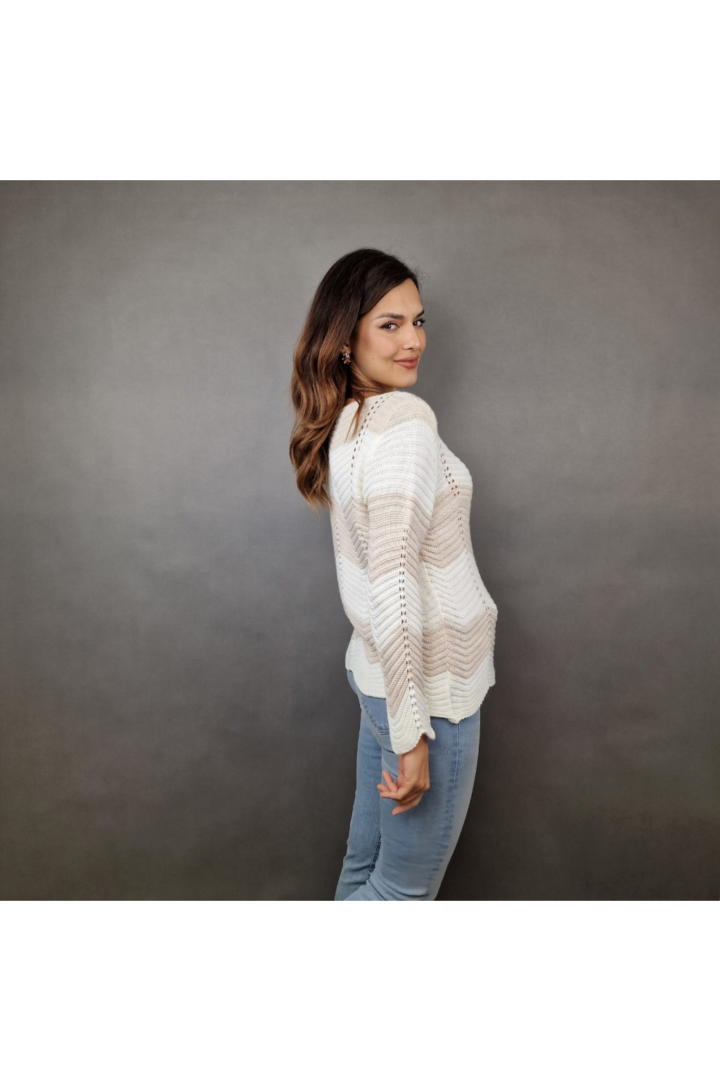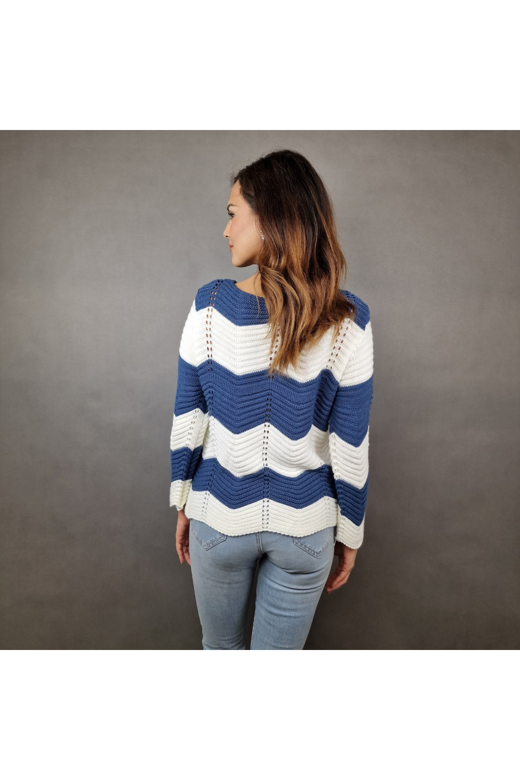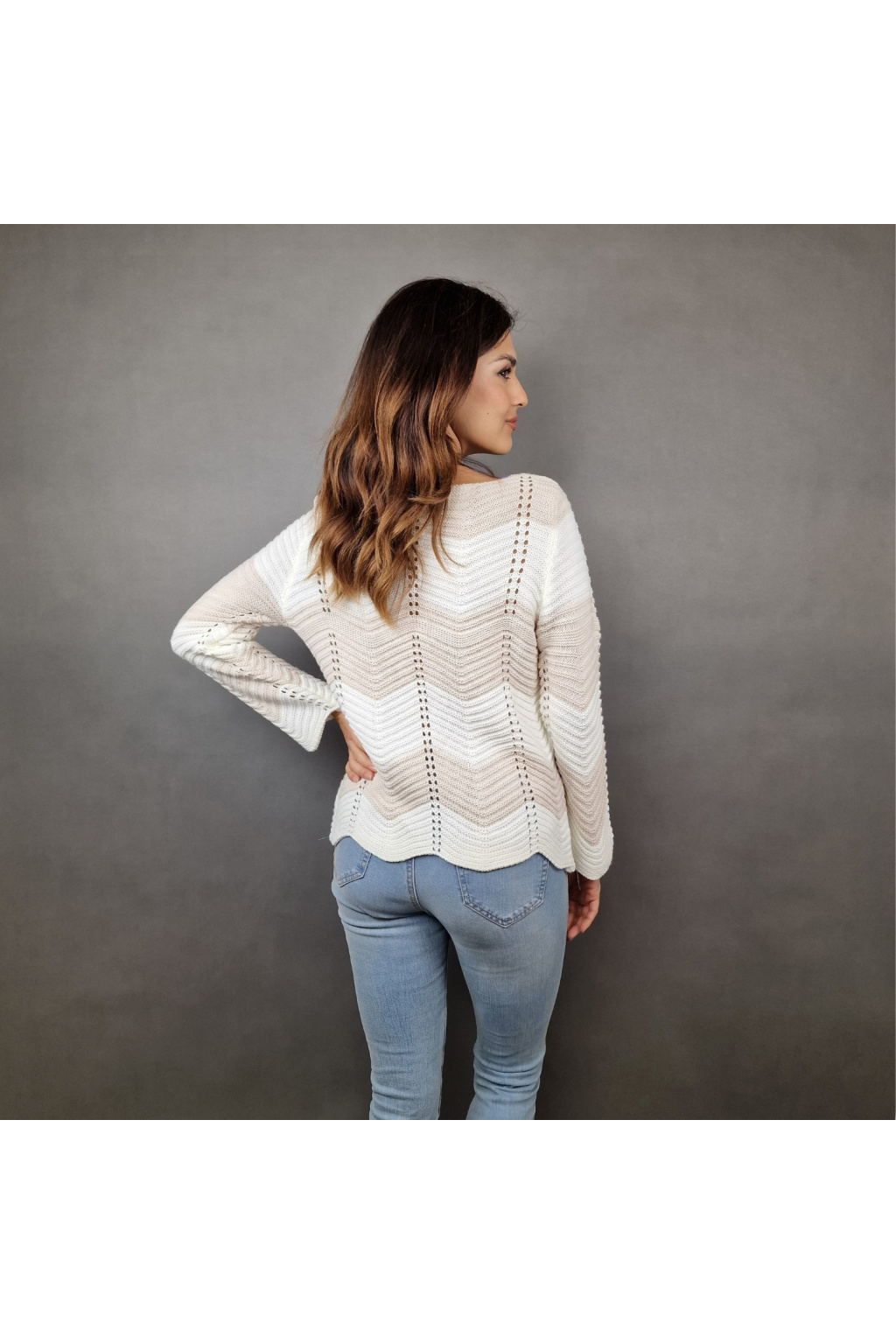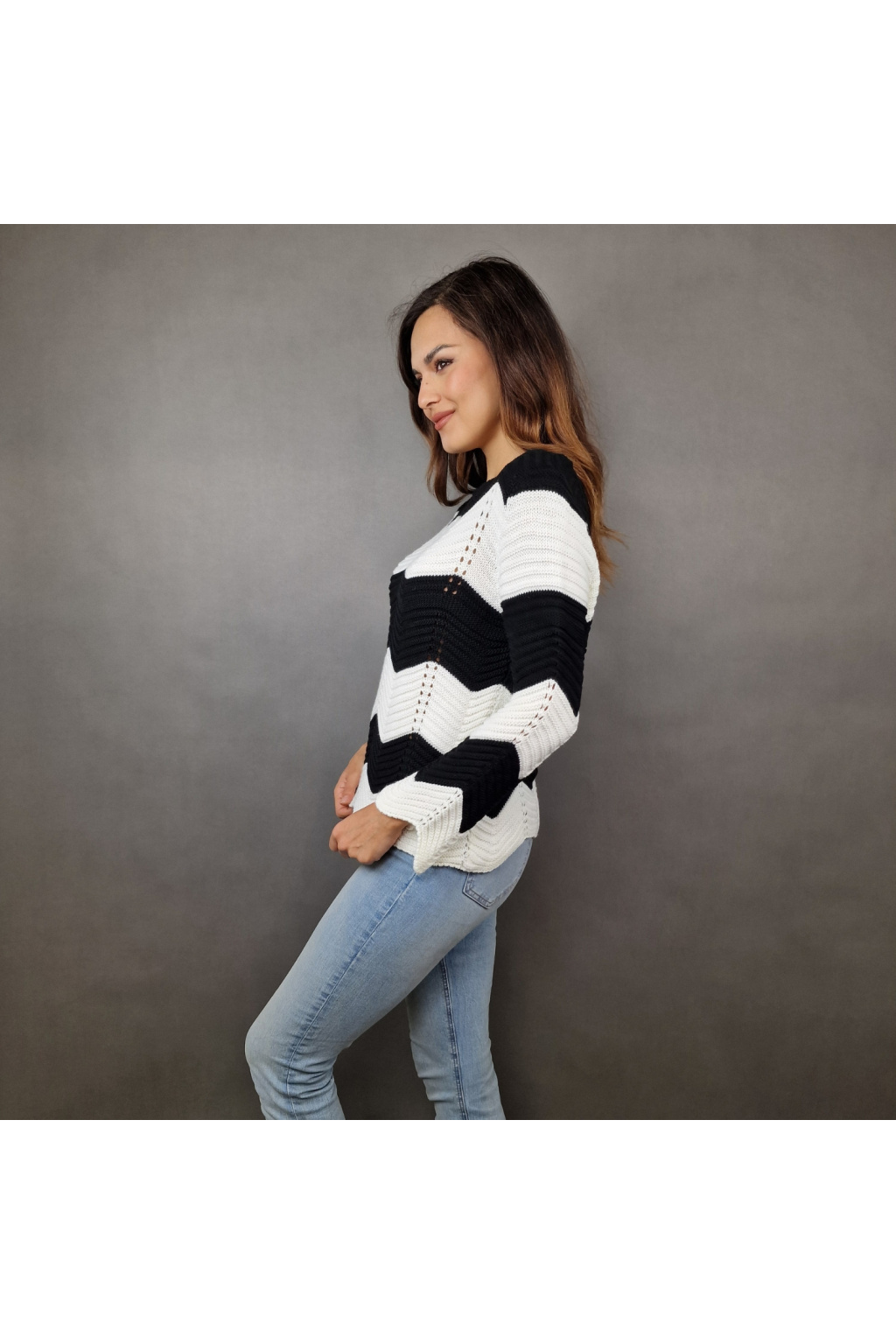 Výrazný cik-cak vzor dodává svetru moderní a hravý vzhled. Volnější střih a dlouhé rukávy zajišťují pohodlí a ležérní styl, díky čemuž se svetr snadno kombinuje s různými outfity. Tento kousek je ideální pro vrstvení, což ho činí univerzálním doplňkem vašeho šatníku.