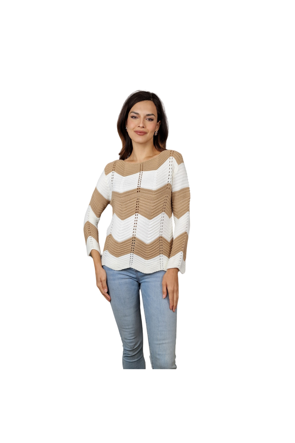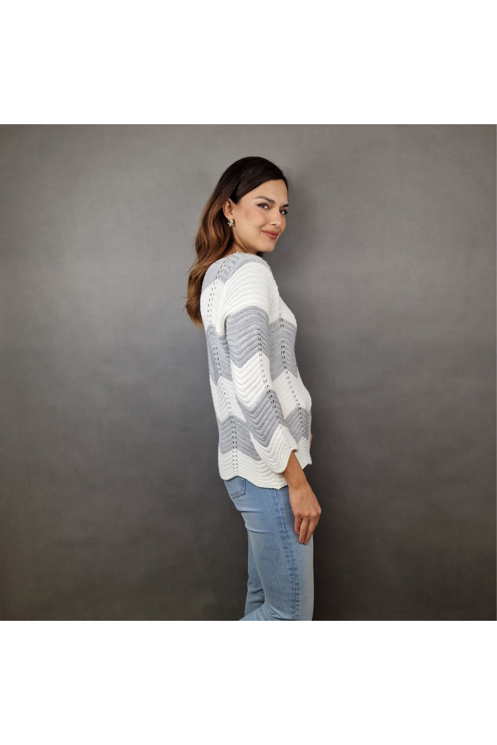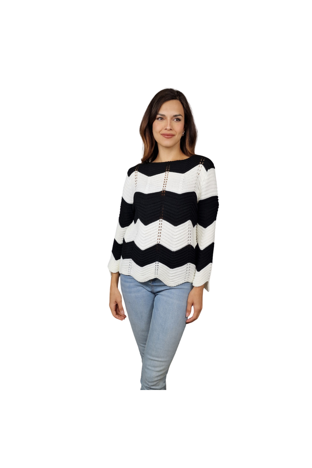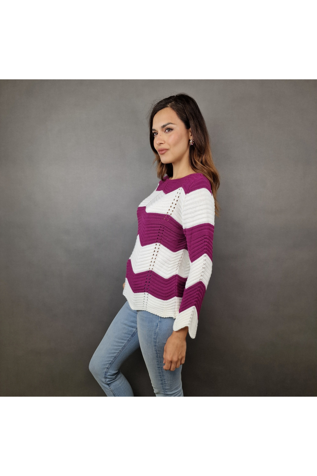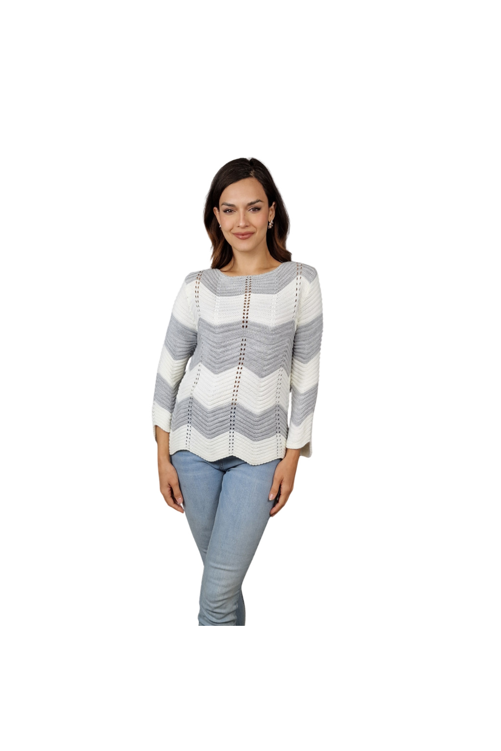 Výrazný cik-cak vzor dodává svetru moderní a hravý vzhled. Volnější střih a dlouhé rukávy zajišťují pohodlí a ležérní styl, díky čemuž se svetr snadno kombinuje s různými outfity. Tento kousek je ideální pro vrstvení, což ho činí univerzálním doplňkem vašeho šatníku.