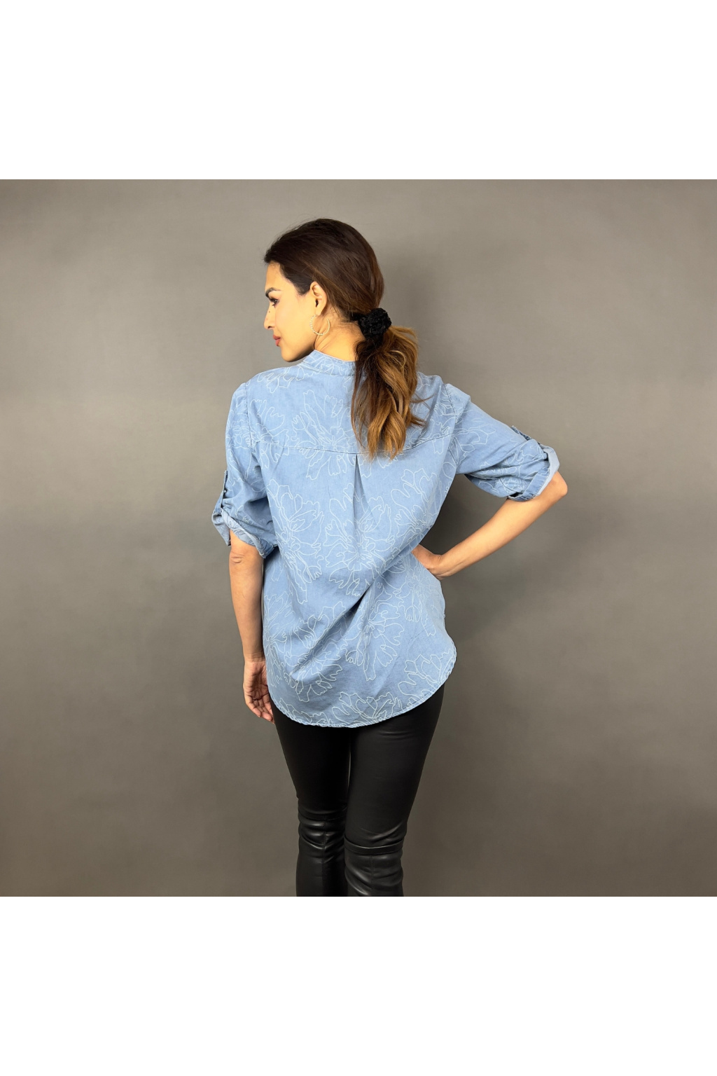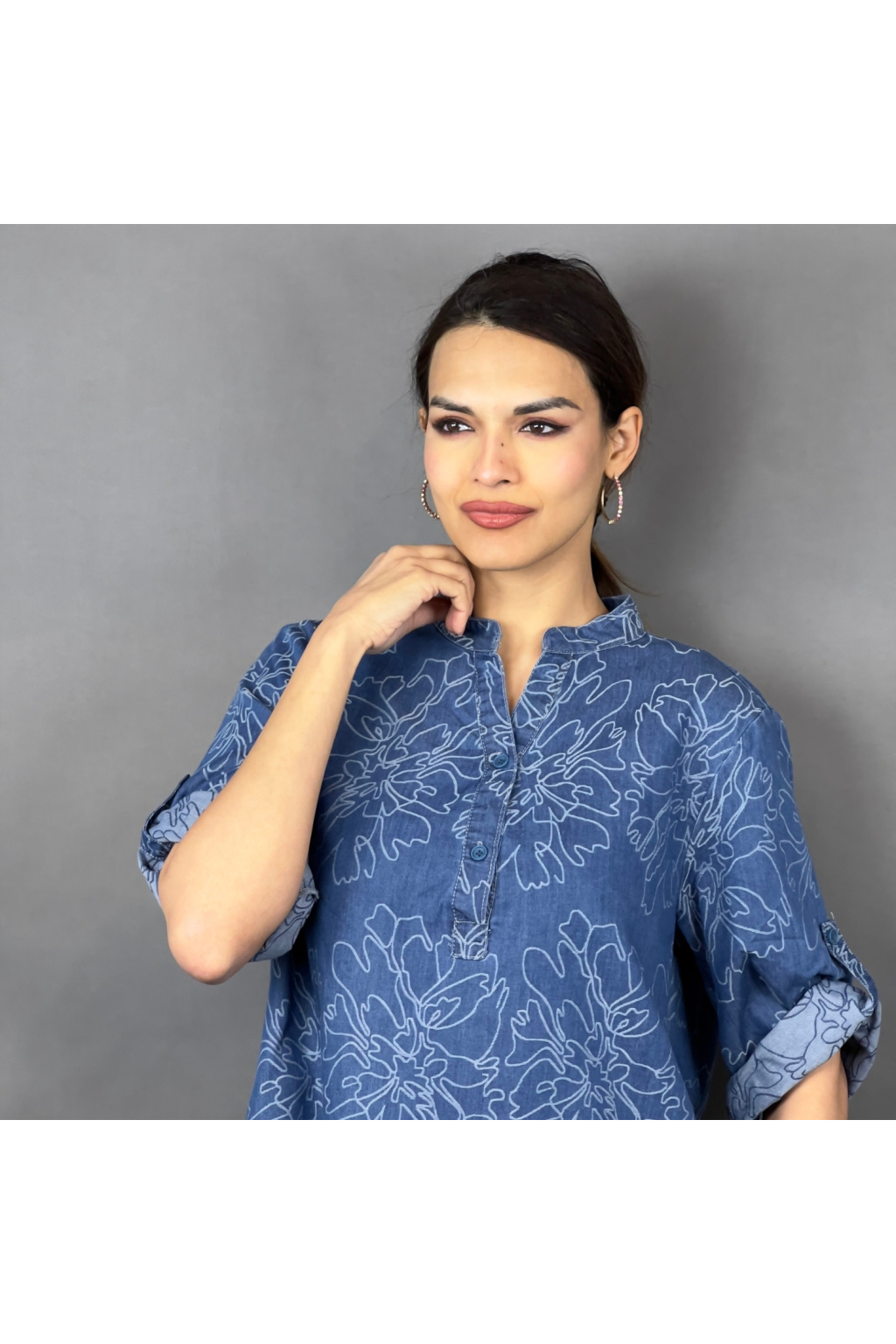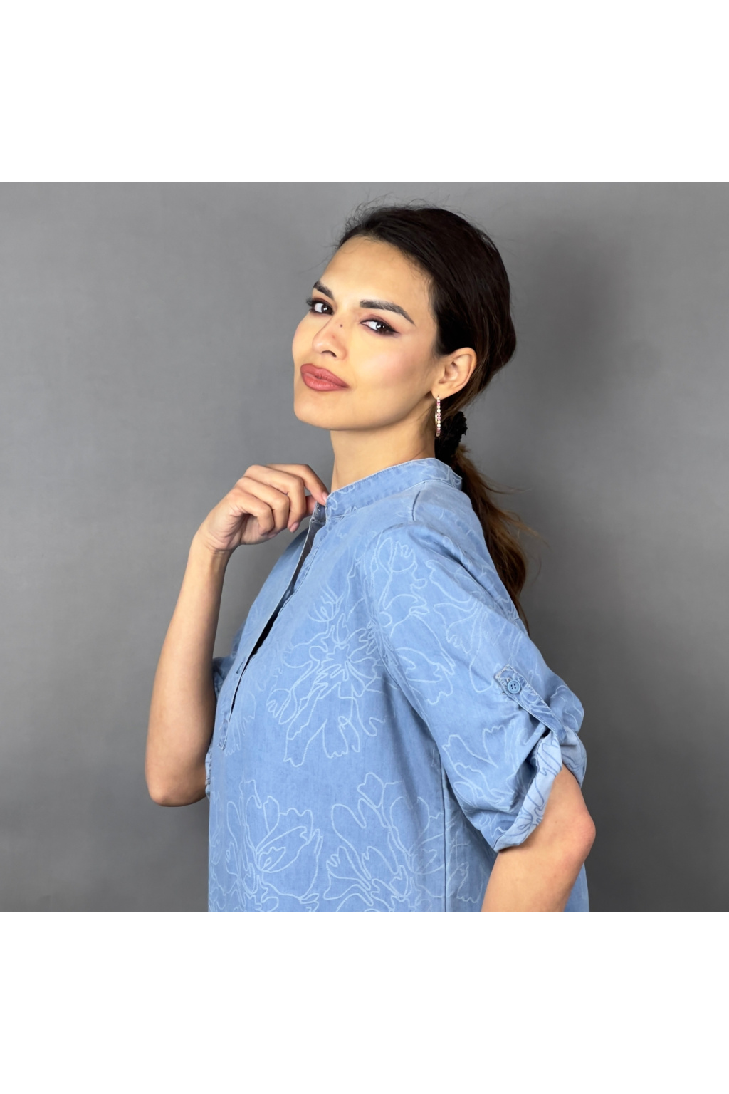 Top Raven je skvělou volbou pro ženy, které hledají spojení pohodlí a elegance. Jeho volný střih a jemný květinový vzor dodávají outfitu lehkost a ženskost. Rolovatelné rukávy s knoflíkovým zapínáním umožňují přizpůsobit styl podle potřeby, zatímco výstřih do V se stojáčkem dodává rafinovaný vzhled.