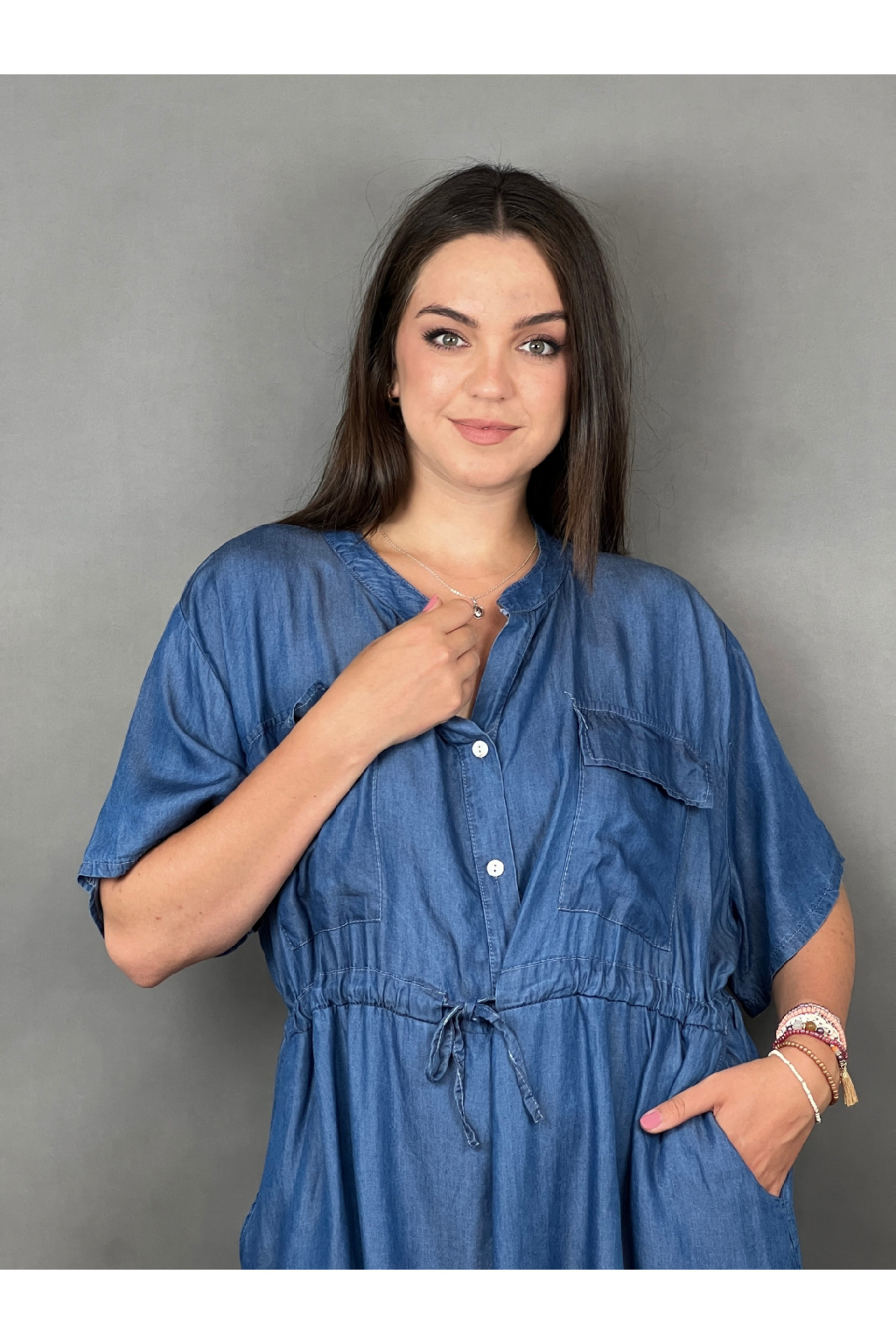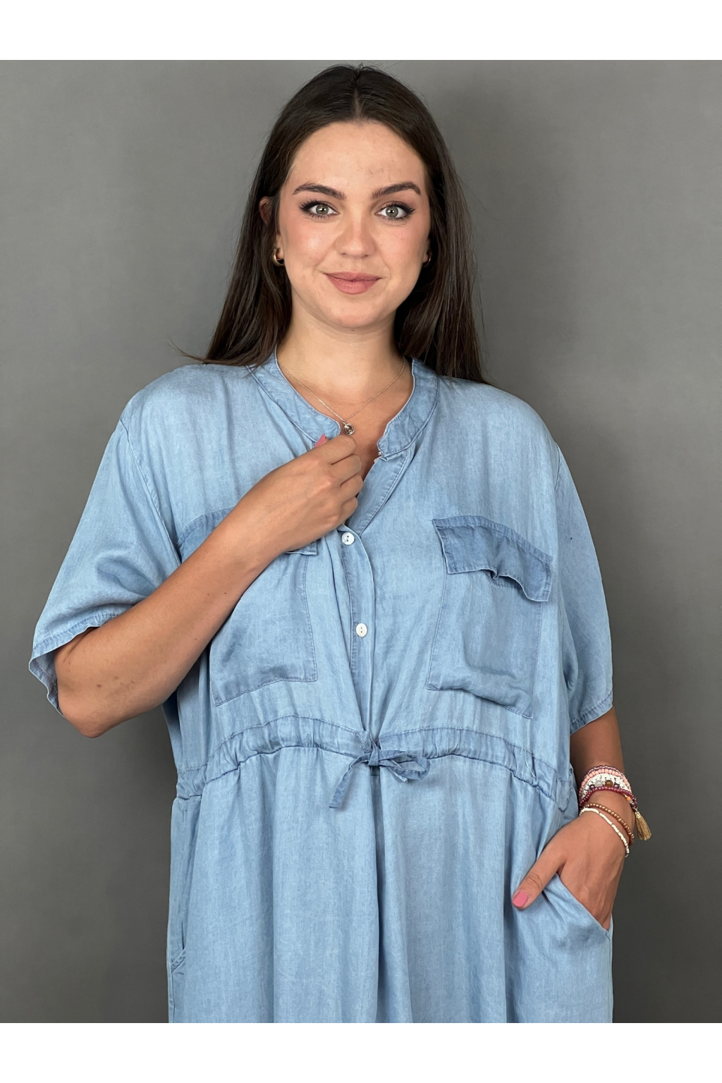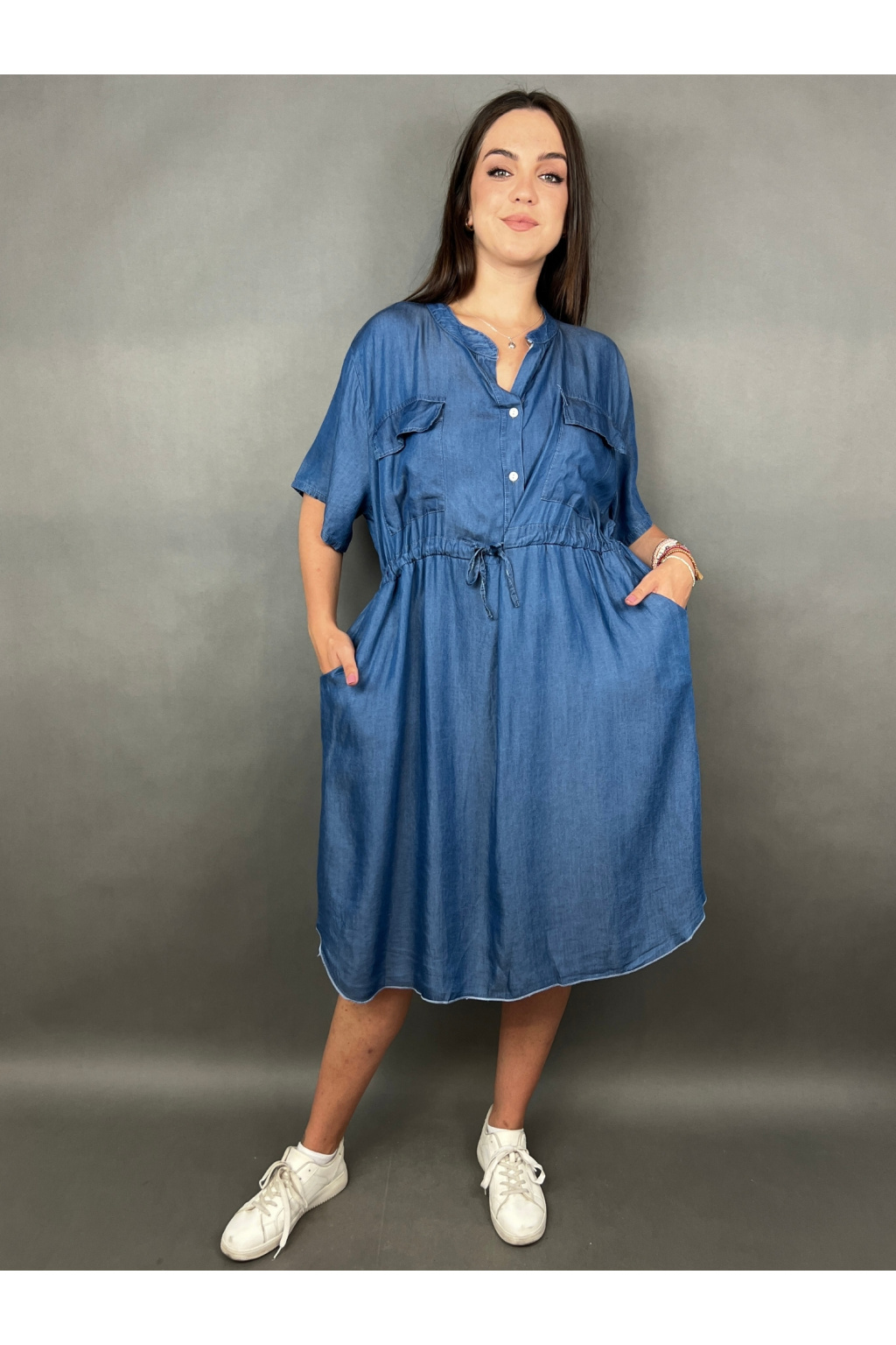 Džínový vzhled šatů dodává ležérní nádech, který skvěle vynikne v kombinaci s bílými teniskami, espadrilkami nebo sandálky. Délka ke kolenům a kapsy z nich dělají praktický a stylový kousek nejen do města.