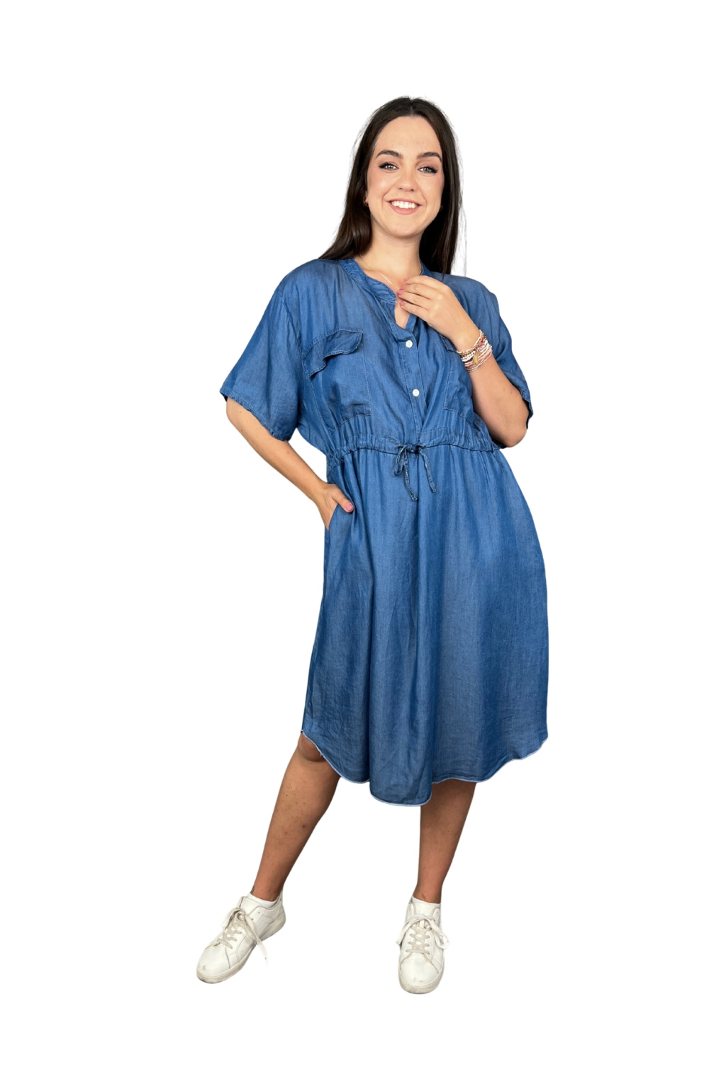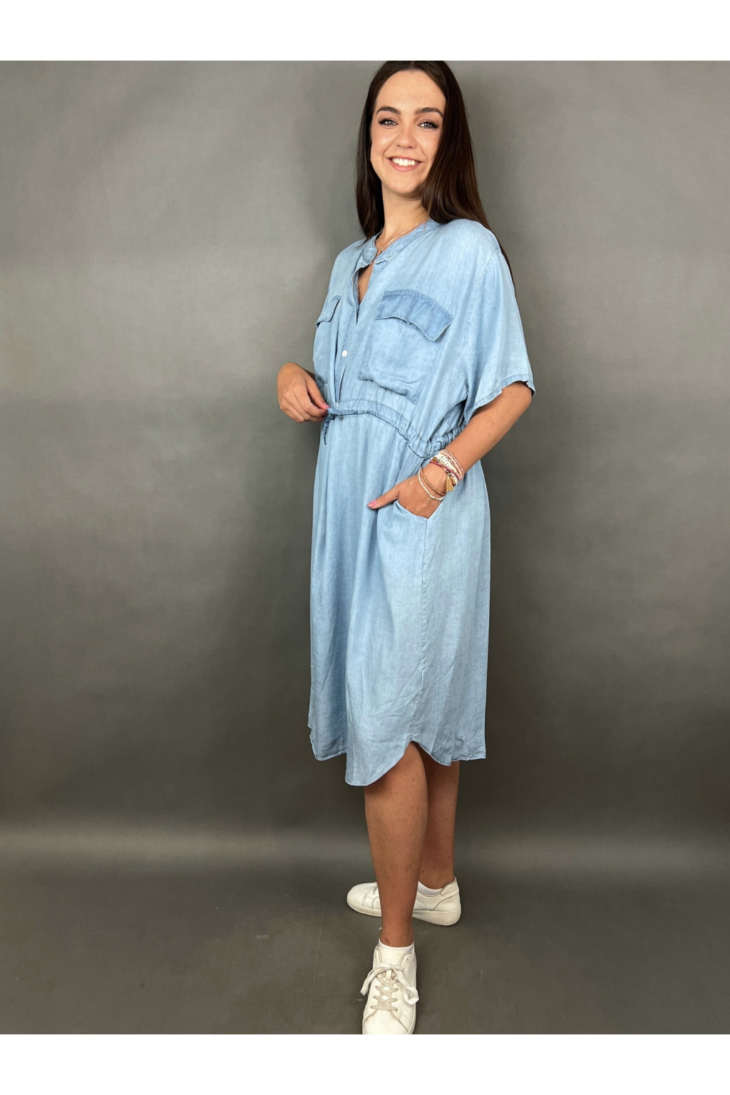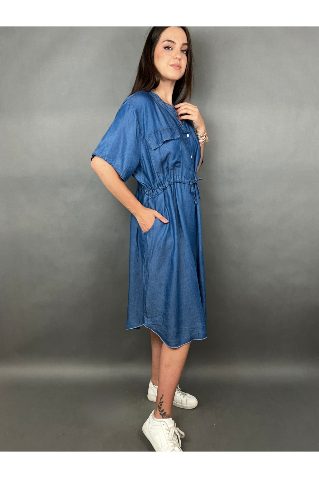 Džínový vzhled šatů dodává ležérní nádech, který skvěle vynikne v kombinaci s bílými teniskami, espadrilkami nebo sandálky. Délka ke kolenům a kapsy z nich dělají praktický a stylový kousek nejen do města.