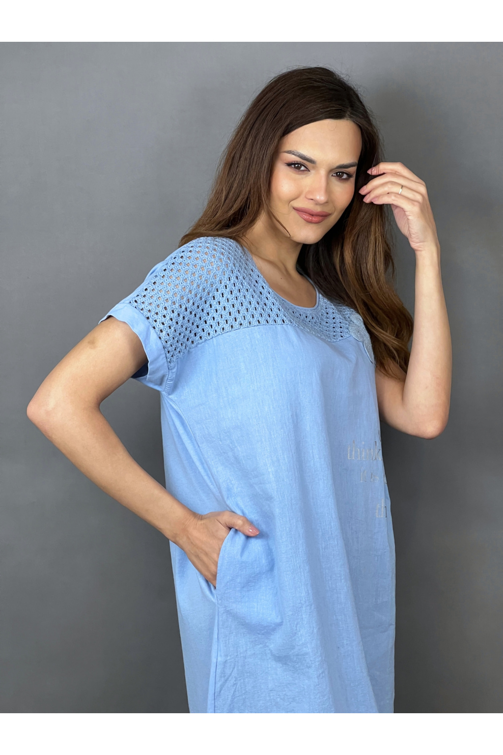Dominantním prvkem šatů je háčkovaná vrchní část s kulatým výstřihem, která decentně kontrastuje s hladkou spodní částí. Na hrudi je umístěn nápis s efektním stříbrným potiskem a výrazná květinová aplikace ve stejné barvě jako šaty. Volnější střih poskytuje naprostou volnost pohybu a přirozeně padne každé postavě.