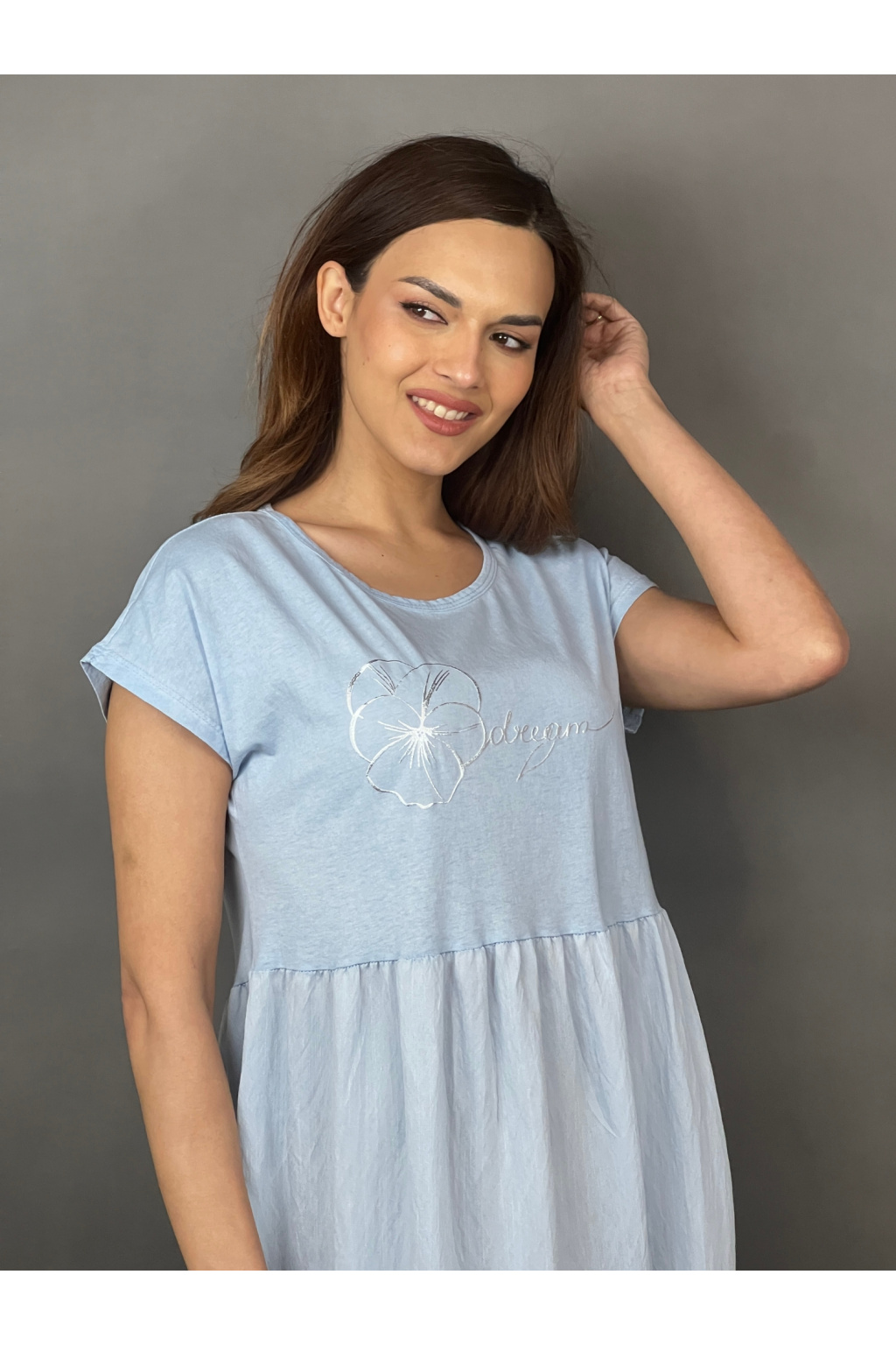Přední díl zdobí jemný potisk květiny s nápisem dream, který jim dodává moderní a hravý nádech. Krátké rukávy a kulatý výstřih podtrhují ležérní charakter tohoto pohodlného modelu. Délka ke kolenům či mírně pod ně je univerzálně nositelná a vhodná pro každodenní styling.