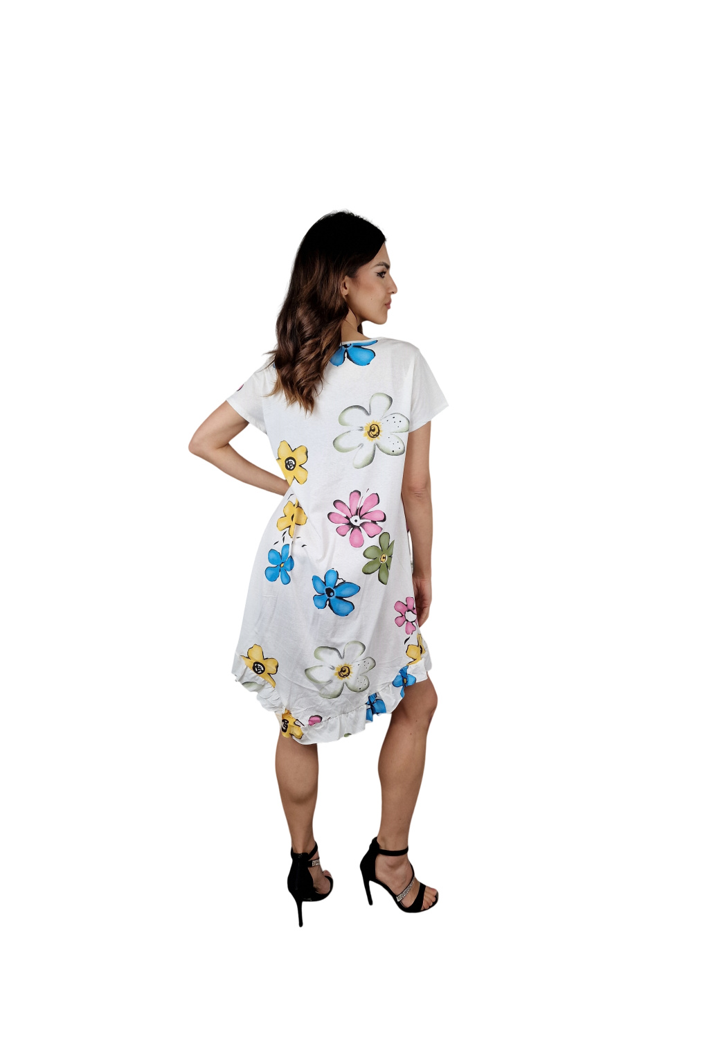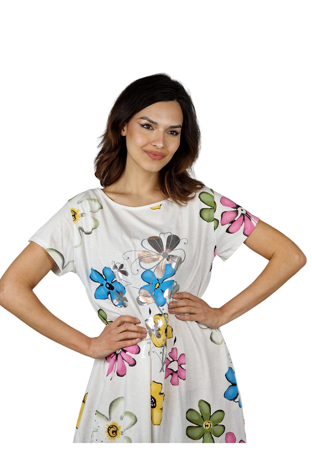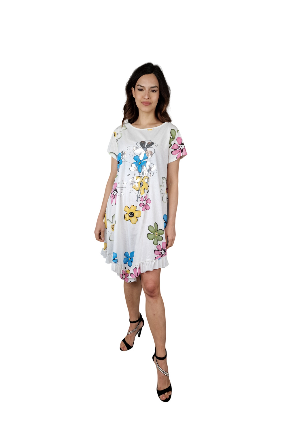 Šaty Elara jsou elegantním a pohodlným módním kouskem pro každou ženu. S krátkými rukávy a střední délkou jsou ideální pro denní nošení i speciální příležitosti. Jejich potisk s barevnými květy dodává šatům svěžest a živost.