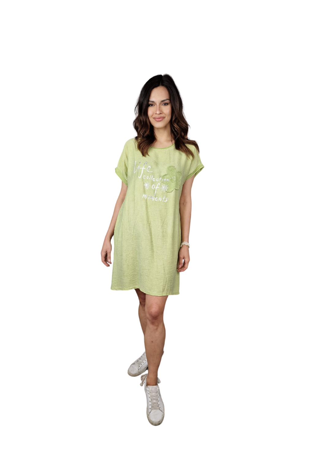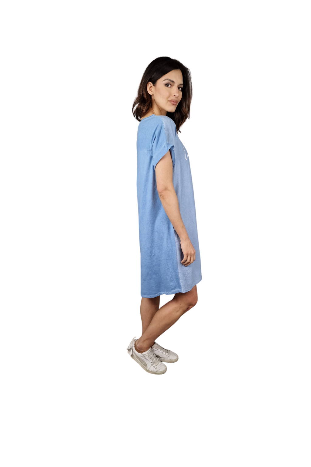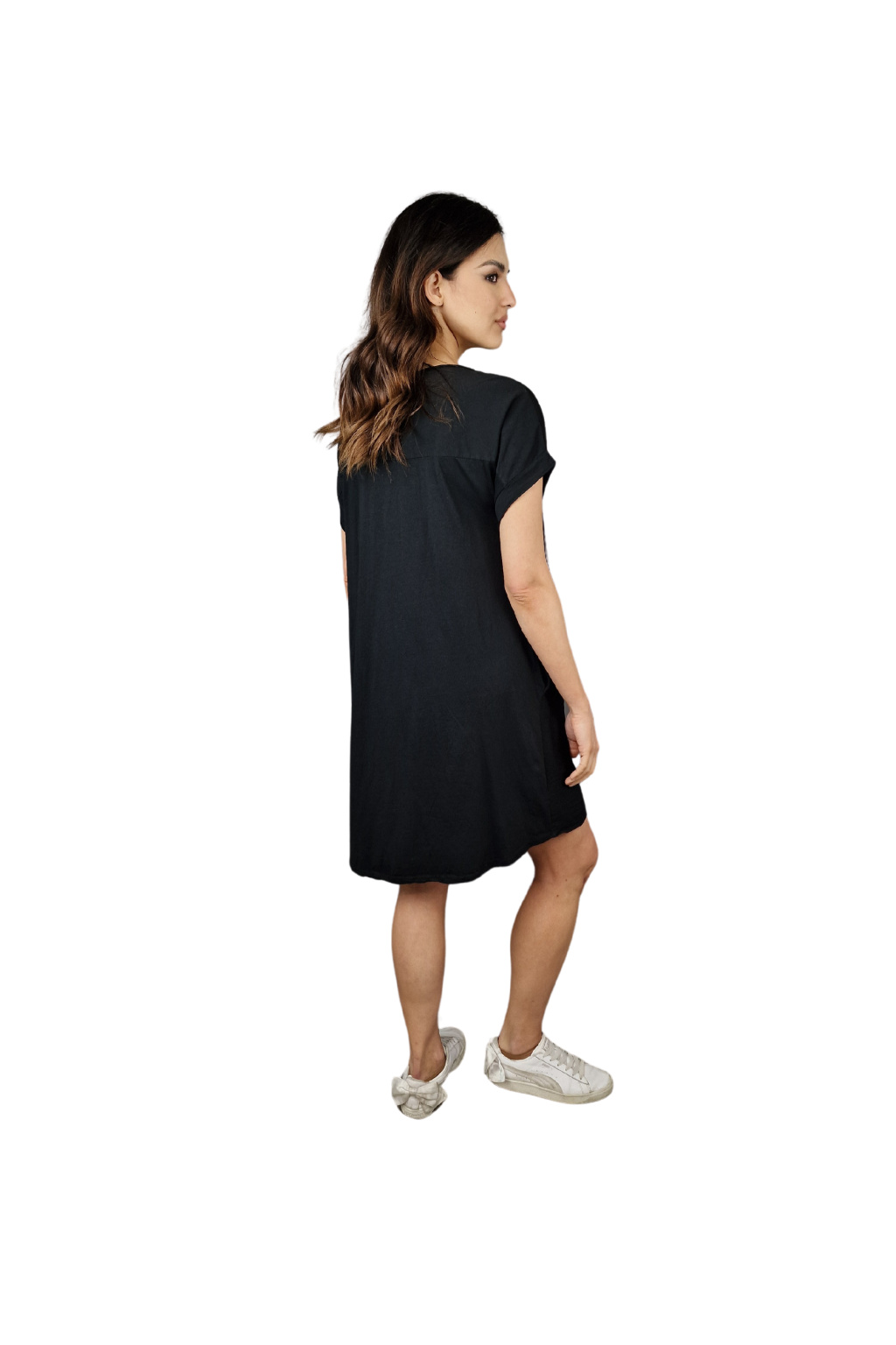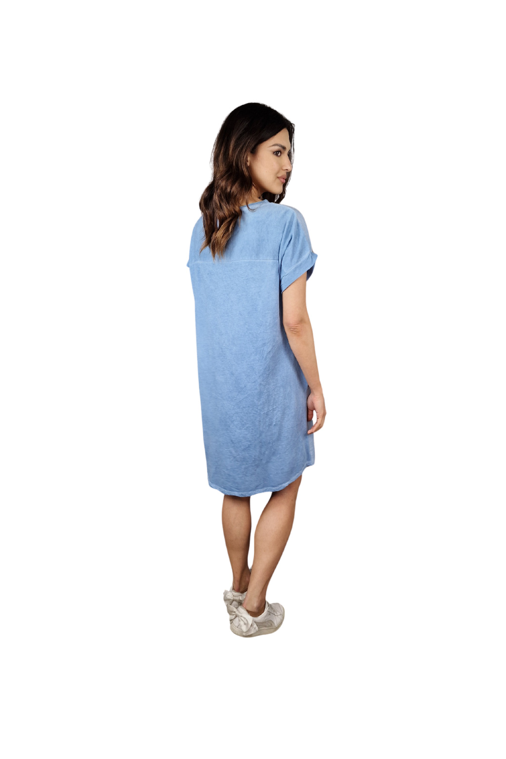Šaty mají volnější střih, který zajišťuje maximální komfort během nošení. Krátké rukávy jsou ideální pro letní pohodu, umožňují volnost pohybu a zároveň poskytují lehké zakrytí.