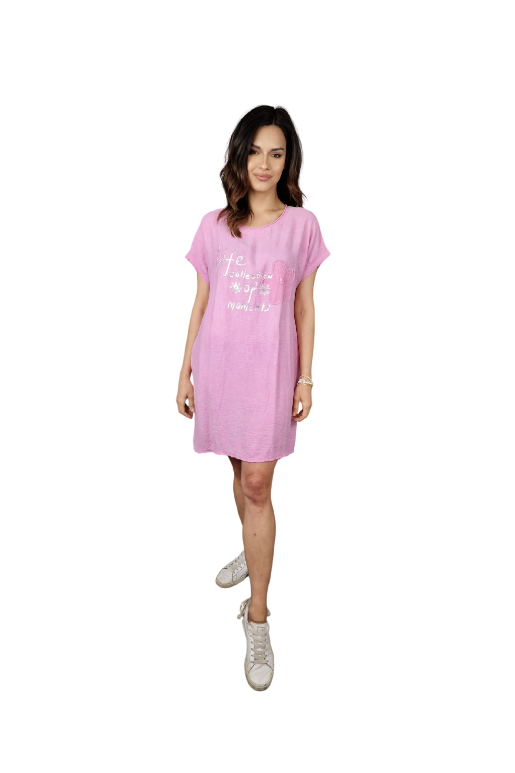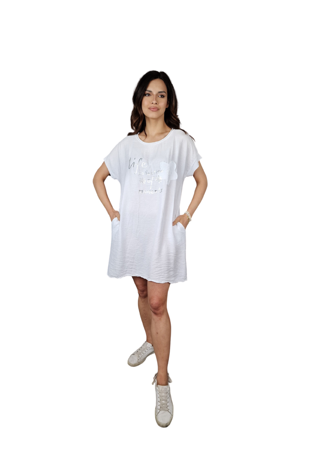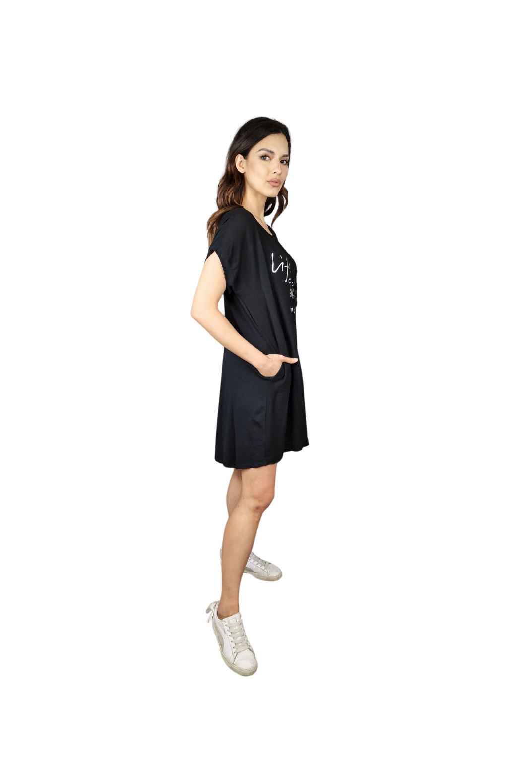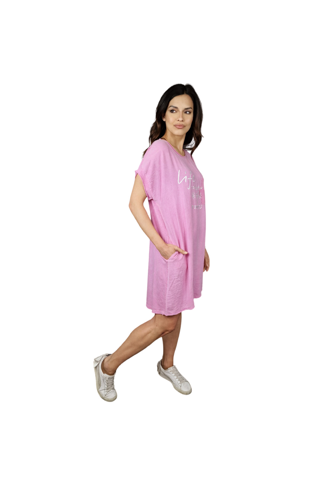 Design šatů Rosalie je ozvláštněn nápisovým potiskem, který dodává moderní a svěží vzhled. Pro praktické využití jsou šaty vybaveny kapsami po stranách, což zvyšuje jejich funkčnost.