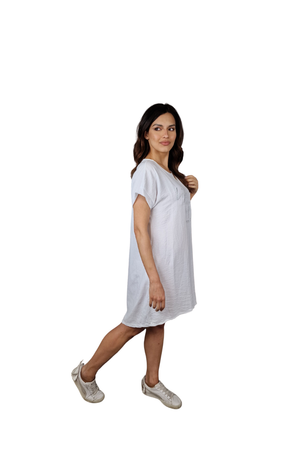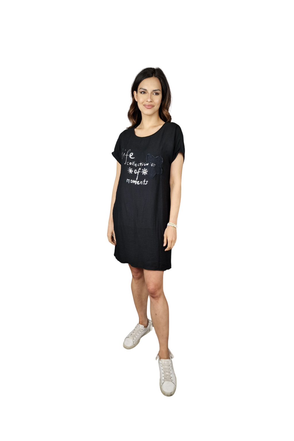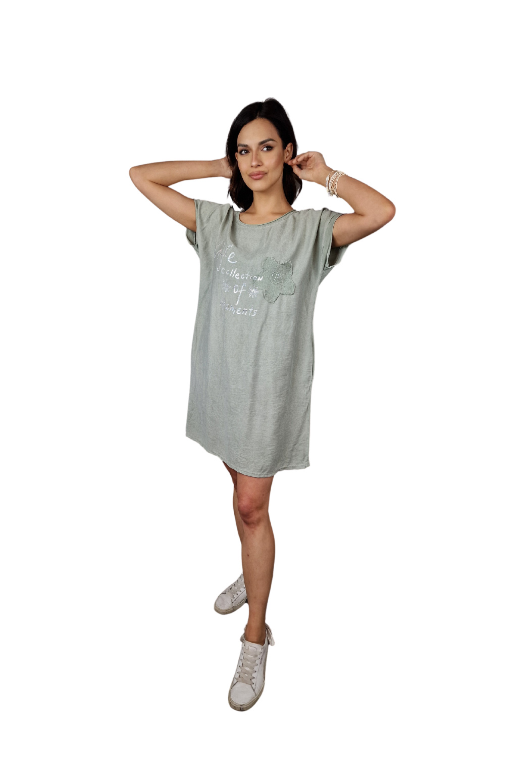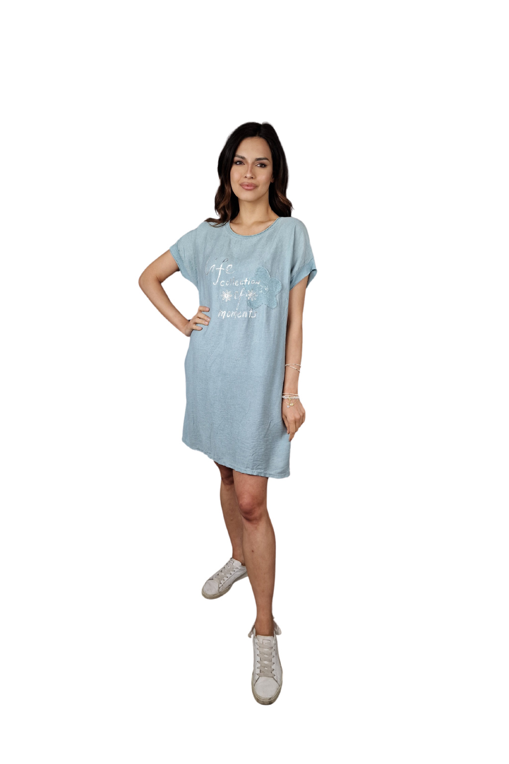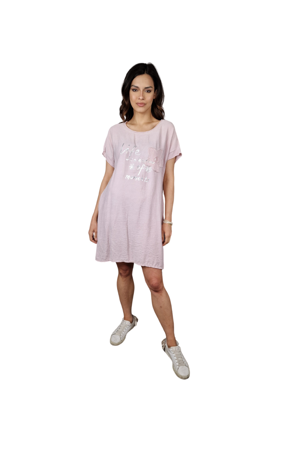 Design šatů Rosalie je ozvláštněn nápisovým potiskem, který dodává moderní a svěží vzhled. Pro praktické využití jsou šaty vybaveny kapsami po stranách, což zvyšuje jejich funkčnost.