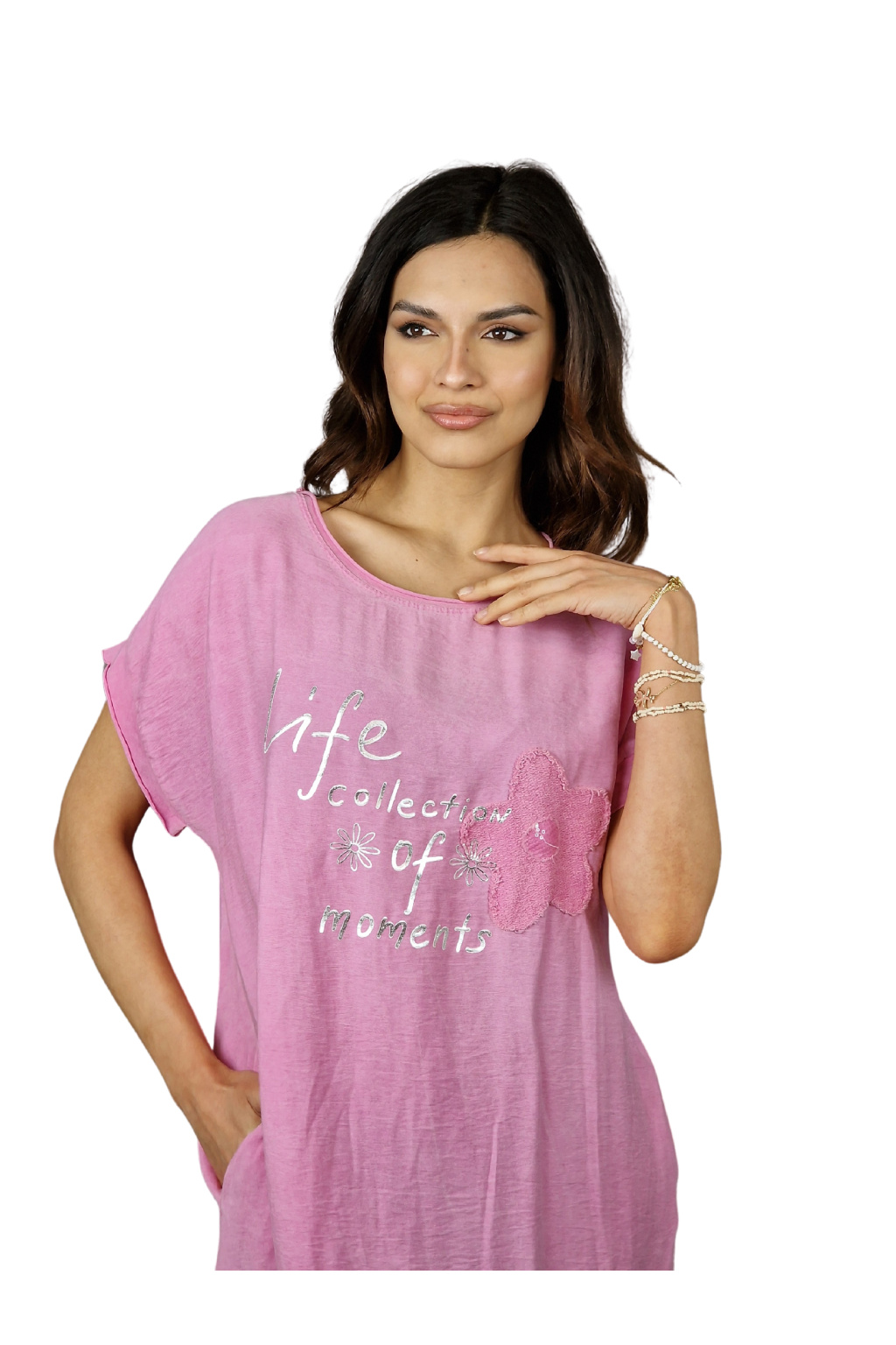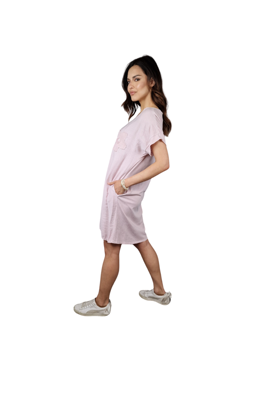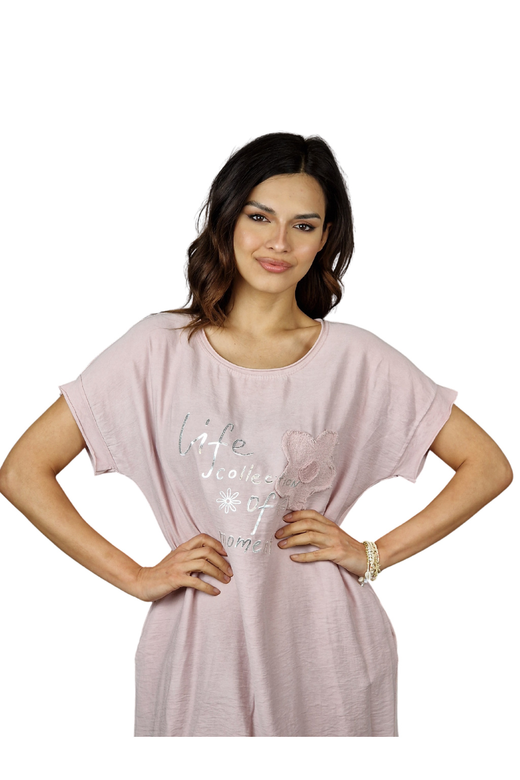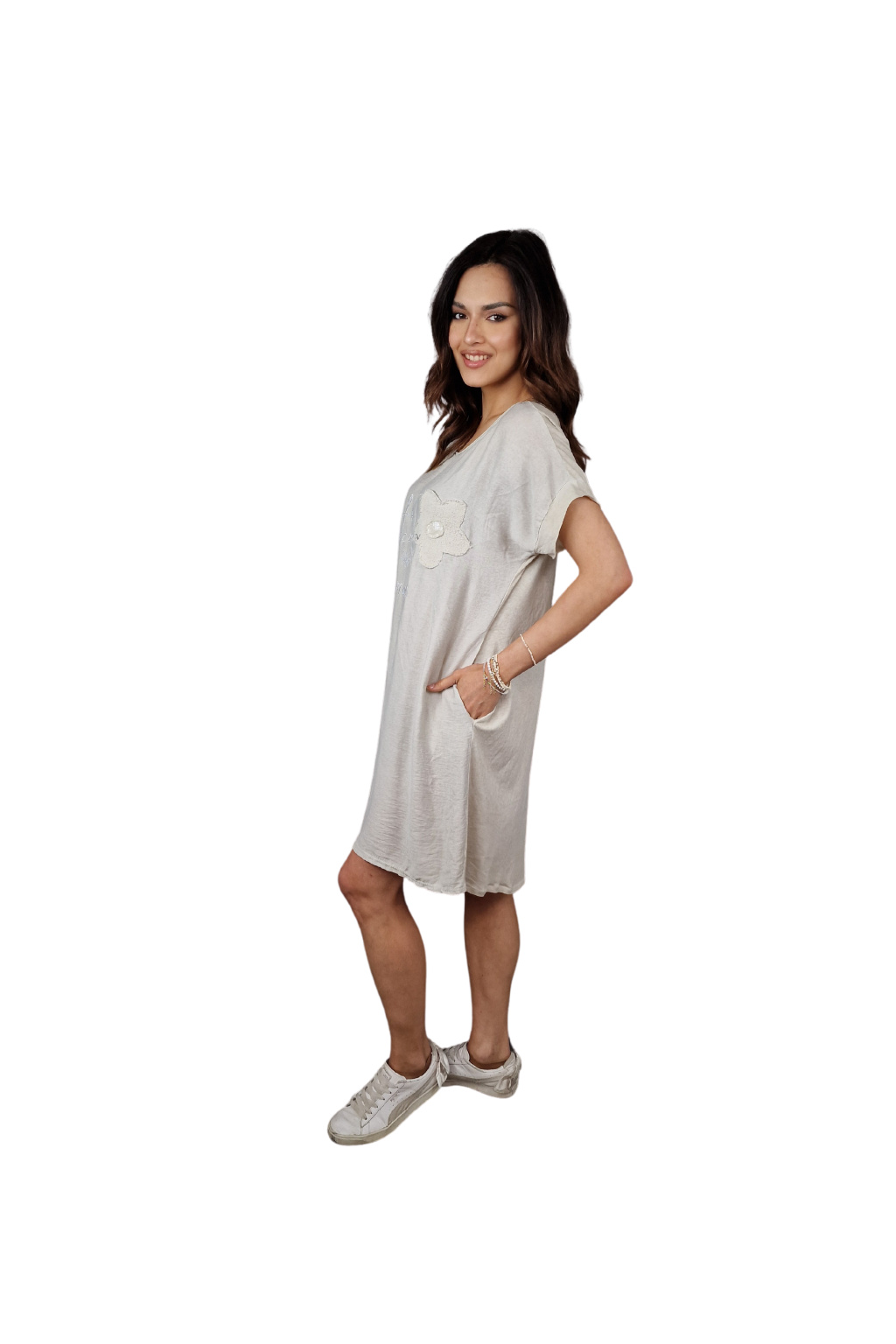 Design šatů Rosalie je ozvláštněn nápisovým potiskem, který dodává moderní a svěží vzhled. Pro praktické využití jsou šaty vybaveny kapsami po stranách, což zvyšuje jejich funkčnost.