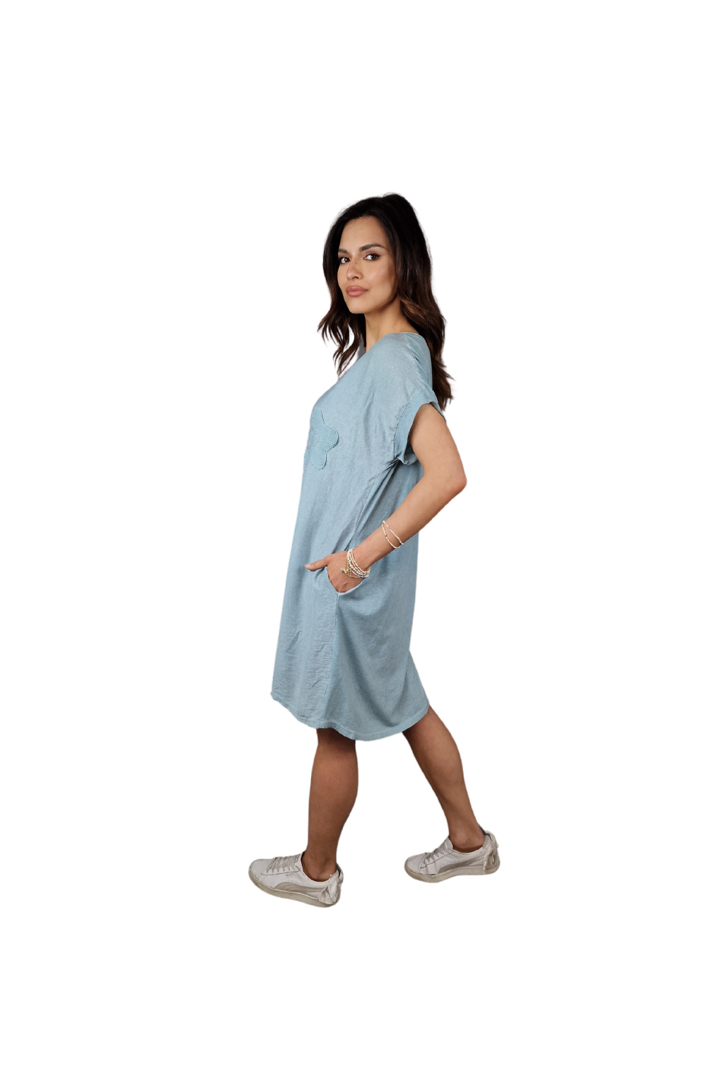 Materiál šatů je směs 50% bavlny a 50% viskózy, což zajišťuje příjemný a prodyšný pocit na pokožce. Tato kombinace materiálů je nejen pohodlná, ale také praktická, protože bavlna a viskóza jsou známé svými skvělými vlastnostmi pro letní oblečení.