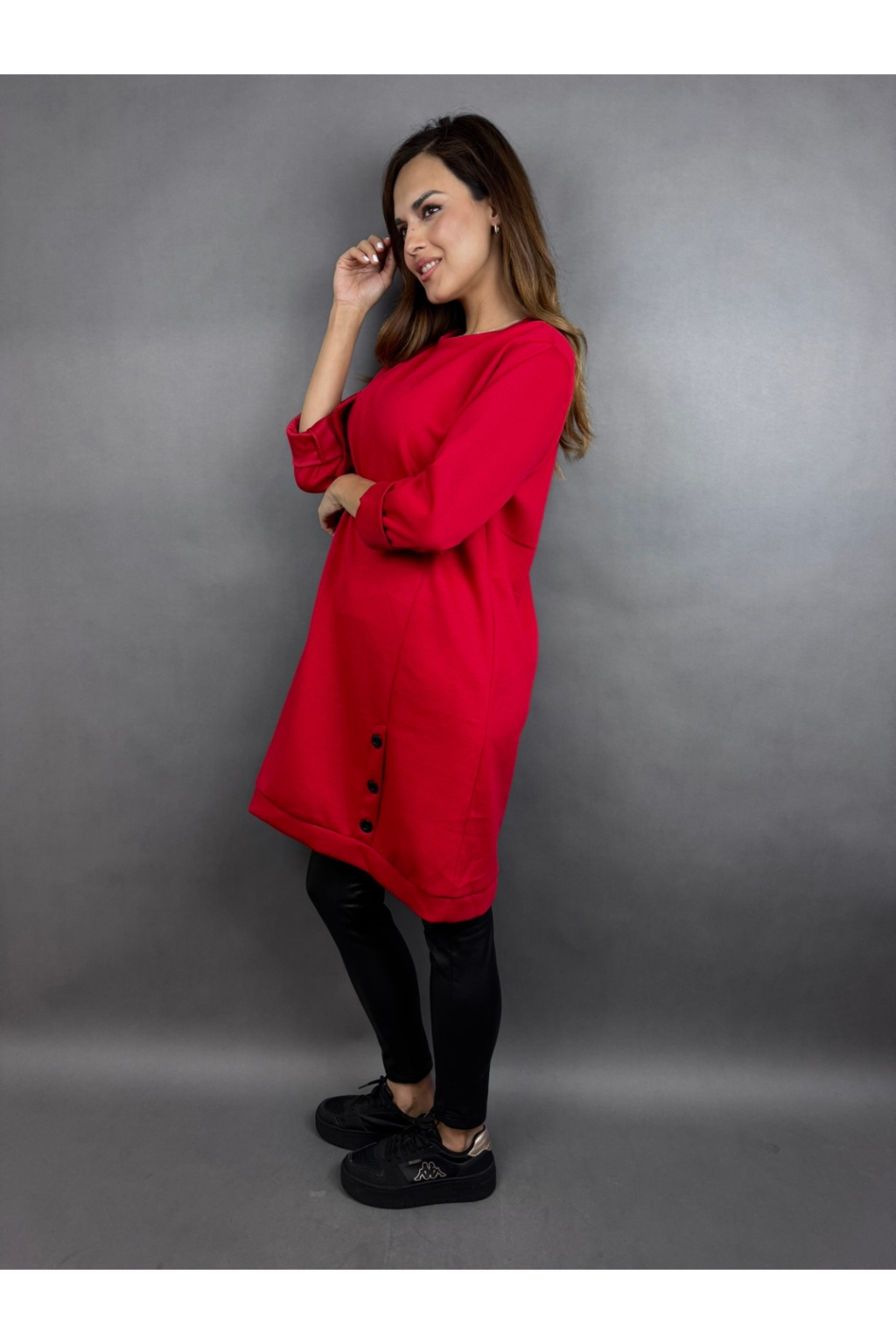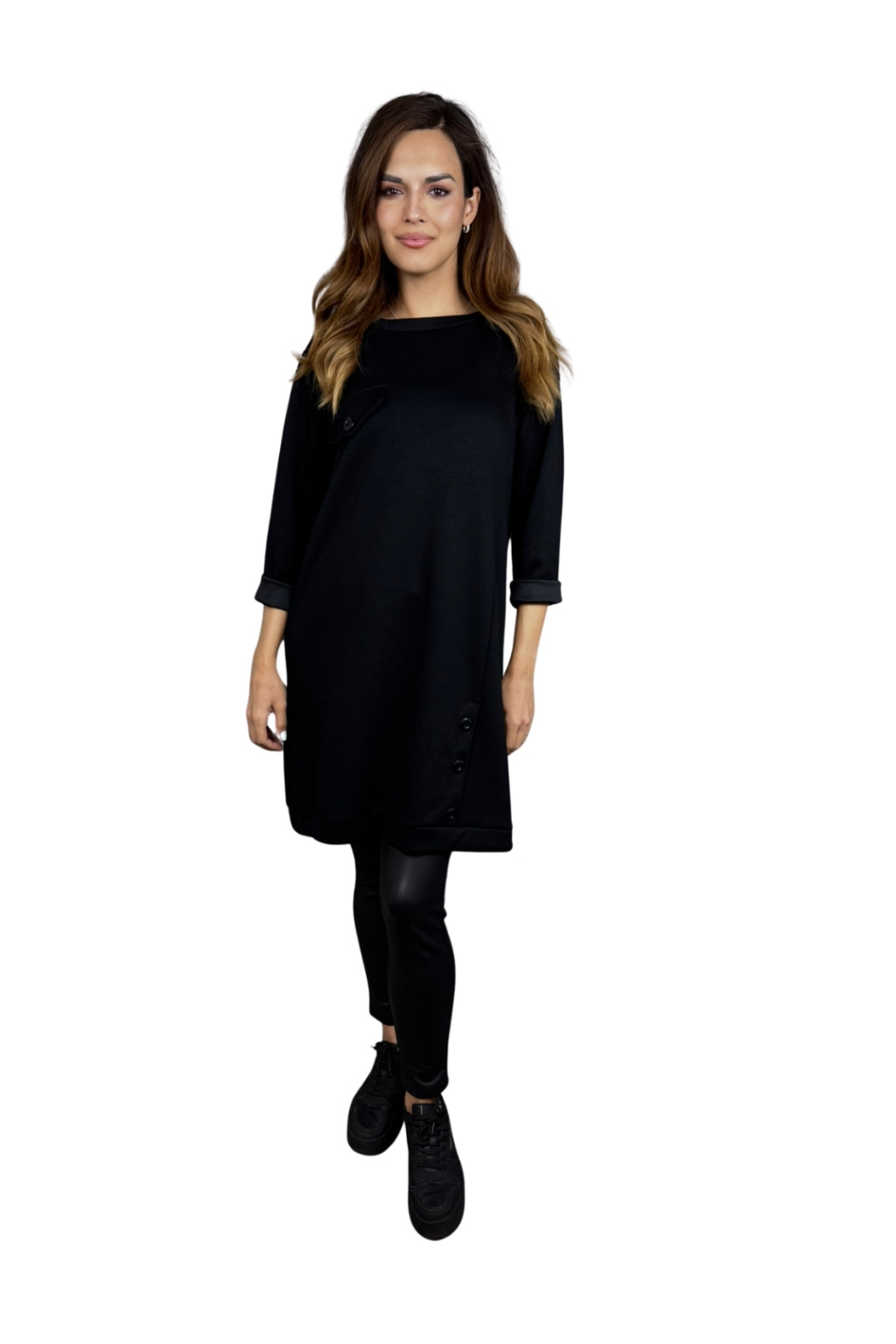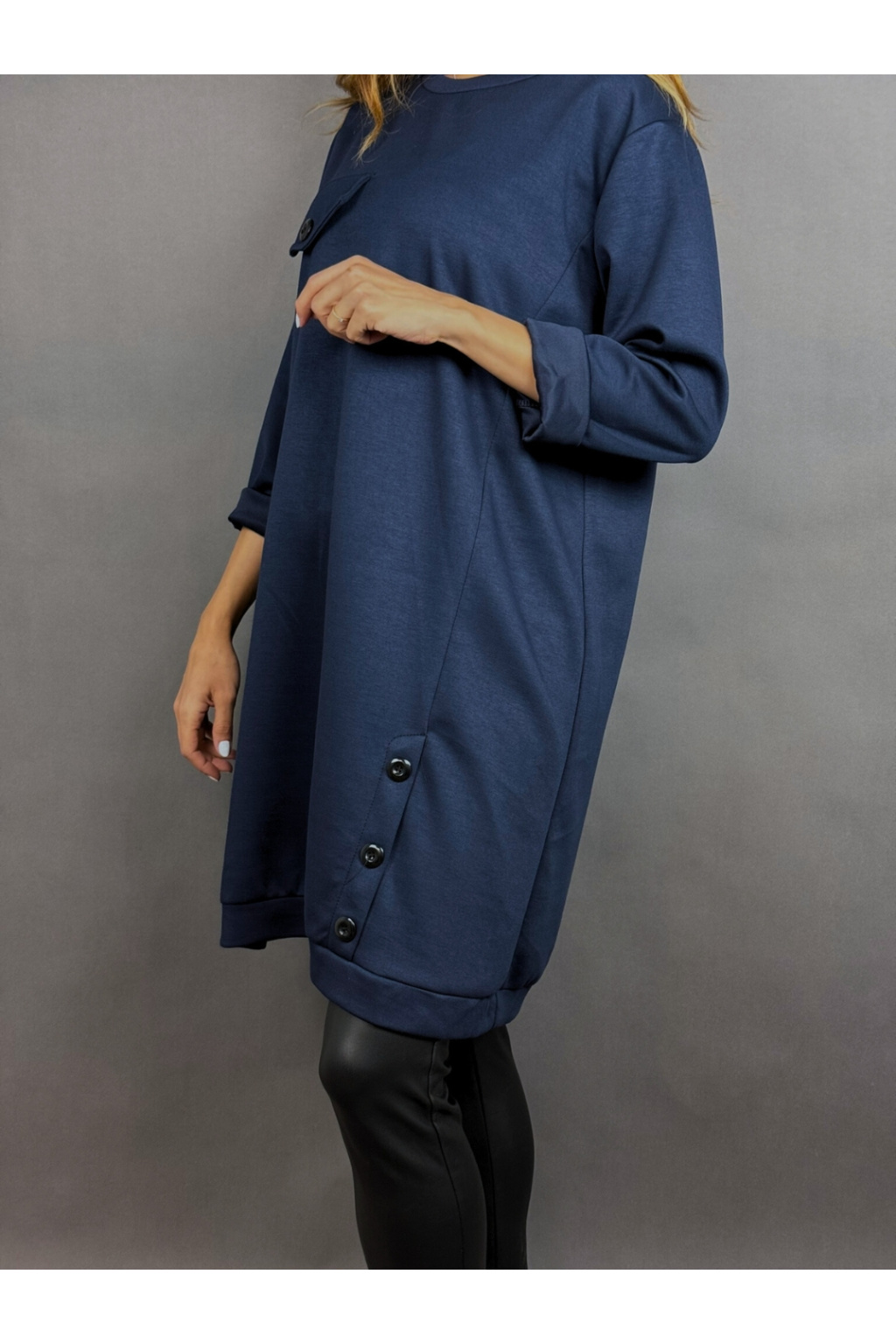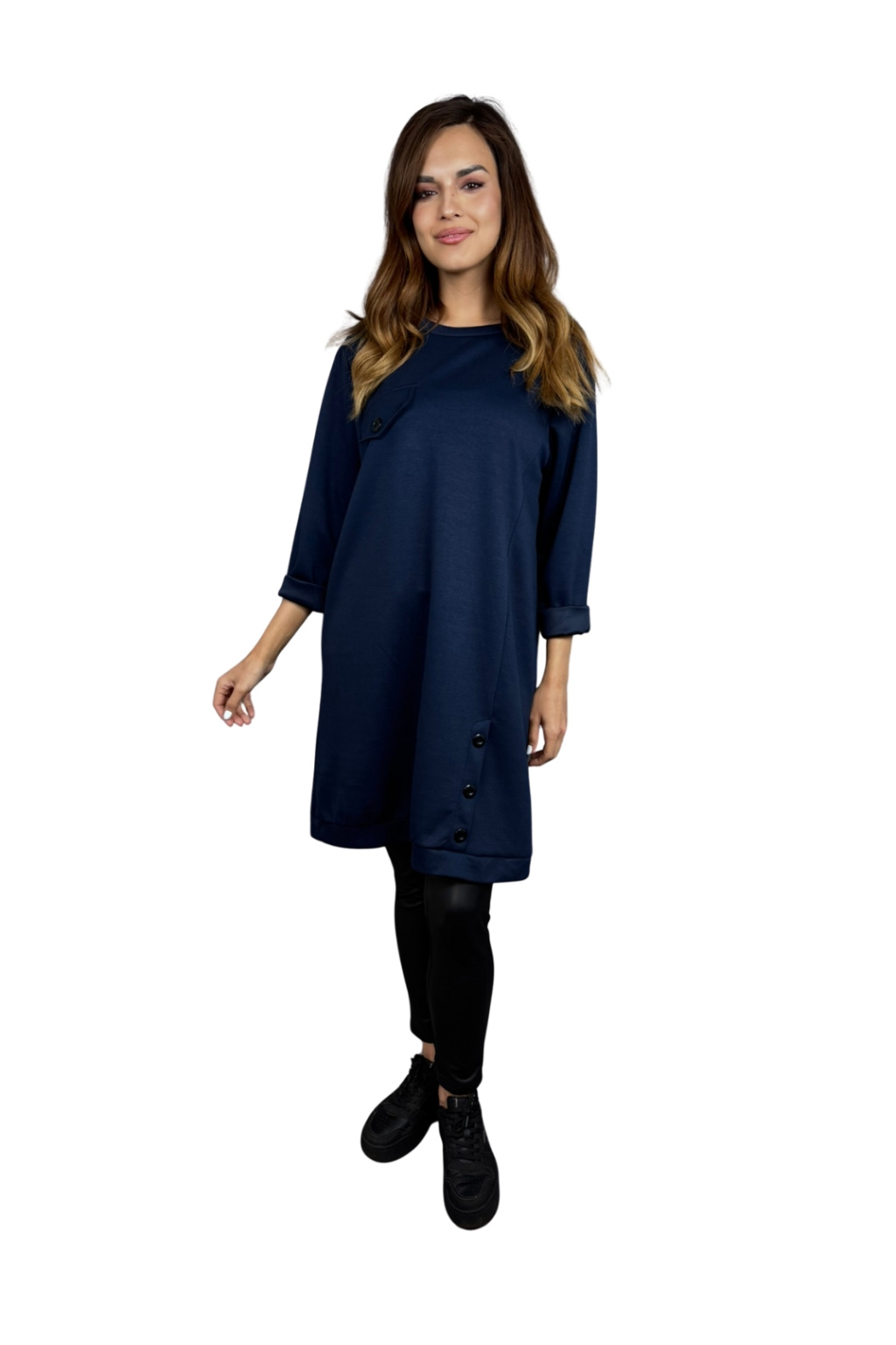 Šaty mají dlouhé rukávy s možností ohrnutí a ozdobné knoflíky po straně, které dodávají originální vzhled. Univerzální délka nad kolena umožňuje kombinovat šaty jak s legínami, tak se silonkami nebo džíny.