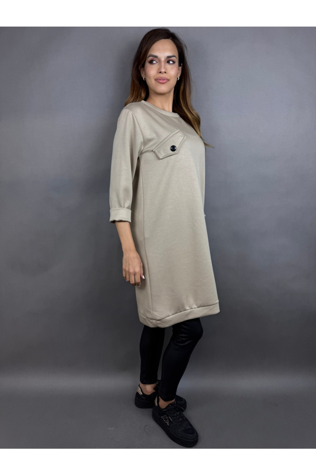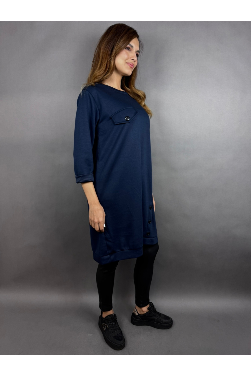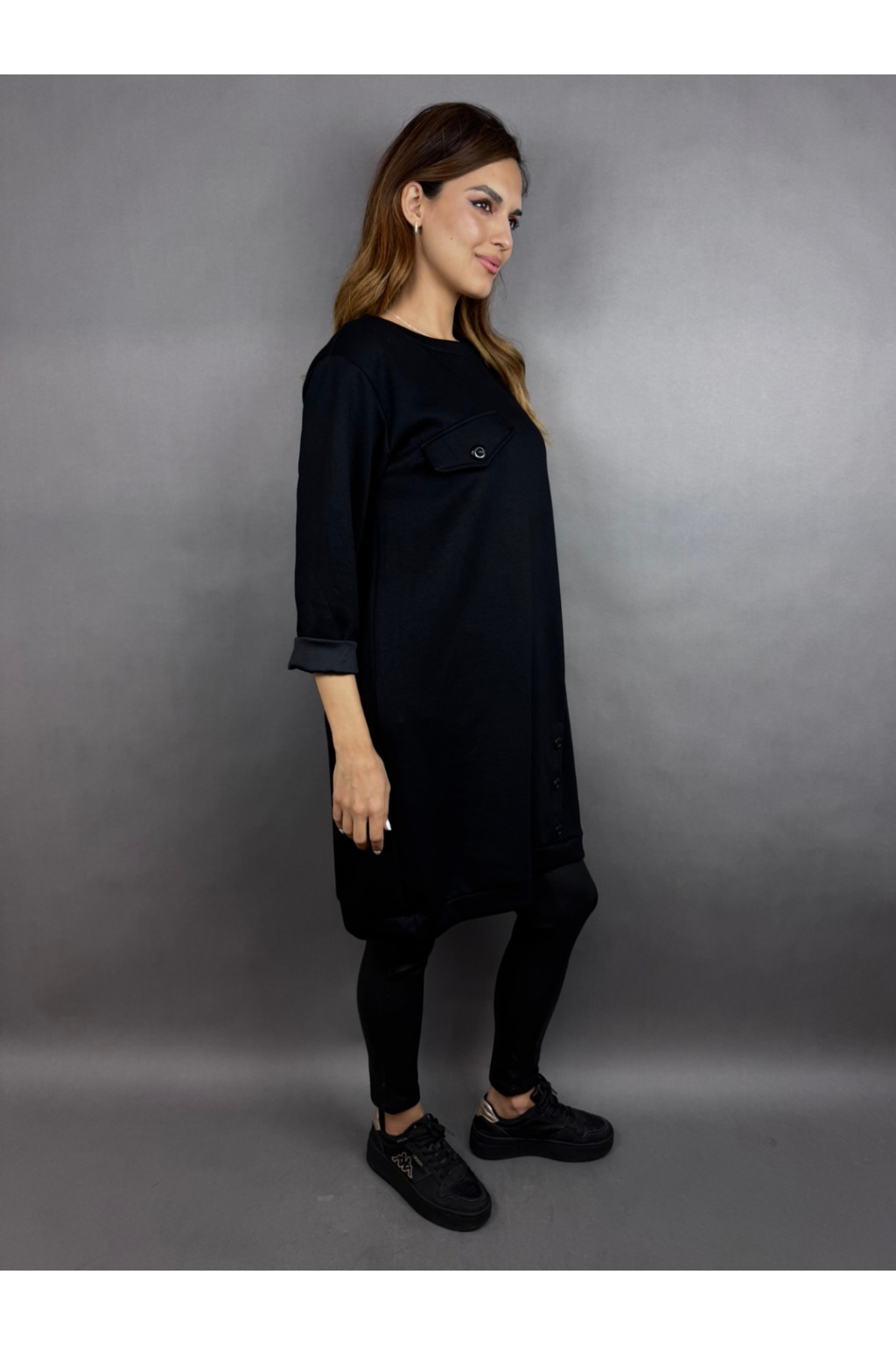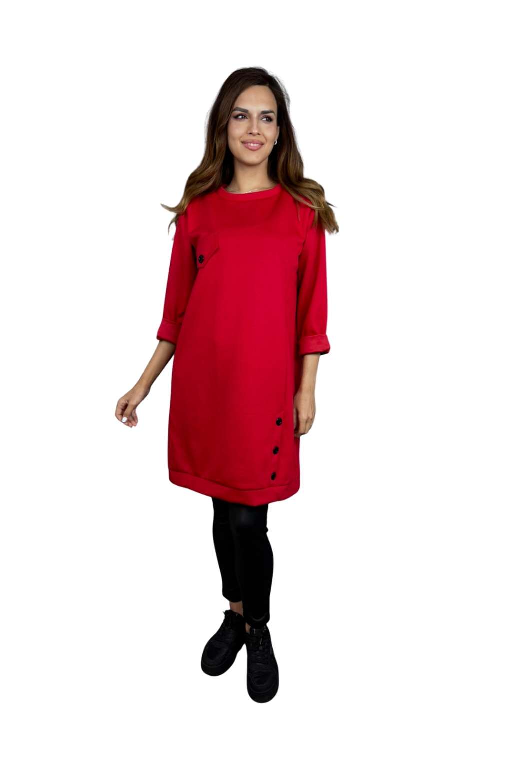 Šaty mají dlouhé rukávy s možností ohrnutí a ozdobné knoflíky po straně, které dodávají originální vzhled. Univerzální délka nad kolena umožňuje kombinovat šaty jak s legínami, tak se silonkami nebo džíny.