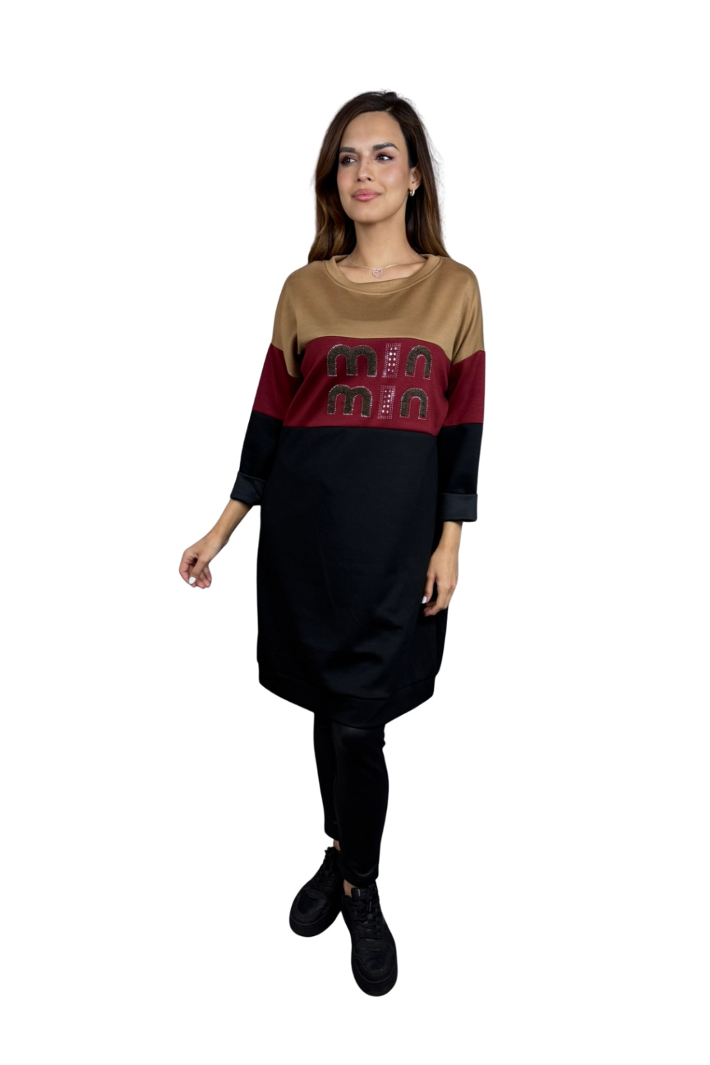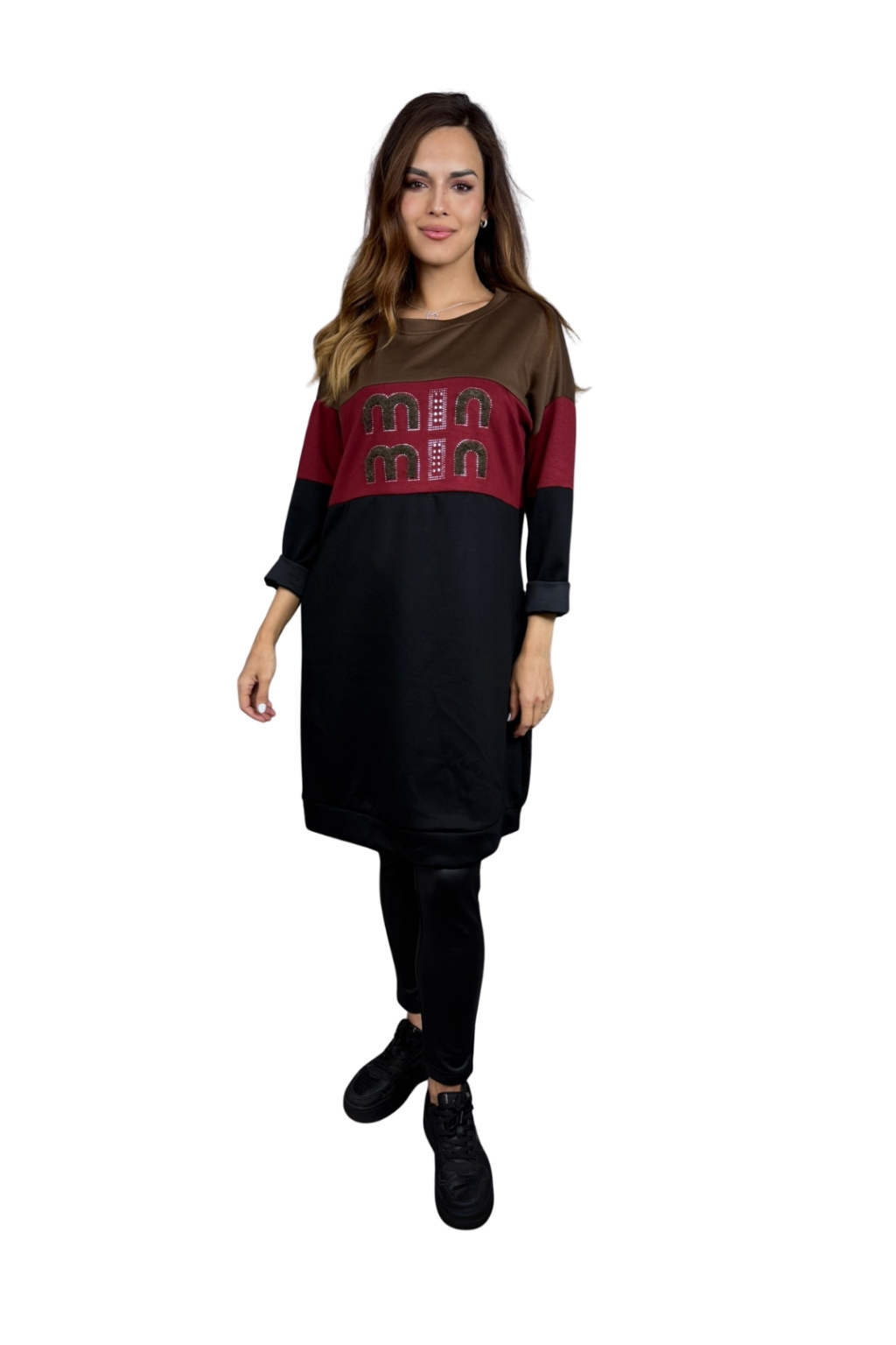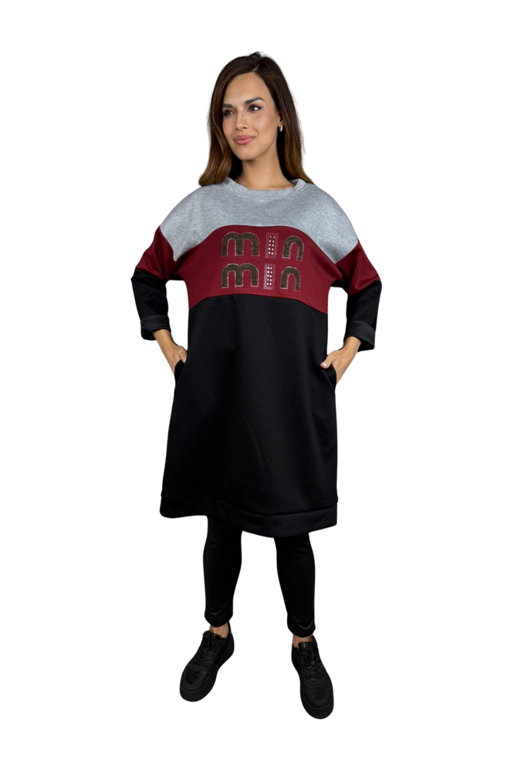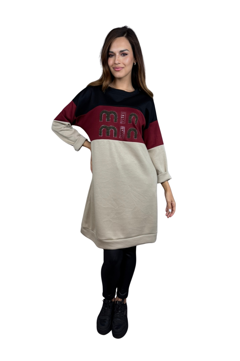 Dámské mikinové šaty Mariel spojují pohodlí mikiny s moderním designem. Barevné bloky a nápis s kamínky na hrudi jim dodávají jedinečný vzhled.