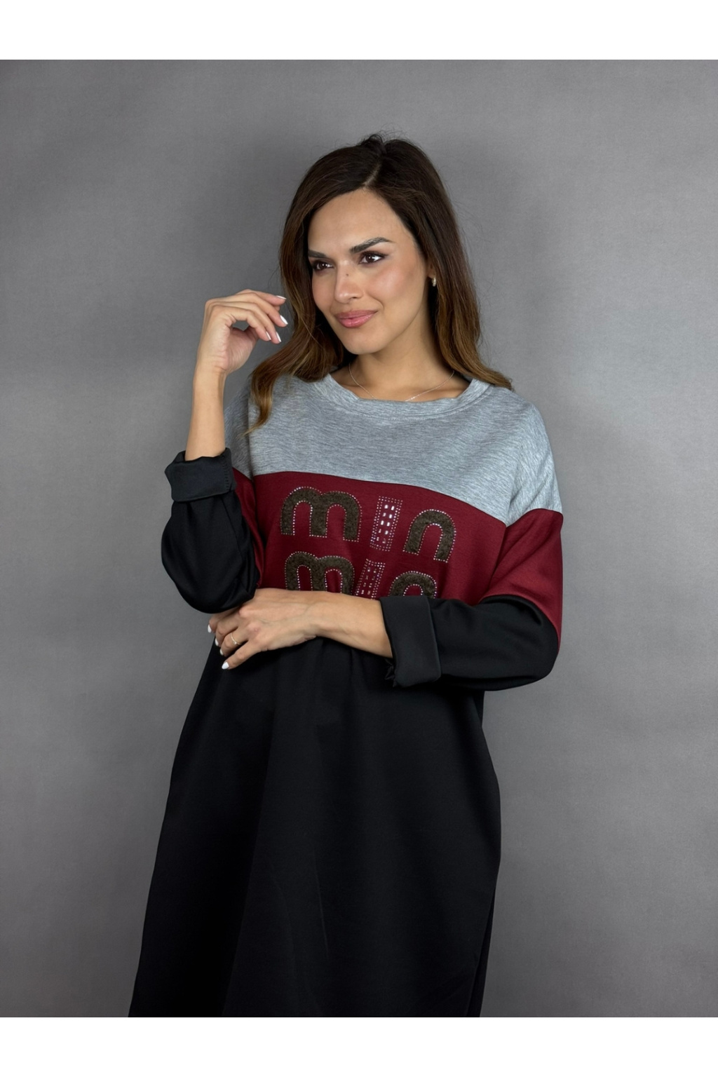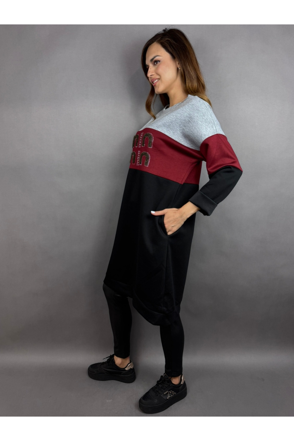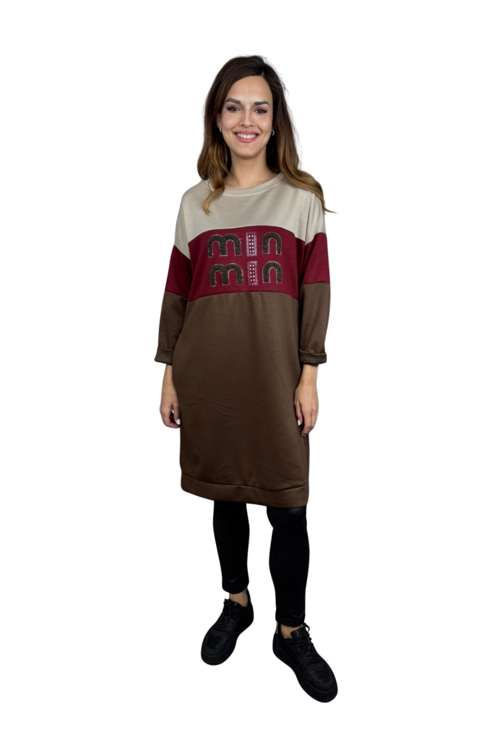 Dámské mikinové šaty Mariel spojují pohodlí mikiny s moderním designem. Barevné bloky a nápis s kamínky na hrudi jim dodávají jedinečný vzhled.