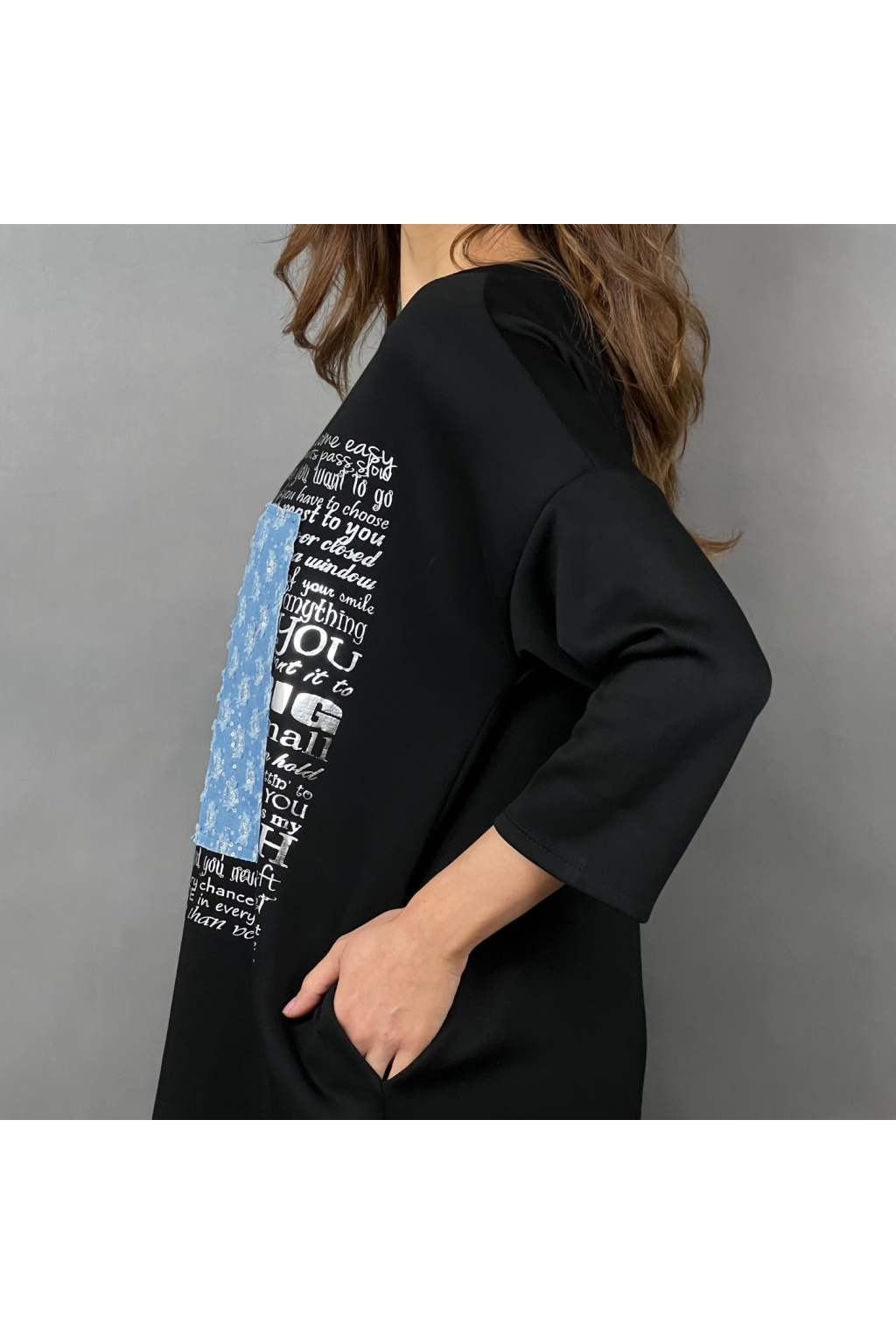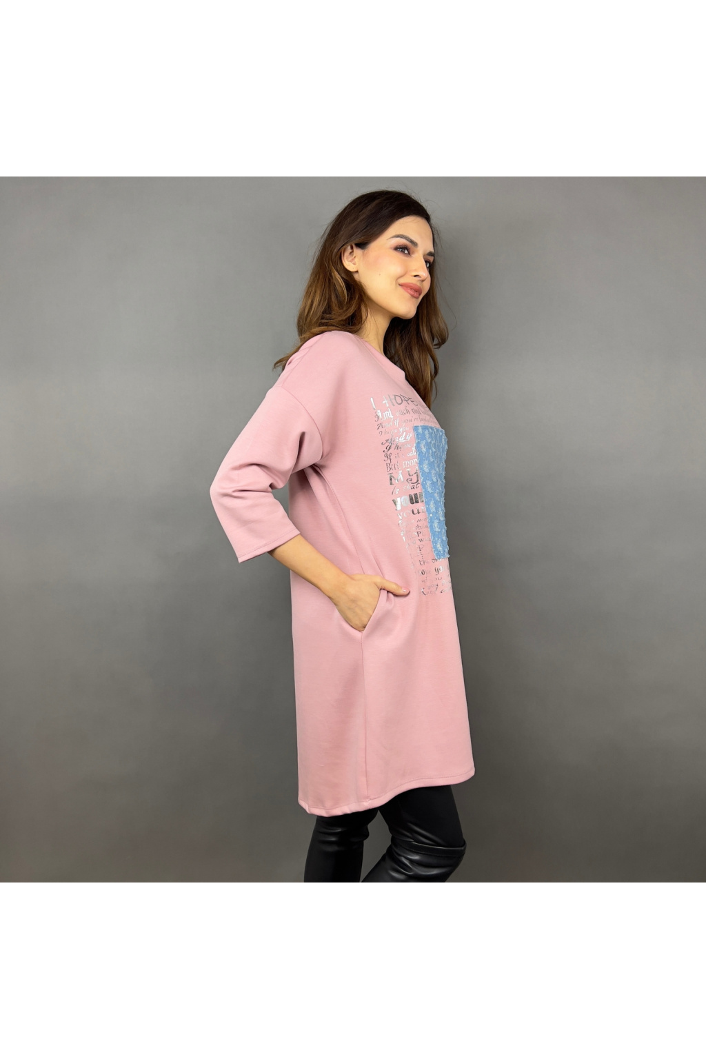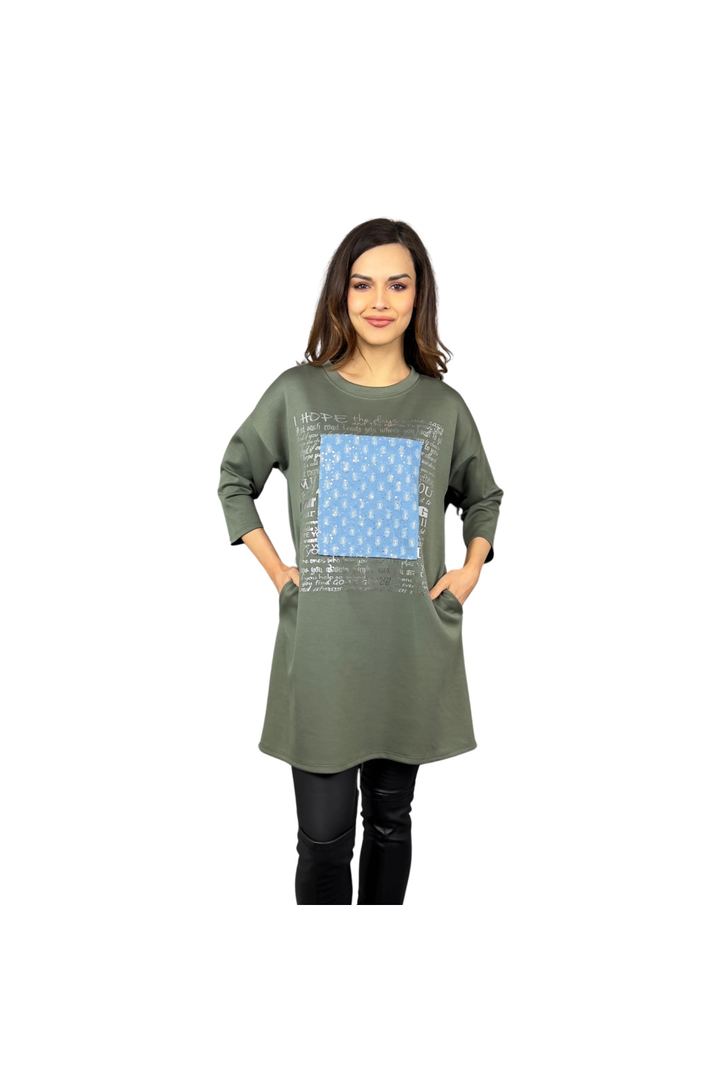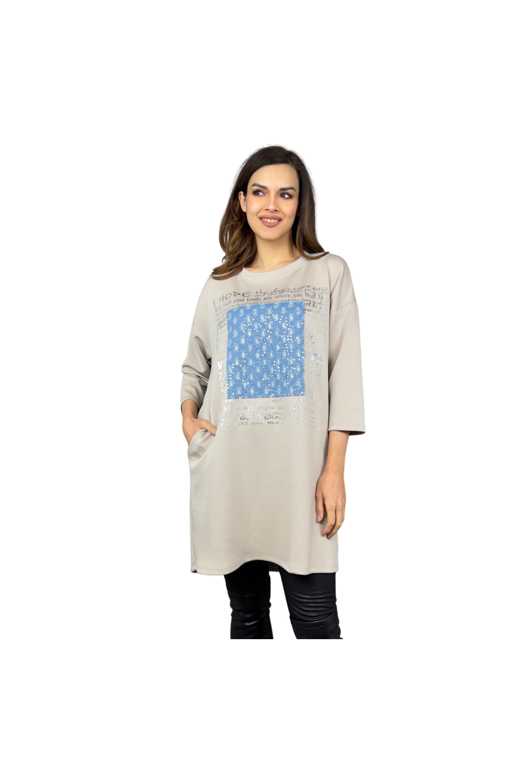 Mikinové šaty Defne spojují volný, moderní střih s ležérní elegancí. Díky dropshoulder rukávům a prodloužené délce jsou skvělou volbou pro ženy, které hledají pohodlí bez kompromisů ve stylu. Šaty zdobí originální potisk s denimovým efektem a třpytivými detaily, které dodávají celkovému vzhledu jedinečnost. Praktické boční kapsy zajišťují ještě větší komfort při nošení.