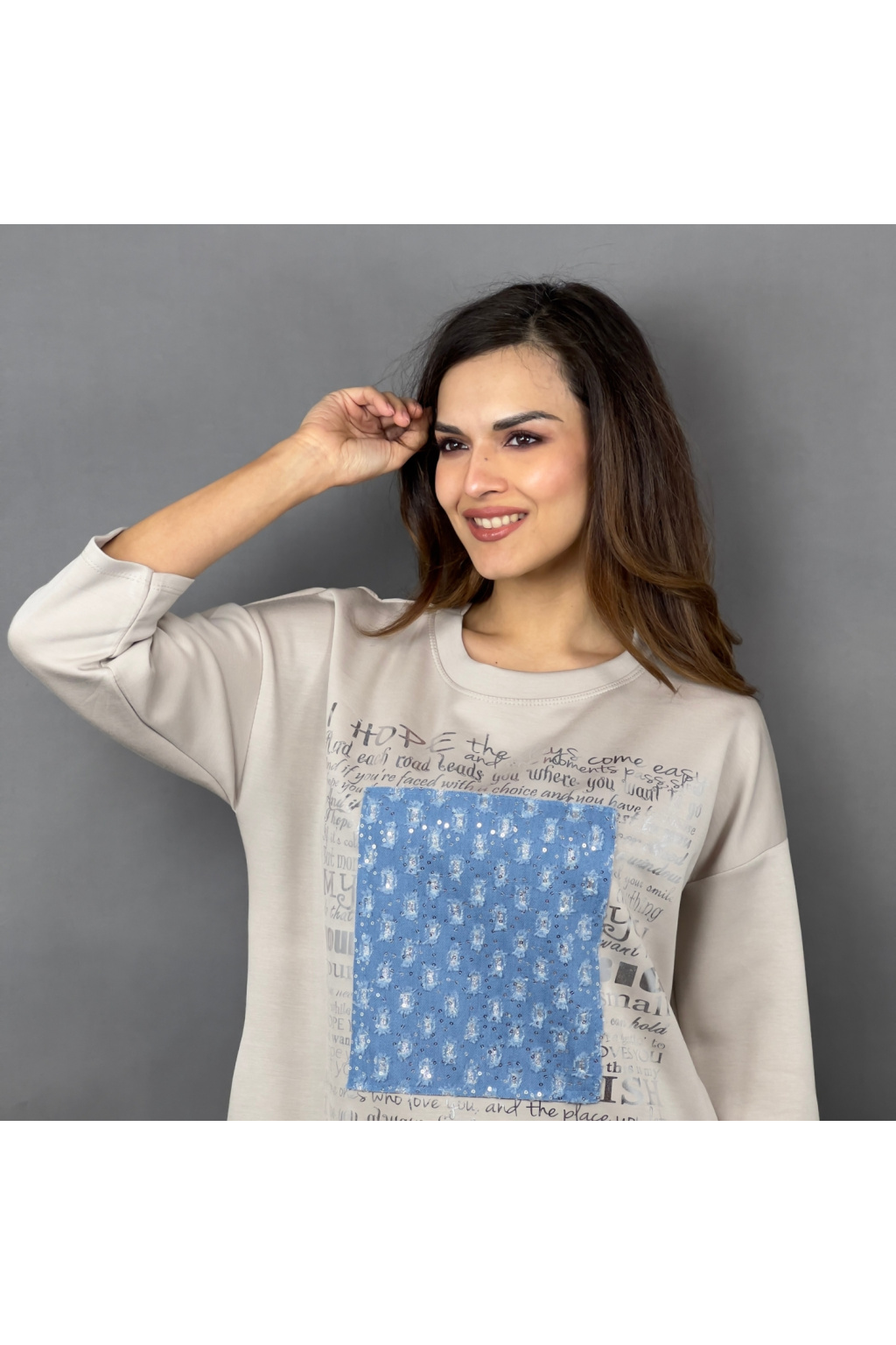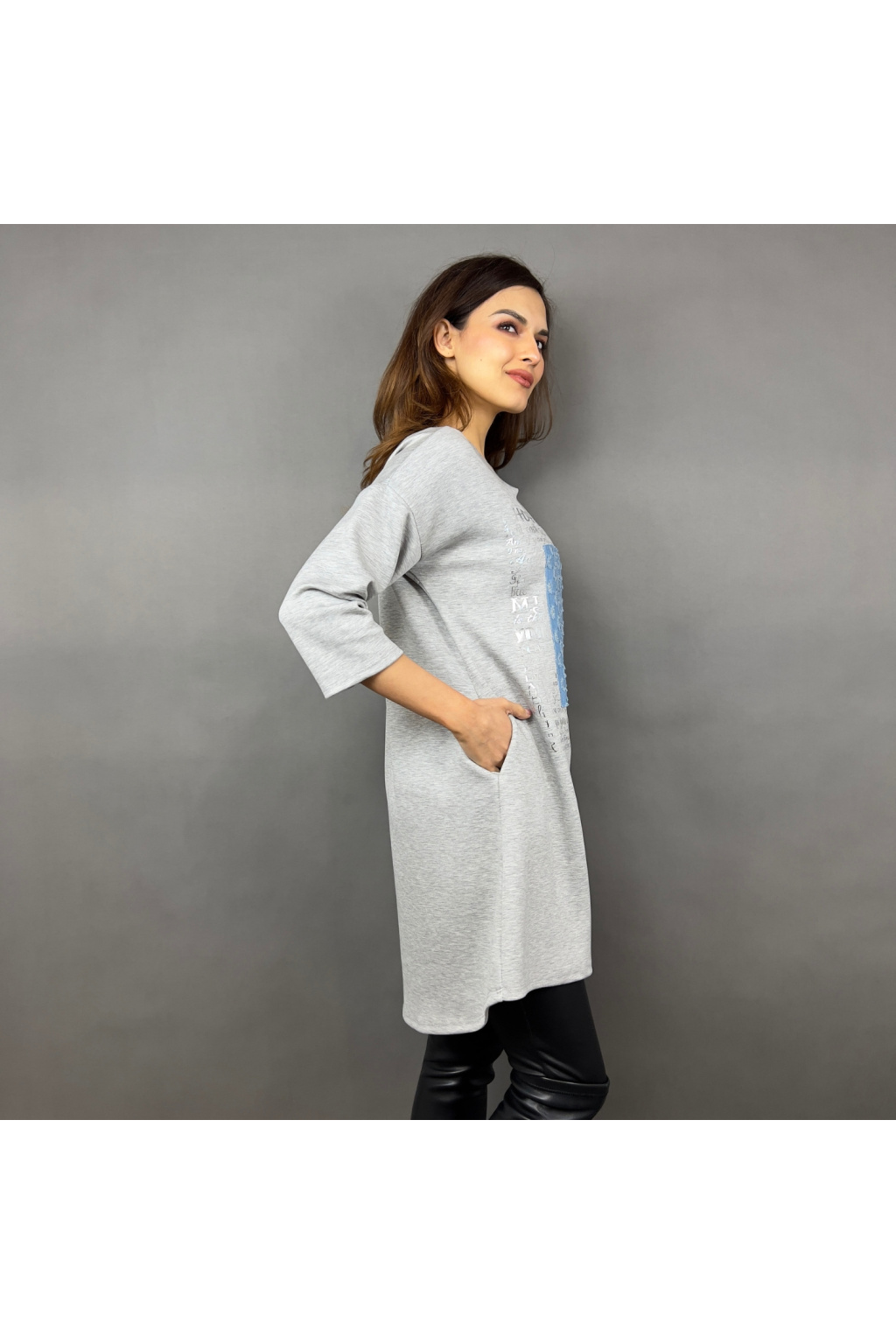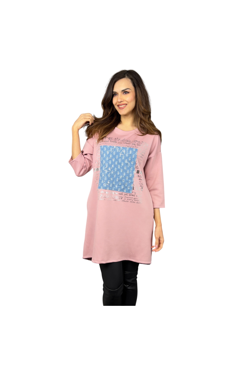 Mikinové šaty Defne spojují volný, moderní střih s ležérní elegancí. Díky dropshoulder rukávům a prodloužené délce jsou skvělou volbou pro ženy, které hledají pohodlí bez kompromisů ve stylu. Šaty zdobí originální potisk s denimovým efektem a třpytivými detaily, které dodávají celkovému vzhledu jedinečnost. Praktické boční kapsy zajišťují ještě větší komfort při nošení.