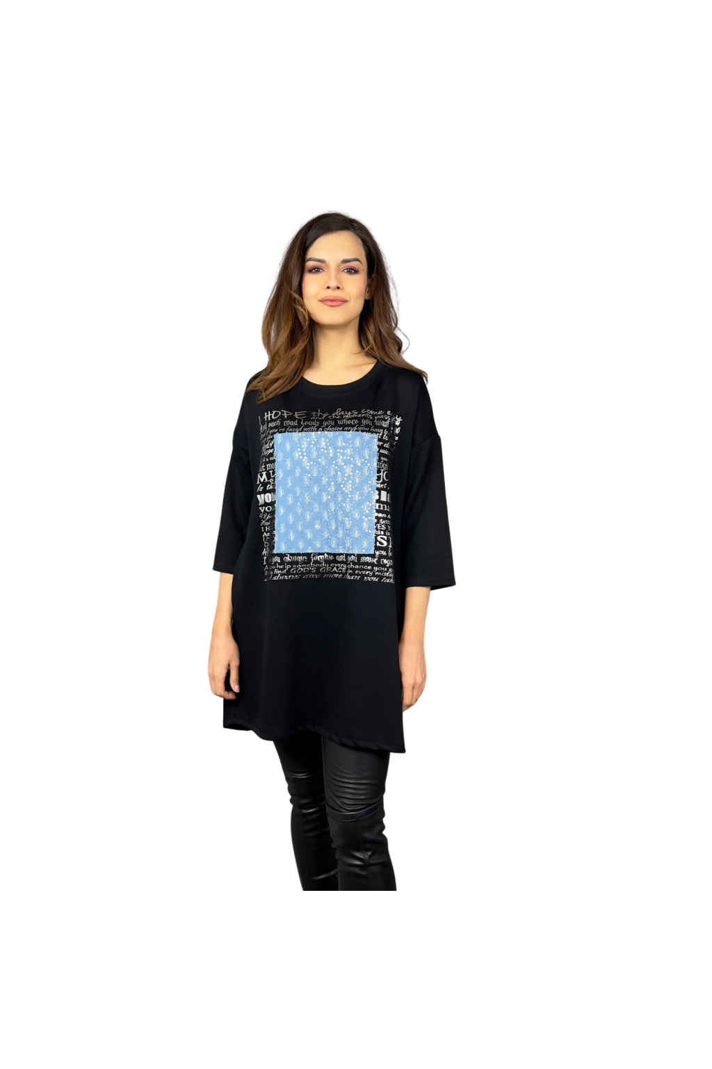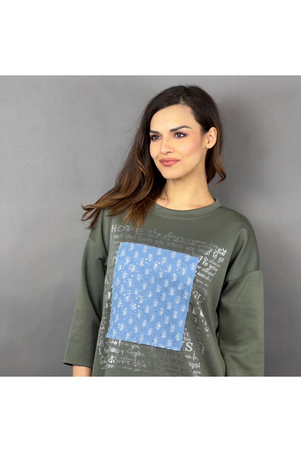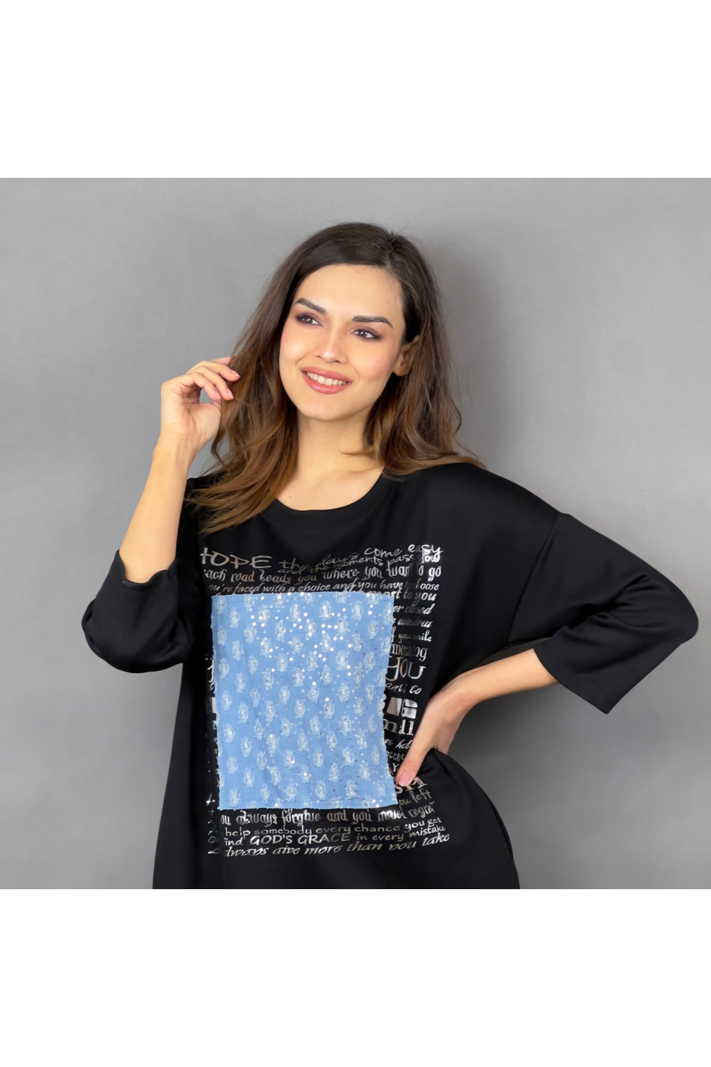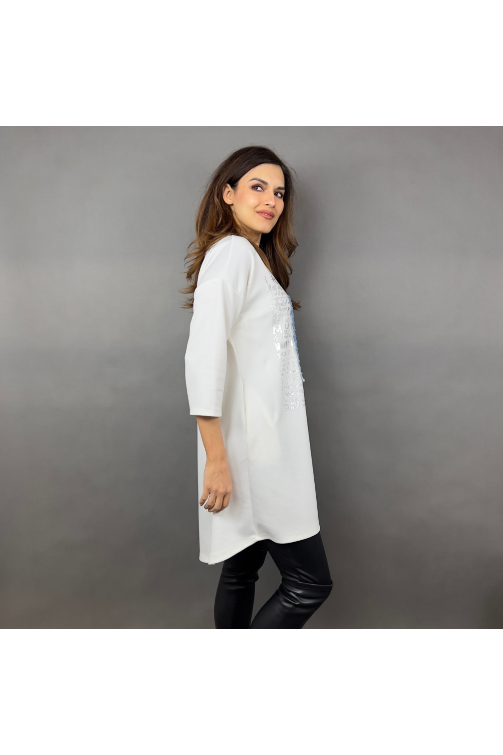 Mikinové šaty Defne spojují volný, moderní střih s ležérní elegancí. Díky dropshoulder rukávům a prodloužené délce jsou skvělou volbou pro ženy, které hledají pohodlí bez kompromisů ve stylu. Šaty zdobí originální potisk s denimovým efektem a třpytivými detaily, které dodávají celkovému vzhledu jedinečnost. Praktické boční kapsy zajišťují ještě větší komfort při nošení.