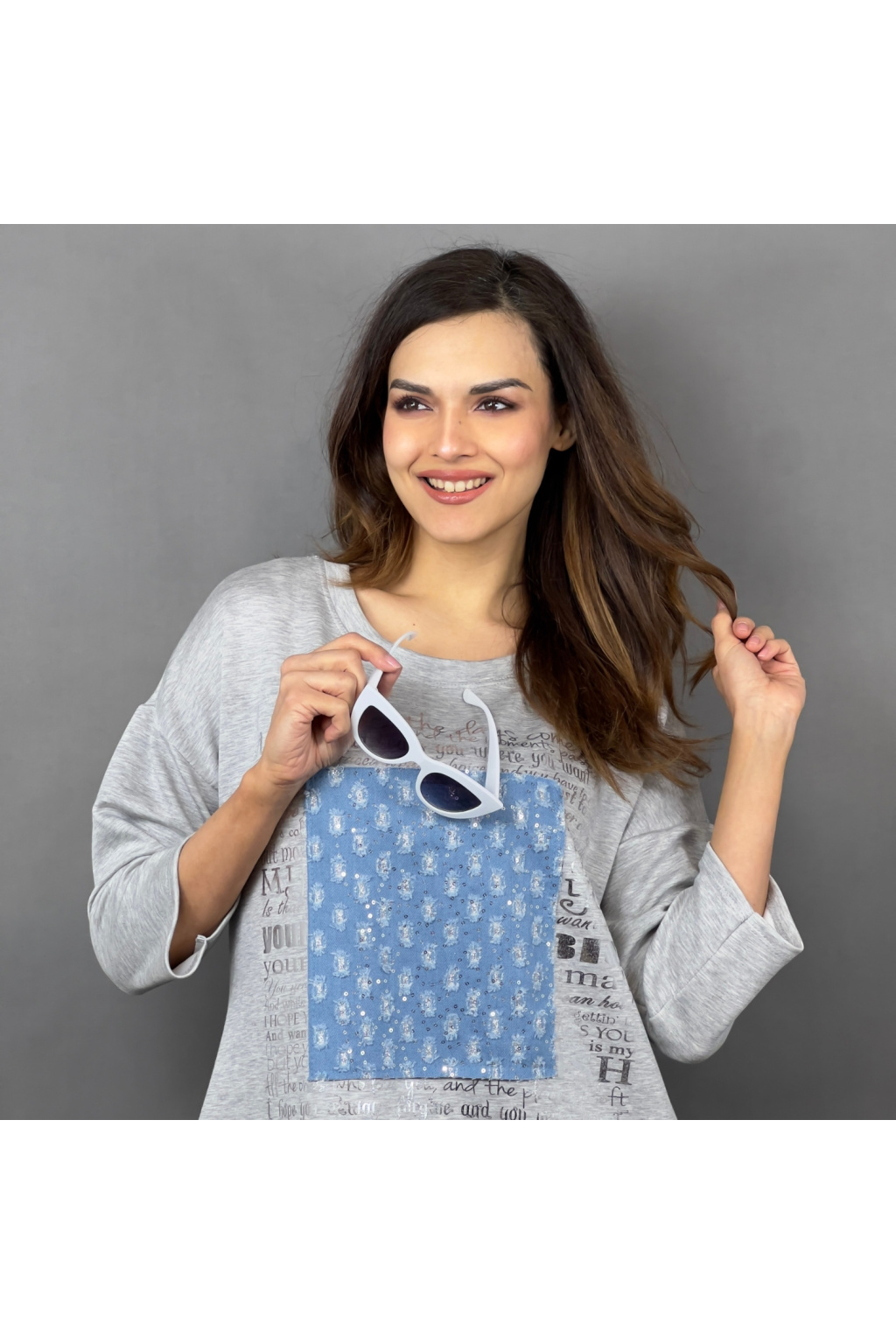 - Originální potisk s denimovým efektem a třpytkami