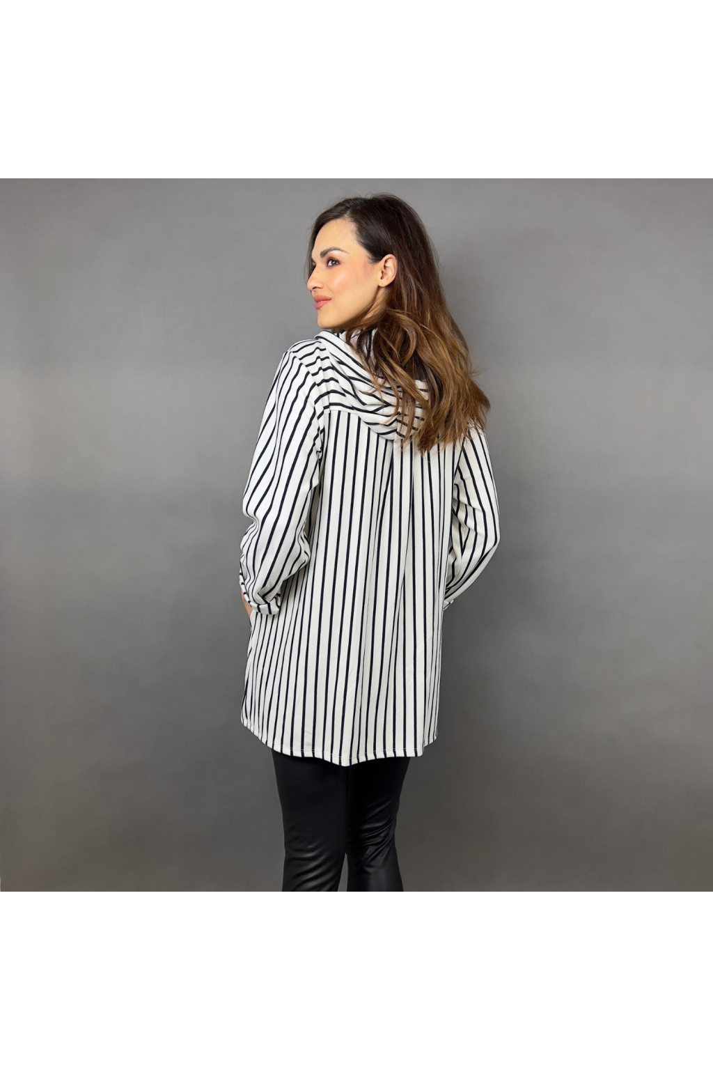 Mikina Alara je dokonalým spojením elegance a pohodlí. Díky svému prodlouženému střihu a volnému designu působí ležérně, ale zároveň moderně. Kombinace černobílého pruhovaného vzoru dodává mikině nadčasový vzhled, který snadno zkombinujete s různými outfity. Kapuce s šňůrkami a praktické kapsy dodávají tomuto modelu praktické využití na každodenní nošení.