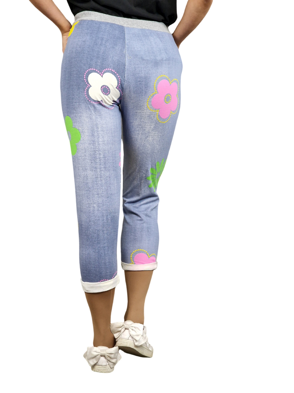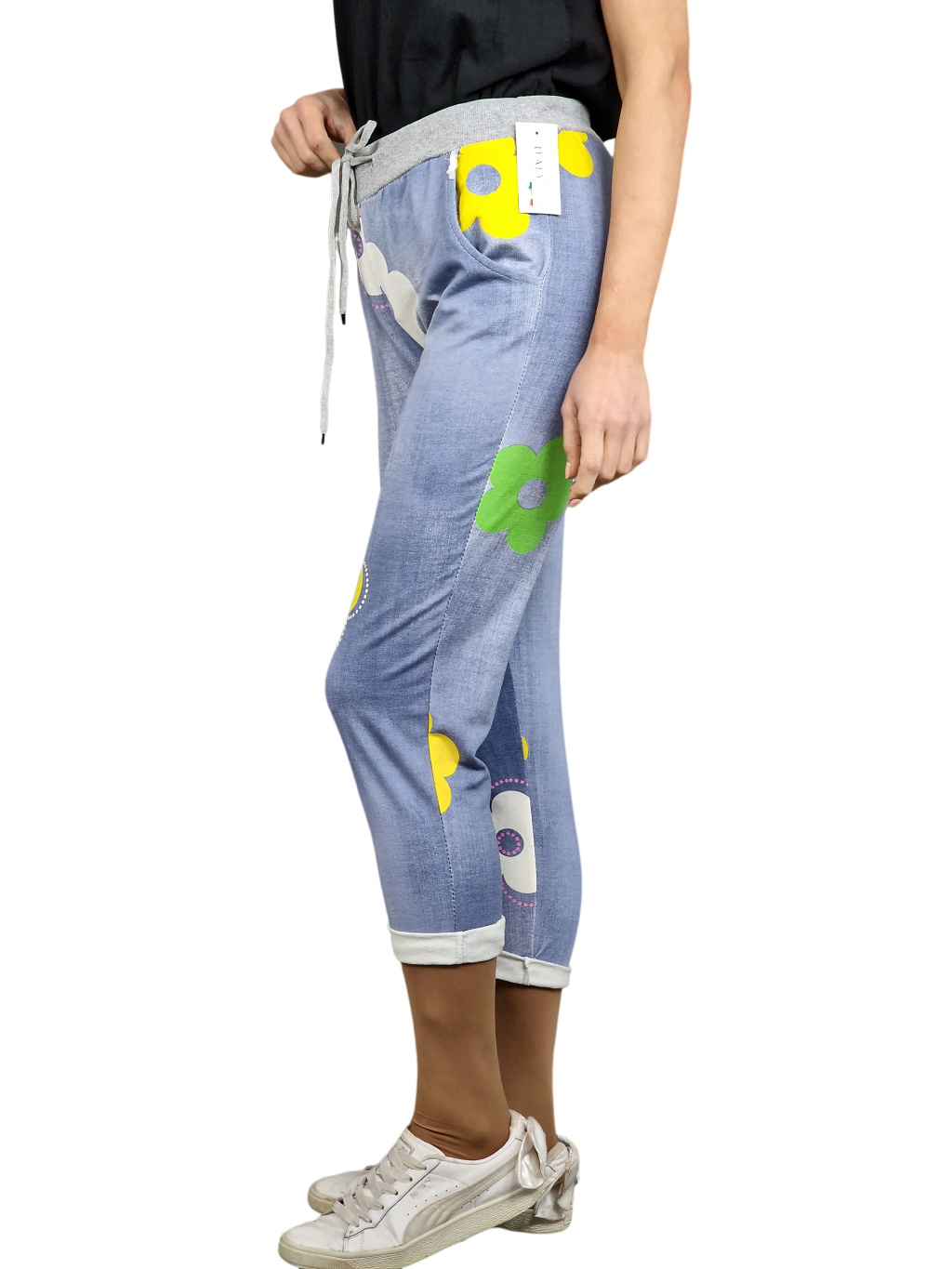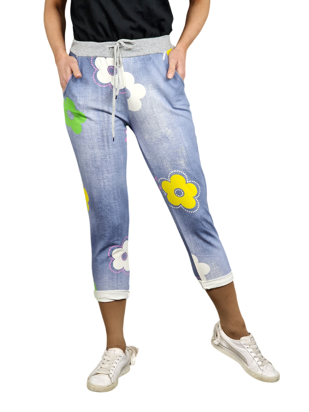 Dámské tepláky Percy v džínové barvě s květinovým potiskem. Mají kapsy, šedý lem a tkanici v pase ke stahování.