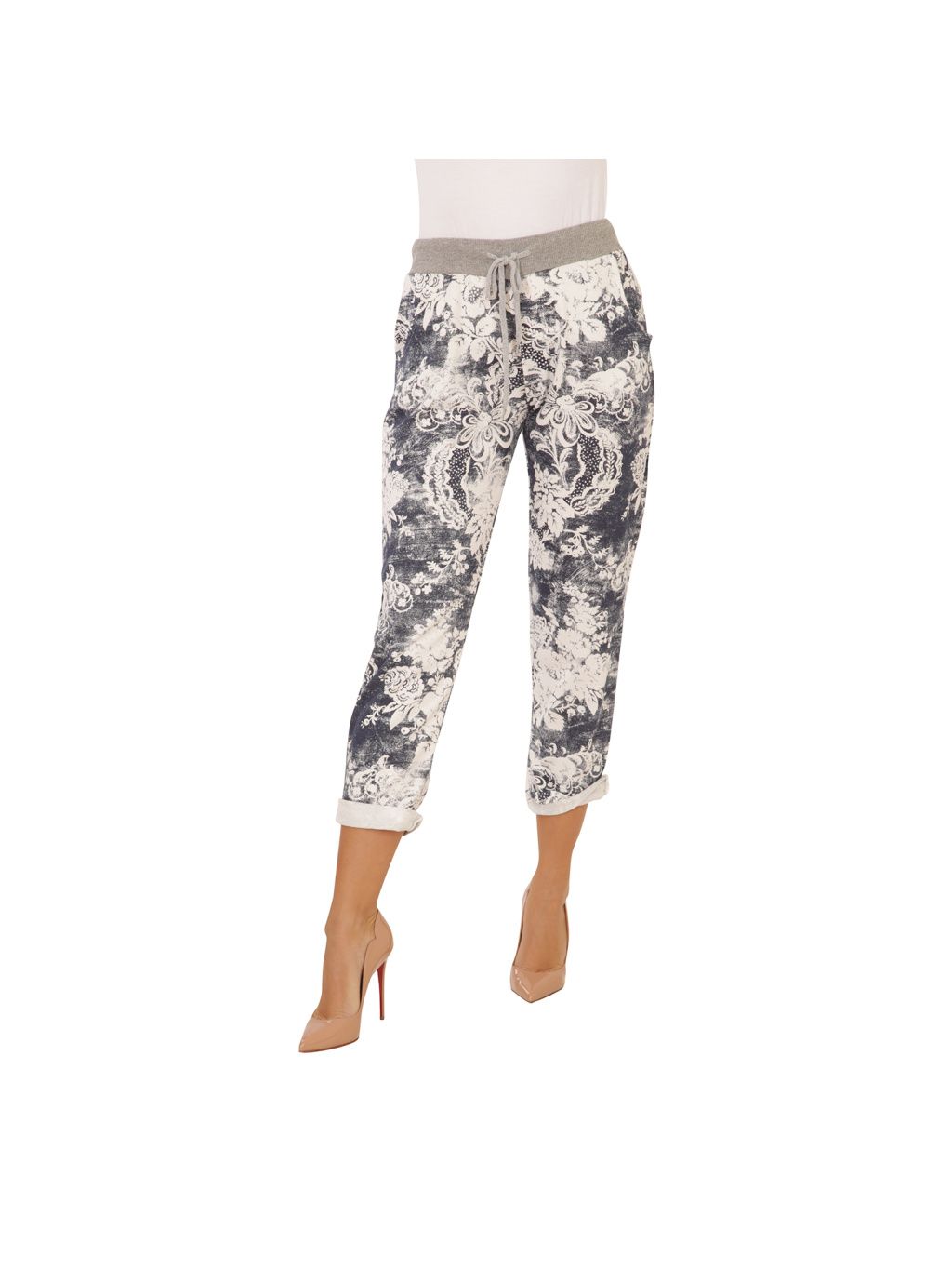 Dámské krásné tepláky s potiskem bílých květů. Tepláky jsou v 7/8 délce s bočními kapsami. Jsou z velice příjemného, elastického a bavlněného materiálu, krásně sedí. Vhodné na doma, ven i na sport. V pase tkanička k stažení.