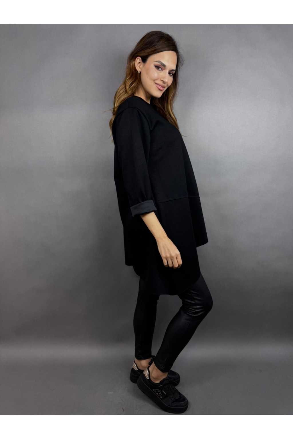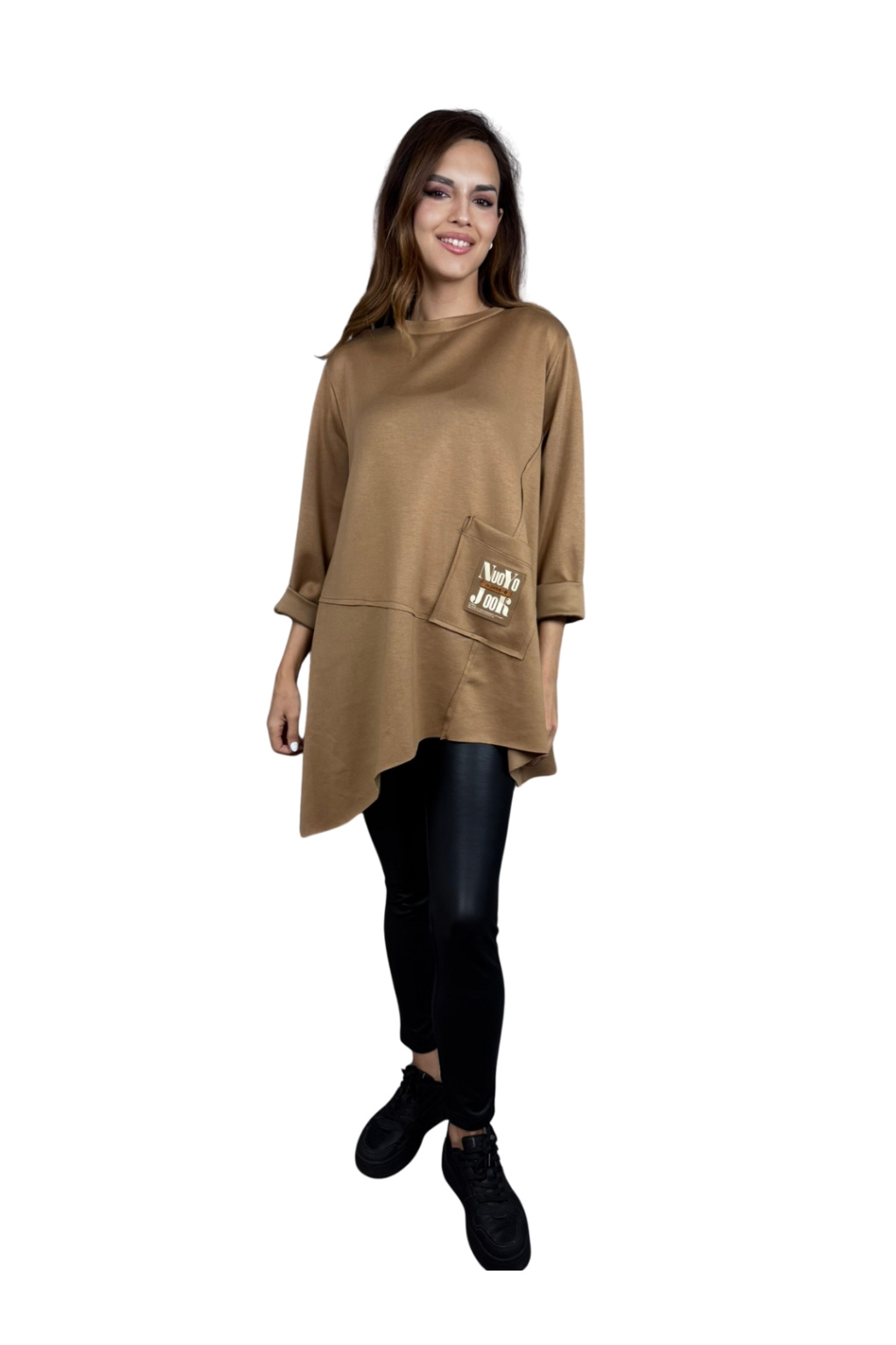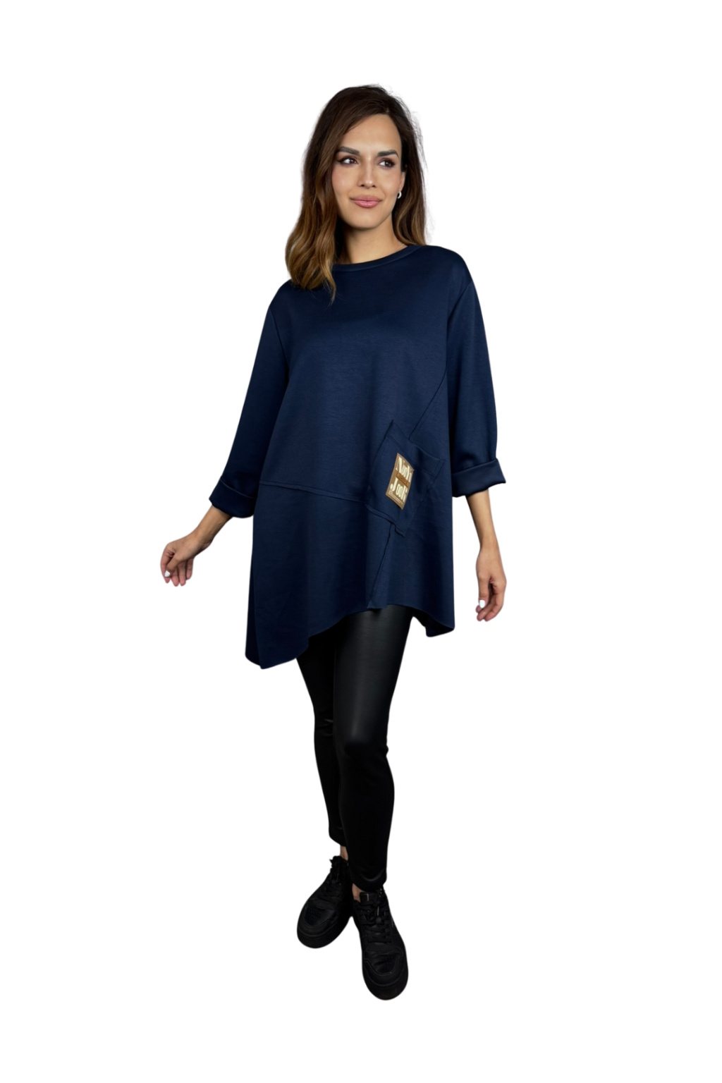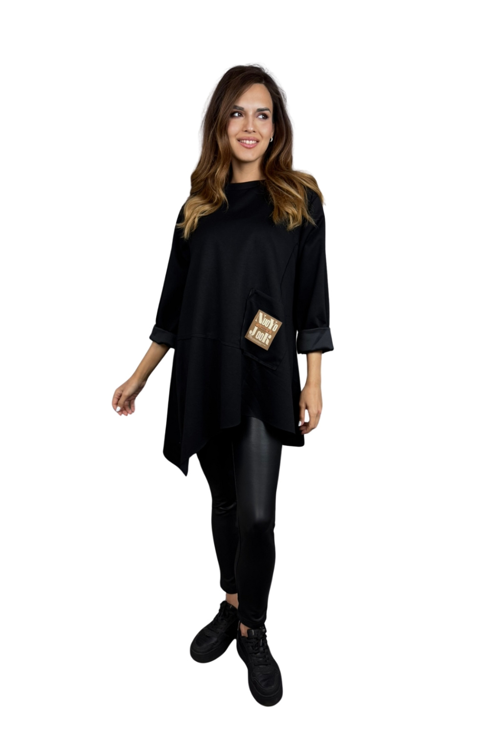 Přední kapsa s dekorativní nášivkou dodává tunice moderní nádech, zatímco 3/4 rukávy s možností ohrnutí zajišťují univerzální využití. Lze ji nosit k legínám, džínům i úzké sukni – vždy vytvoří elegantní a ležérní outfit.