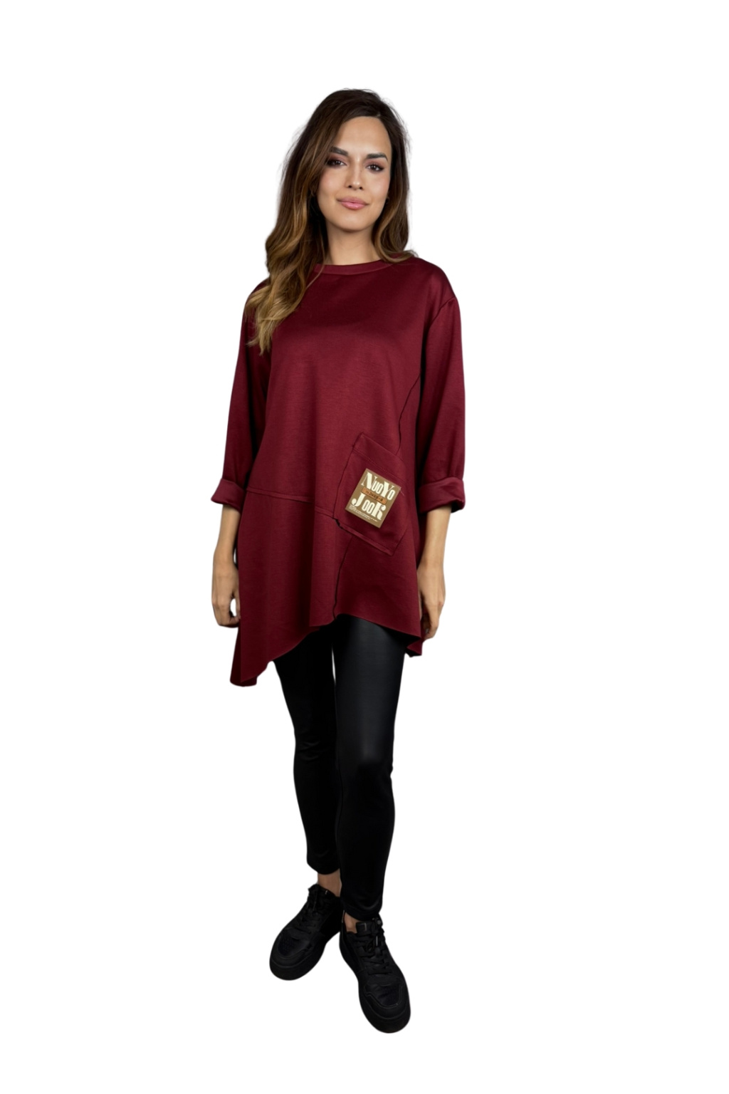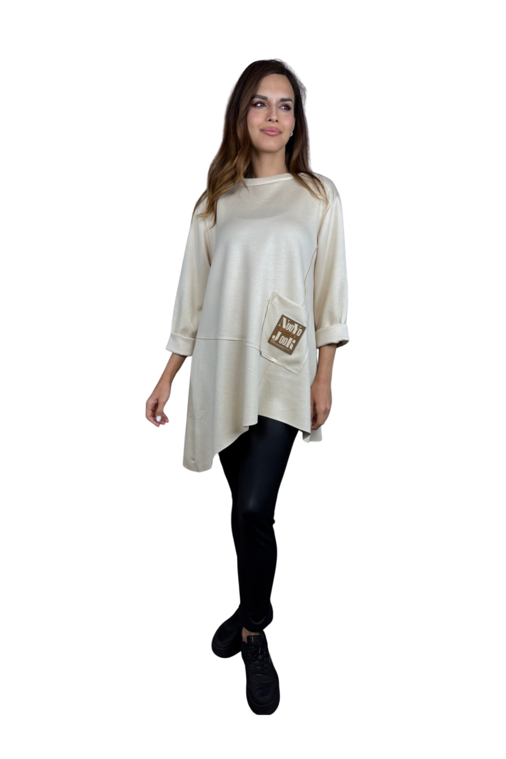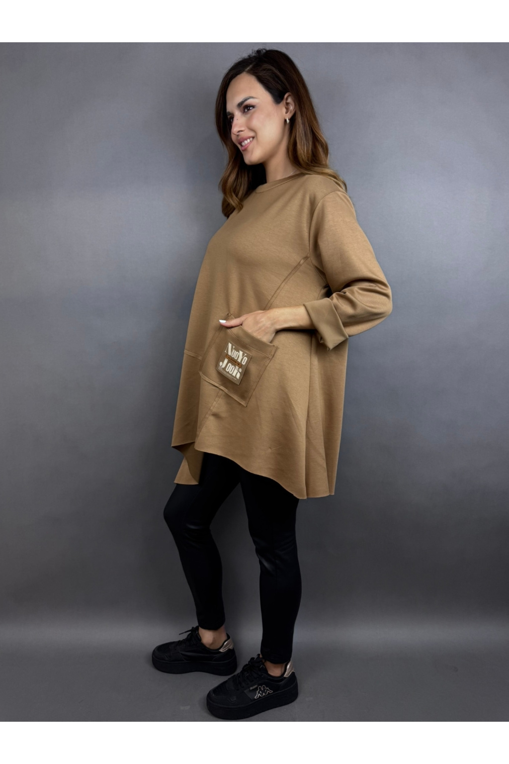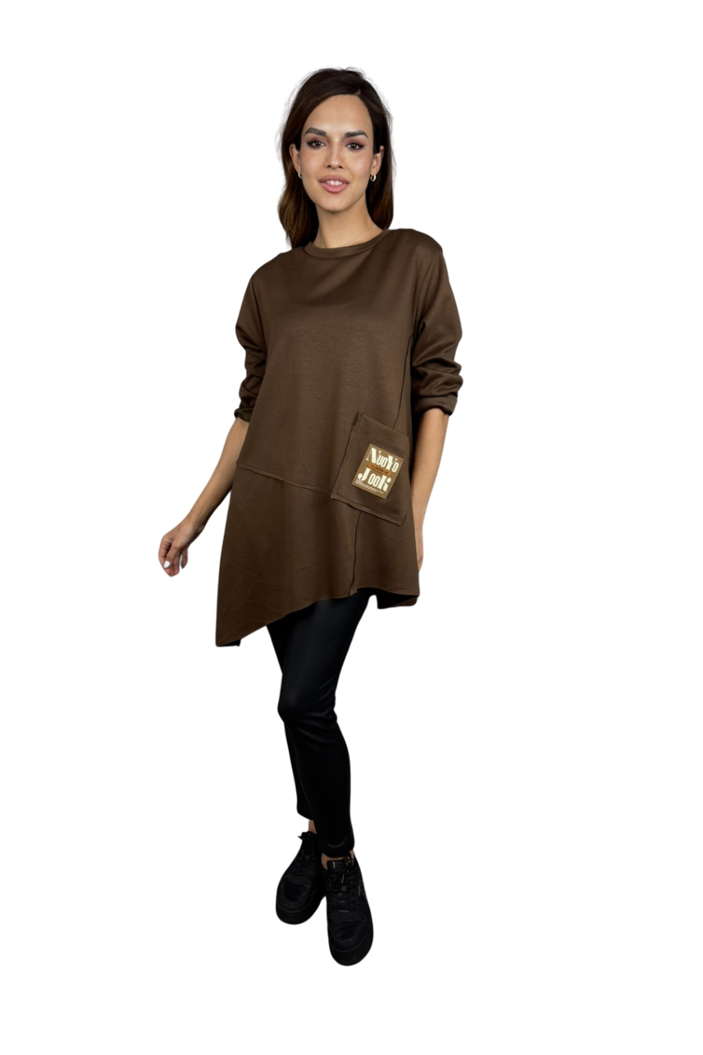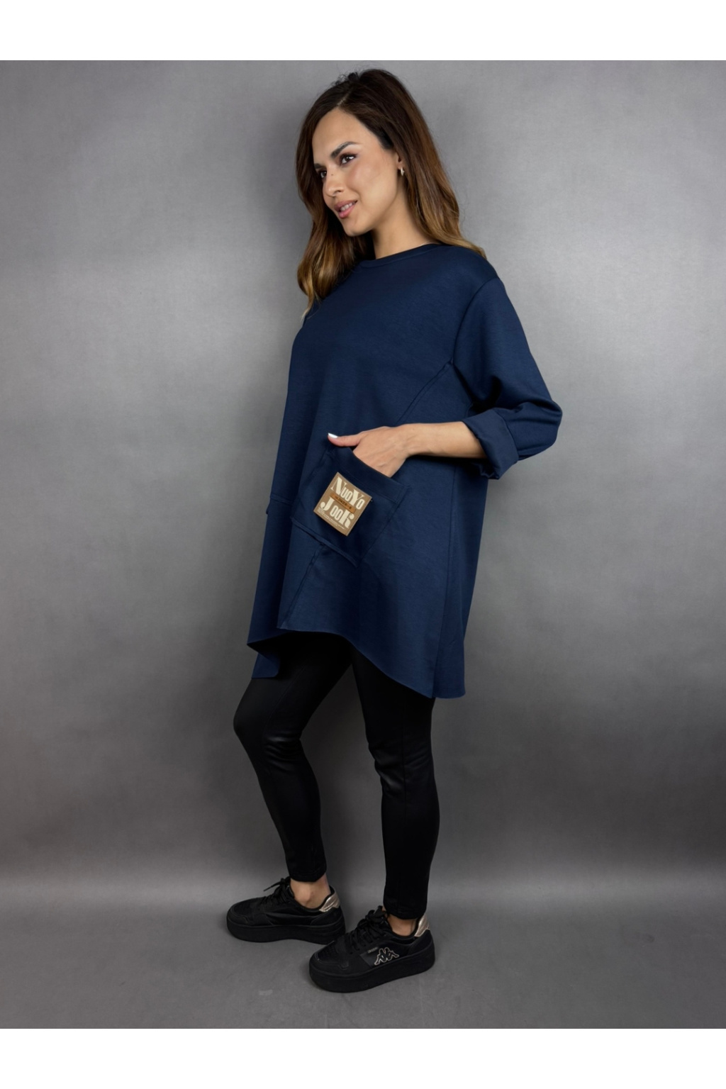 Přední kapsa s dekorativní nášivkou dodává tunice moderní nádech, zatímco 3/4 rukávy s možností ohrnutí zajišťují univerzální využití. Lze ji nosit k legínám, džínům i úzké sukni – vždy vytvoří elegantní a ležérní outfit.