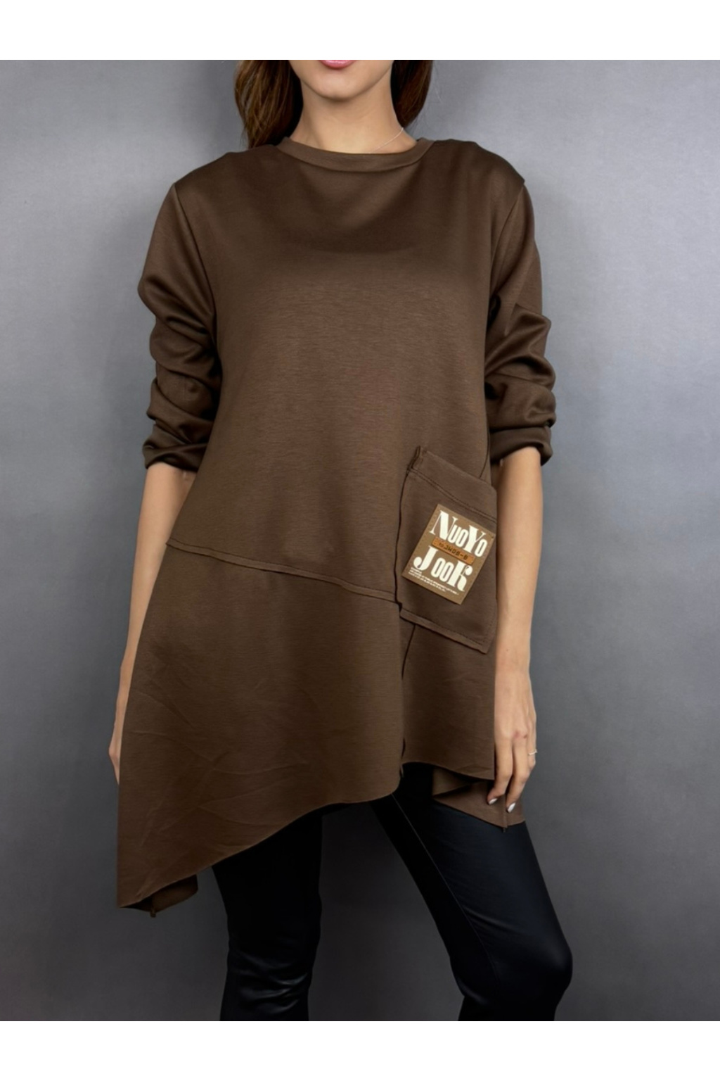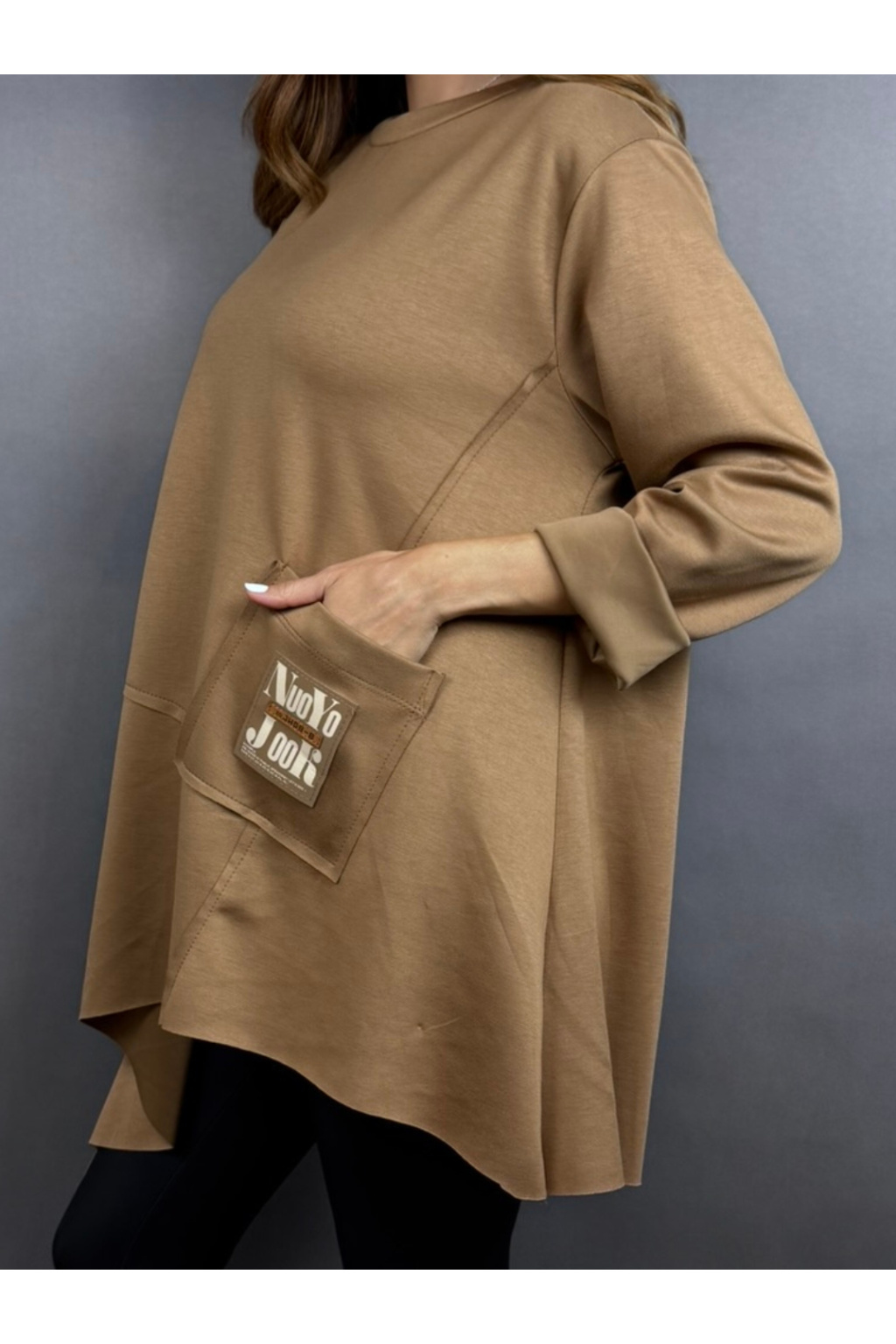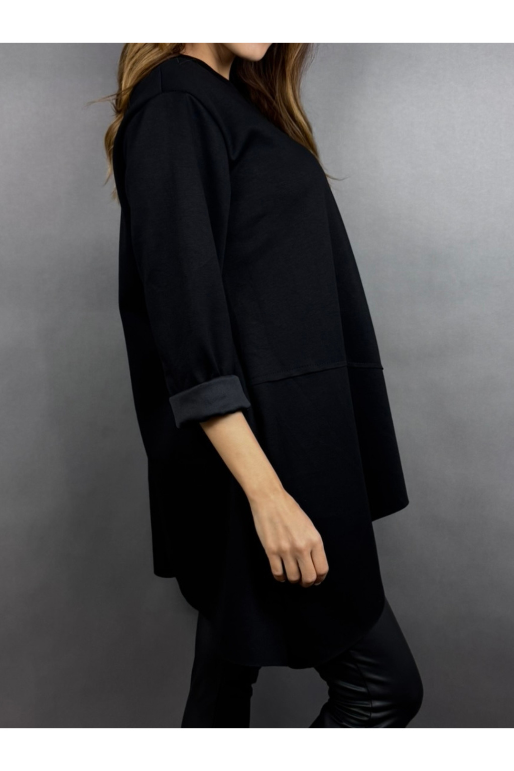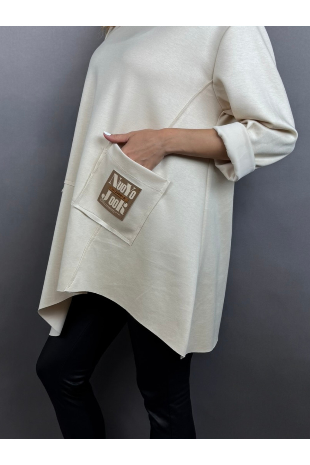 Přední kapsa s dekorativní nášivkou dodává tunice moderní nádech, zatímco 3/4 rukávy s možností ohrnutí zajišťují univerzální využití. Lze ji nosit k legínám, džínům i úzké sukni – vždy vytvoří elegantní a ležérní outfit.
