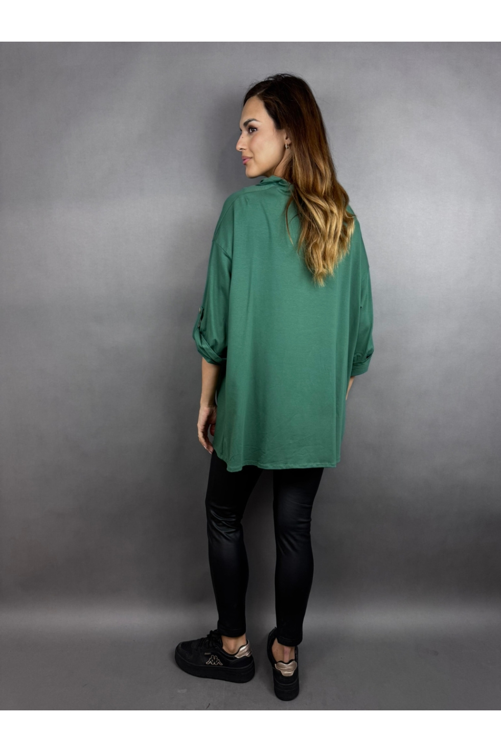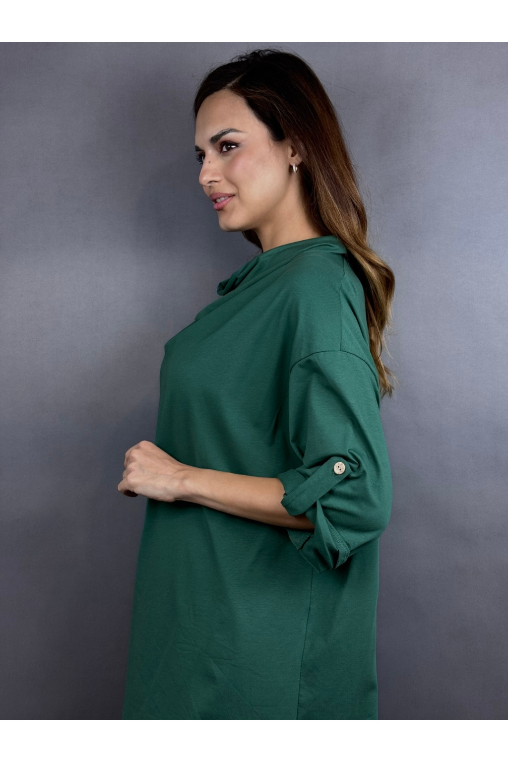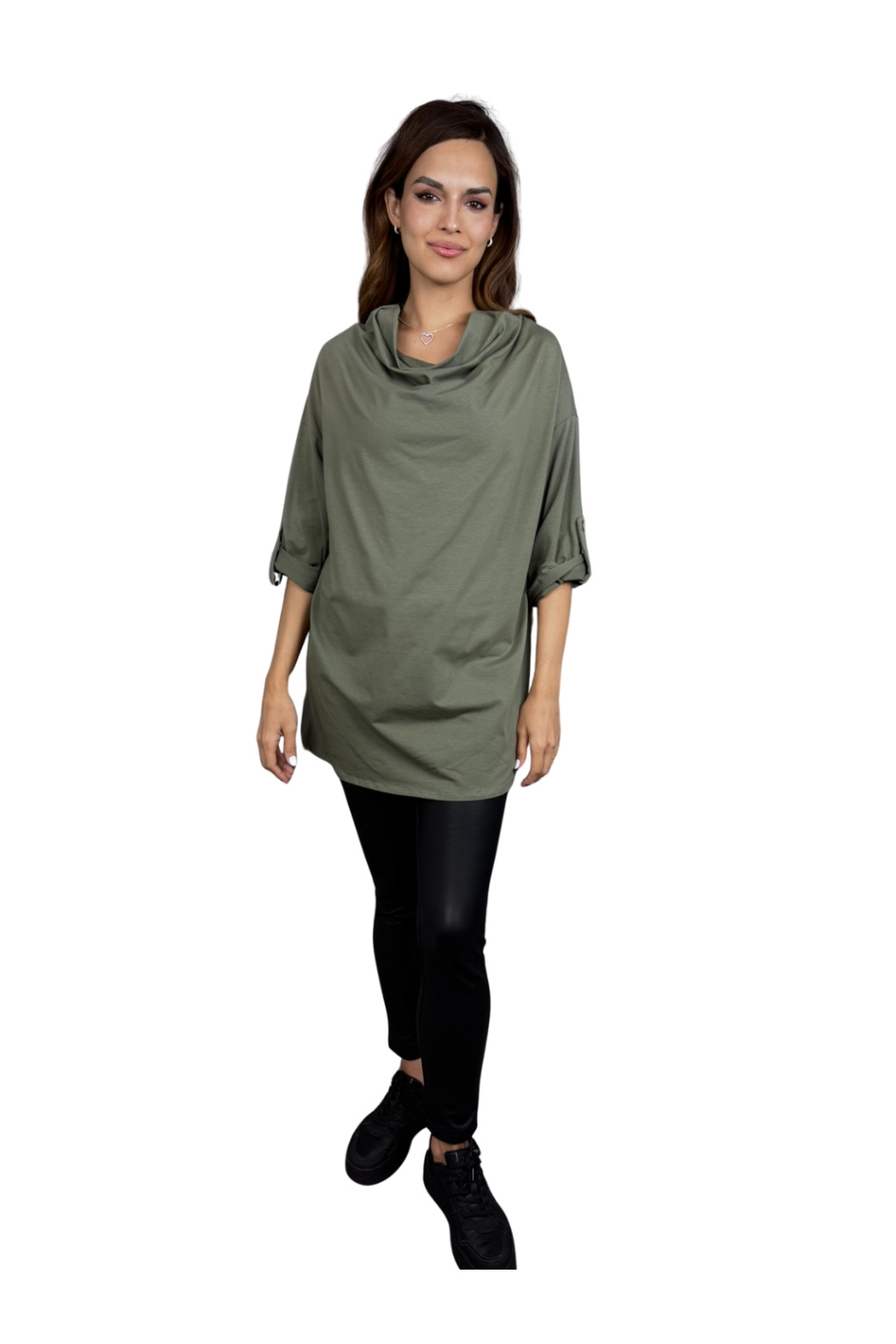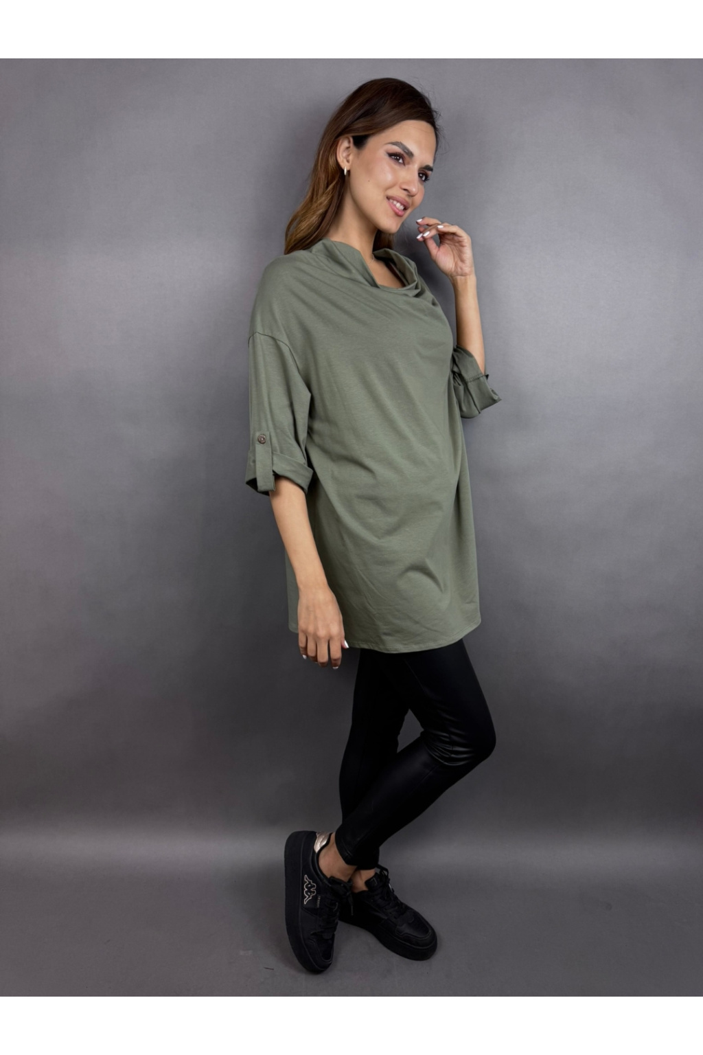 Stojáčkový límec s ležérním spadem dodává tunice moderní charakter, zatímco dlouhé rukávy s možností ohrnutí zvyšují praktičnost. Perfektně se hodí k legínám, úzkým džínám nebo koženým kalhotám.